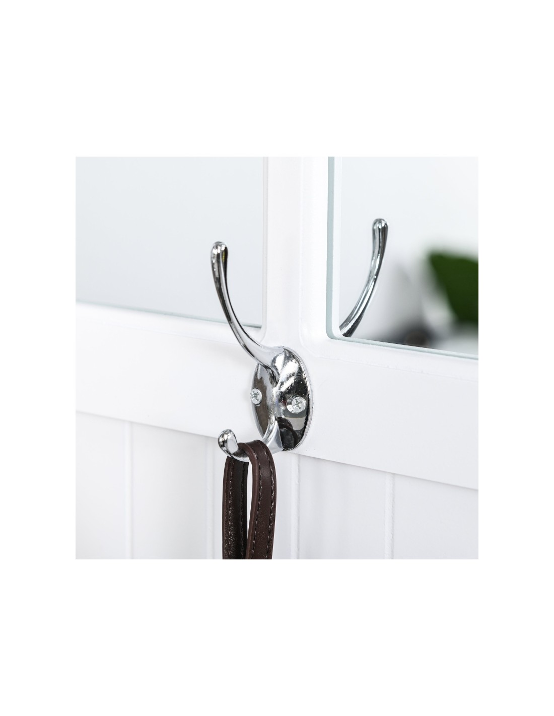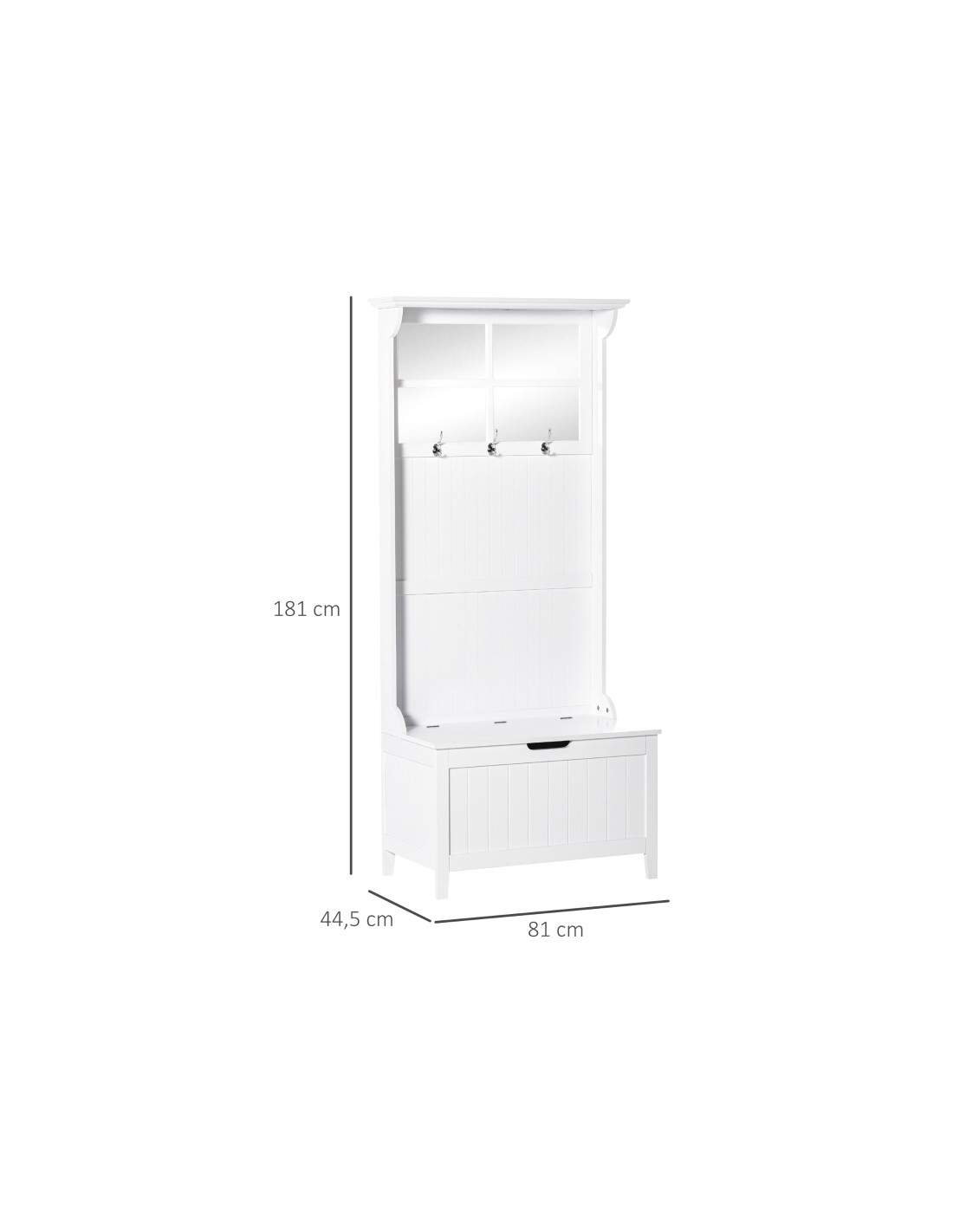 Garderobe med bænk og knager. Garderoben er udført i møbelplade og MDF og måler 81 x 44,5 cm i bredde og dybde og 181 cm i højden.