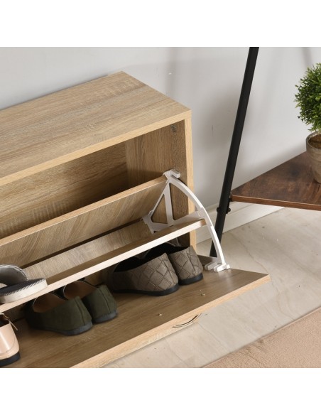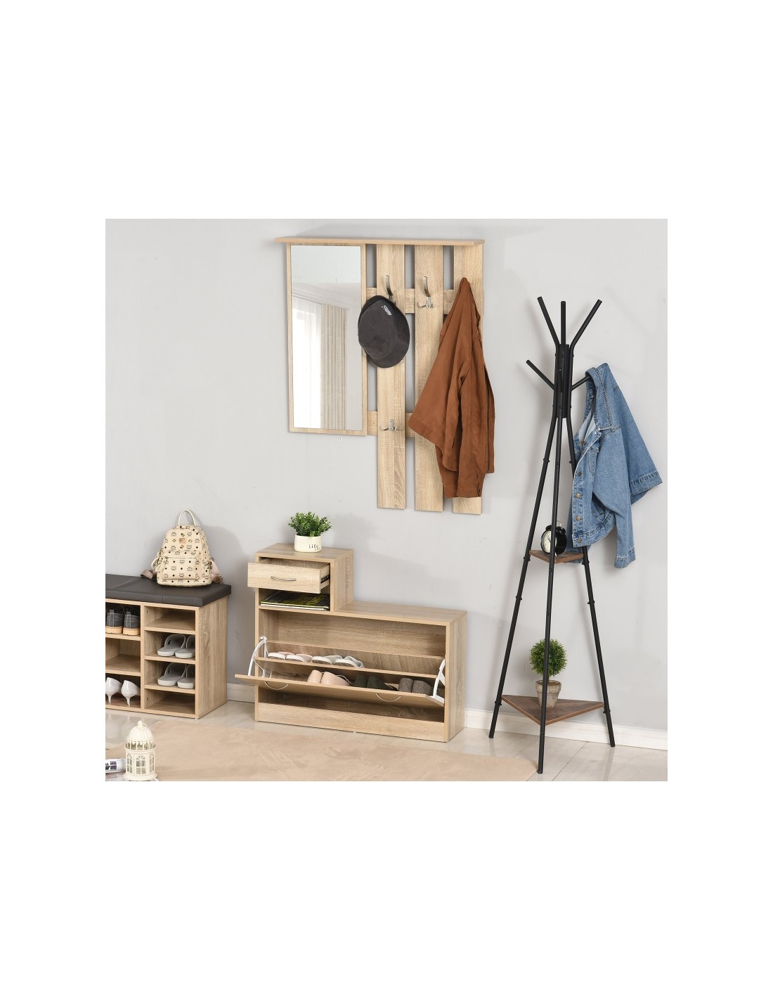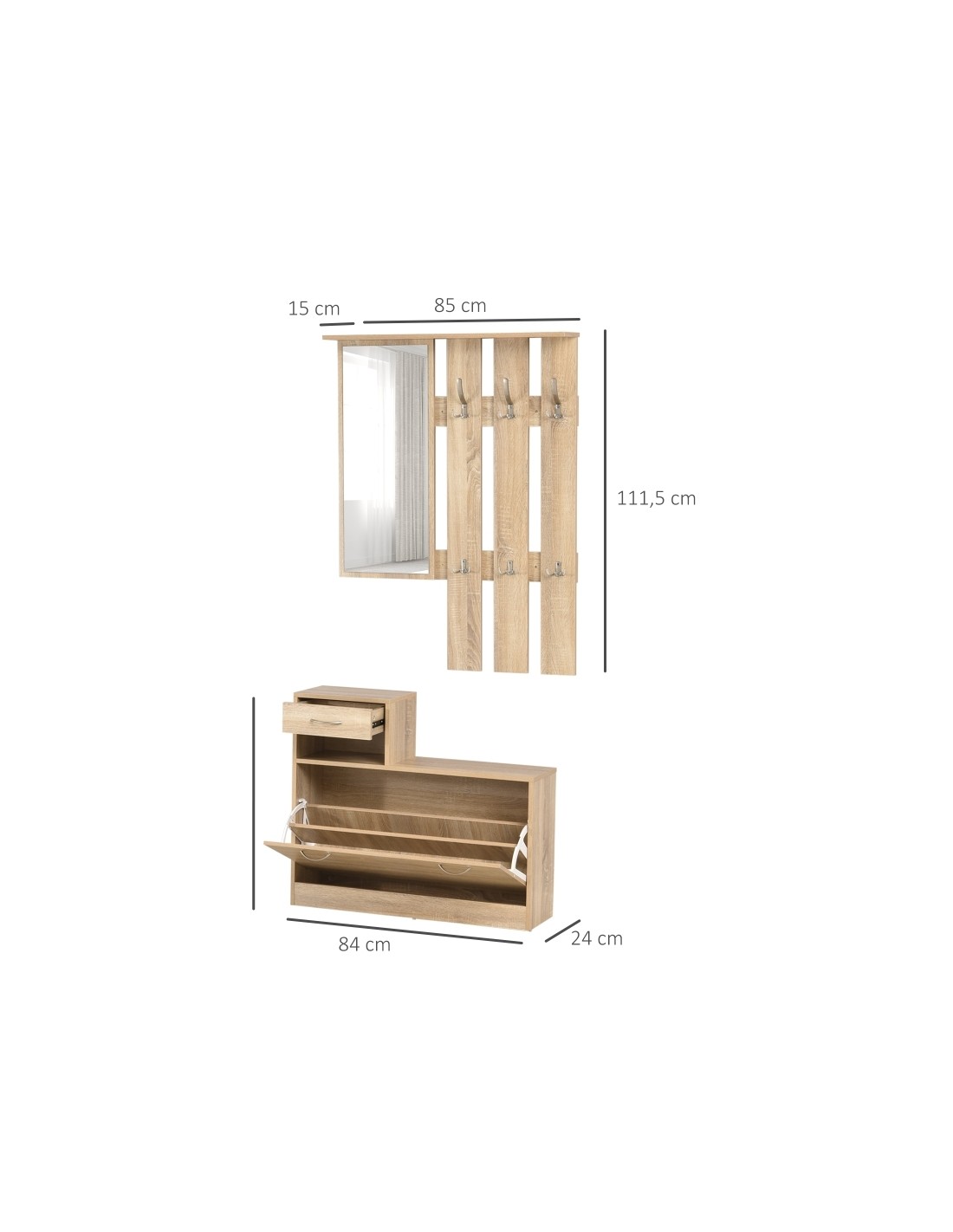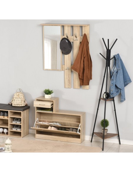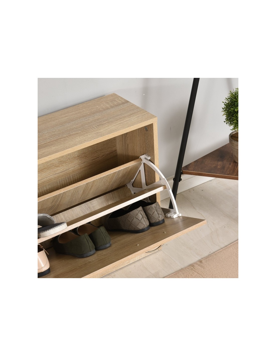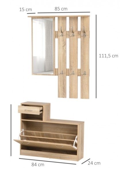 Garderobe med skoskab, bænk, hylderum og knager. Garderoben er udført i møbelplade og måler 84 x 24 cm i bredde og dybde og 75,5 + 111,5 cm i højden.