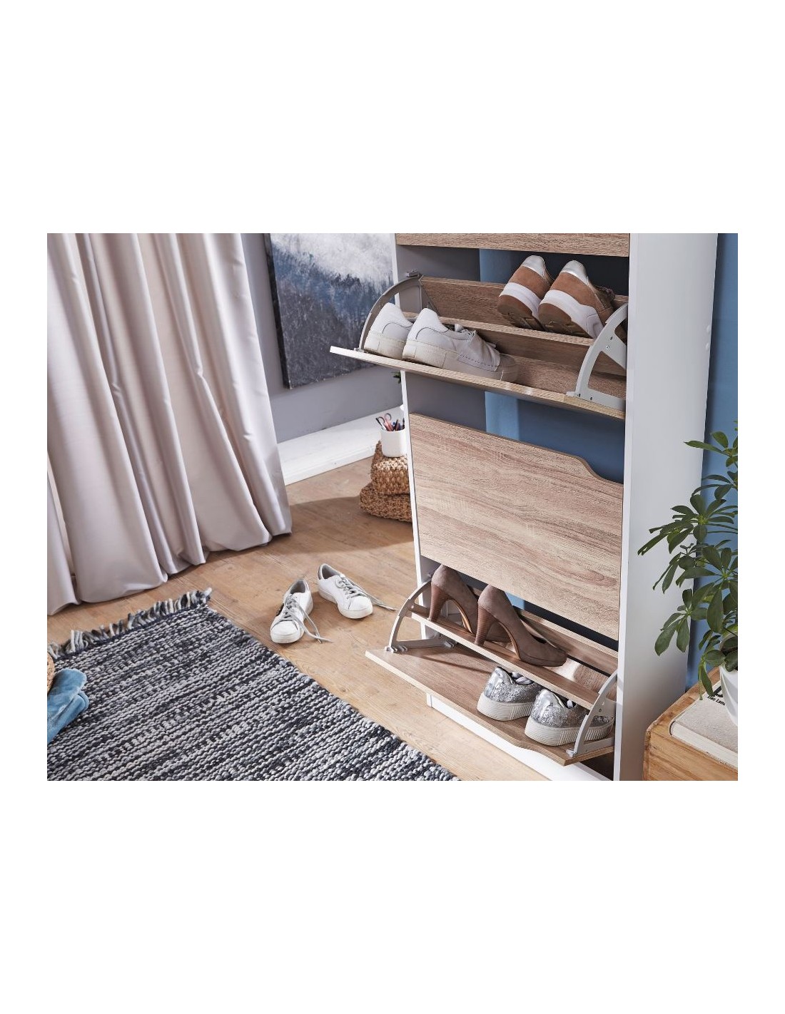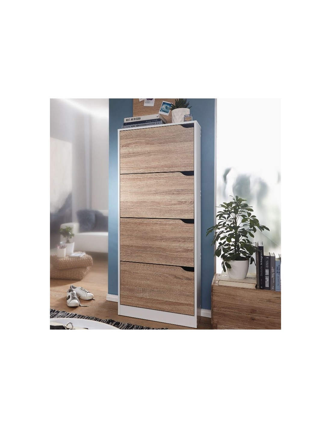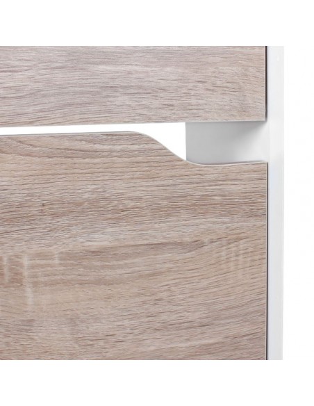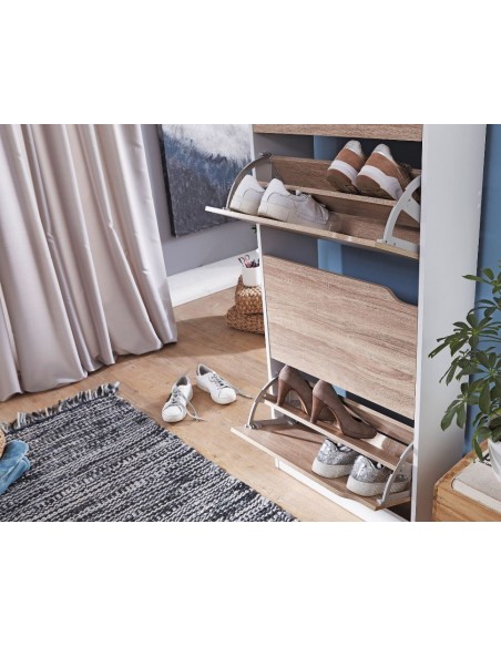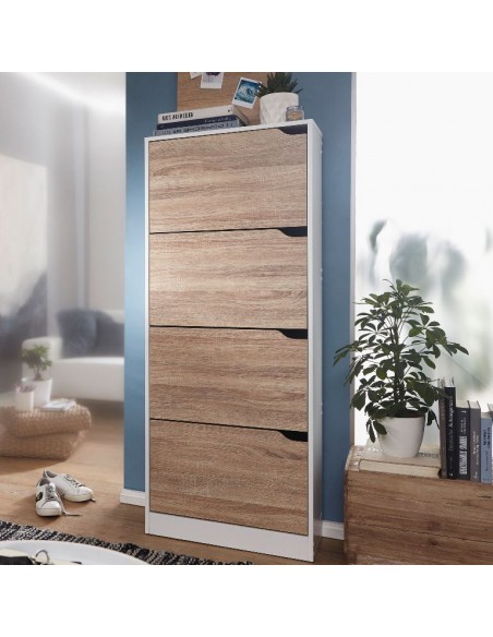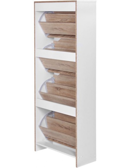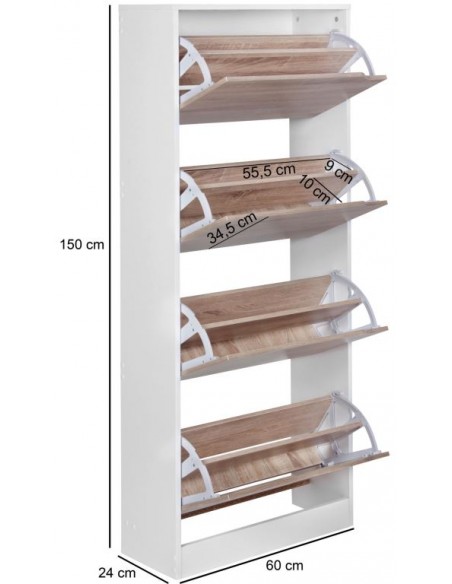 Skoskab fremstillet i et design af hvid og sonoma egetræsfarvet møbelplade. Skoskabet måler 150 cm i højden og 60 x 24 cm i bredde og dybde.
