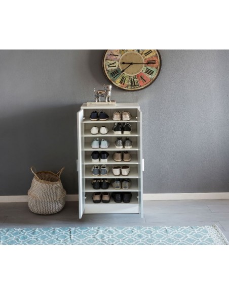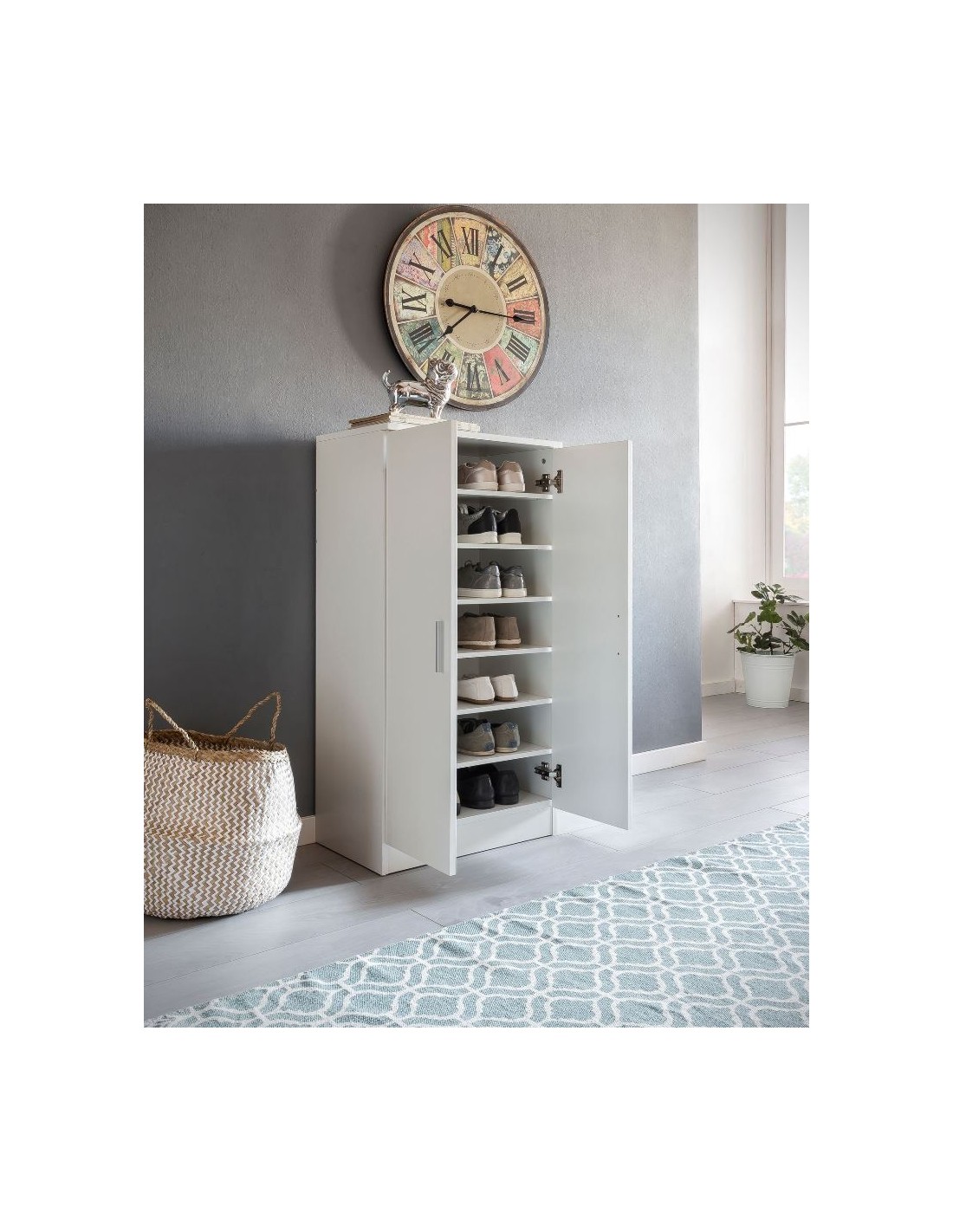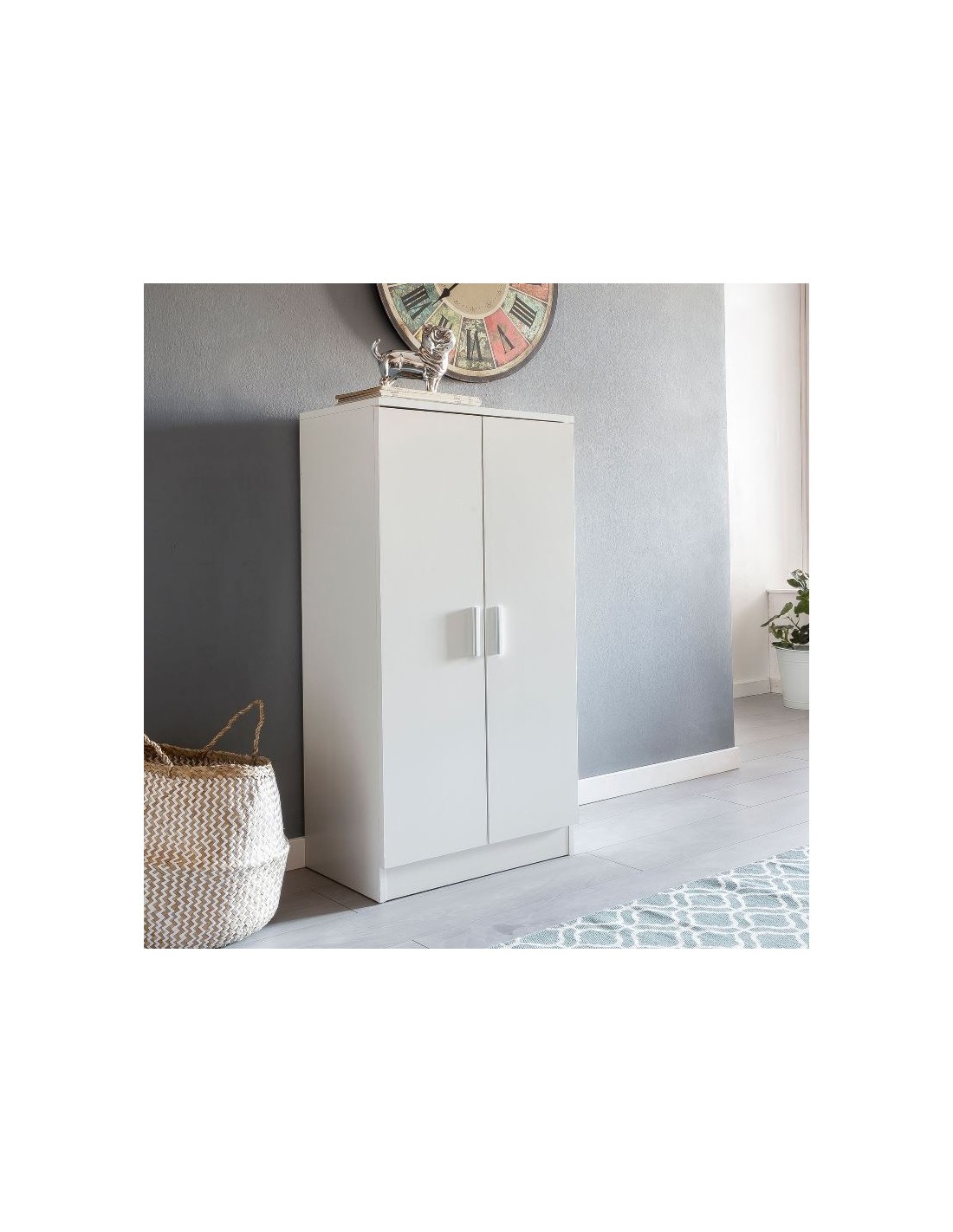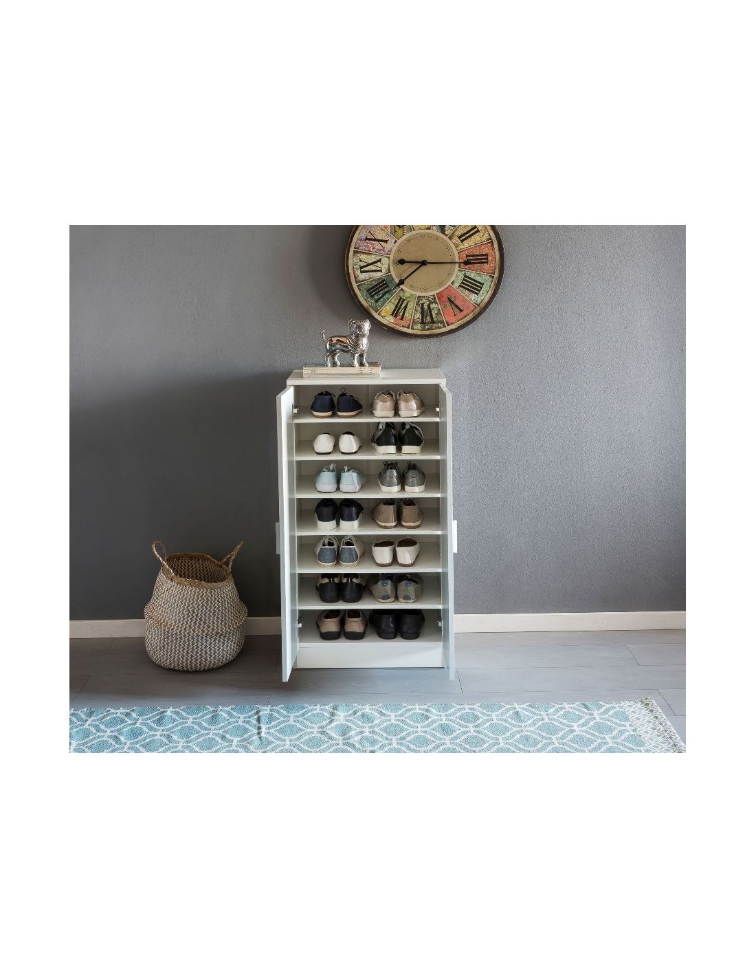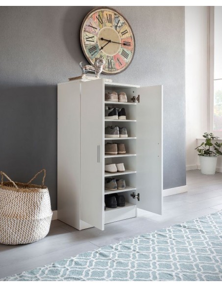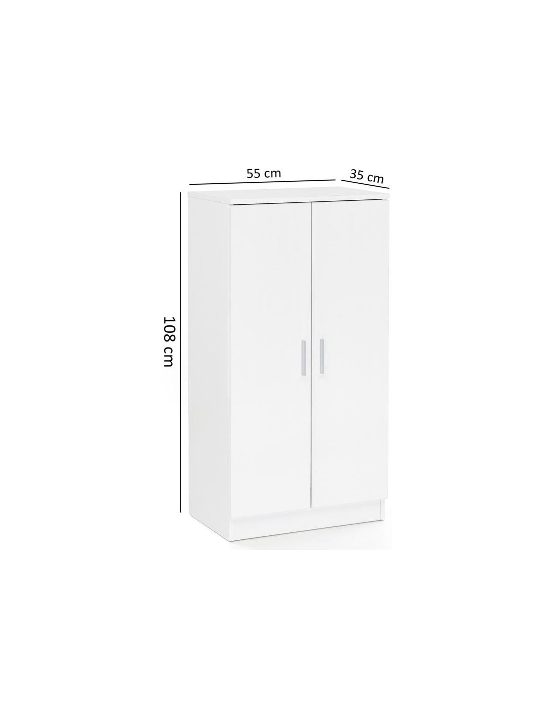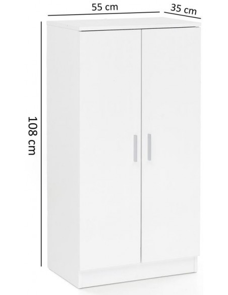 Skoskab fremstillet i et design af hvid møbelplade. Skoskabet måler 108 cm i højden og 55 x 35 cm i bredde og dybde.