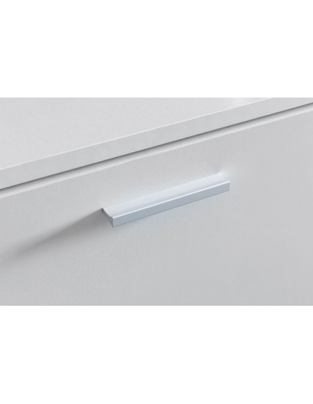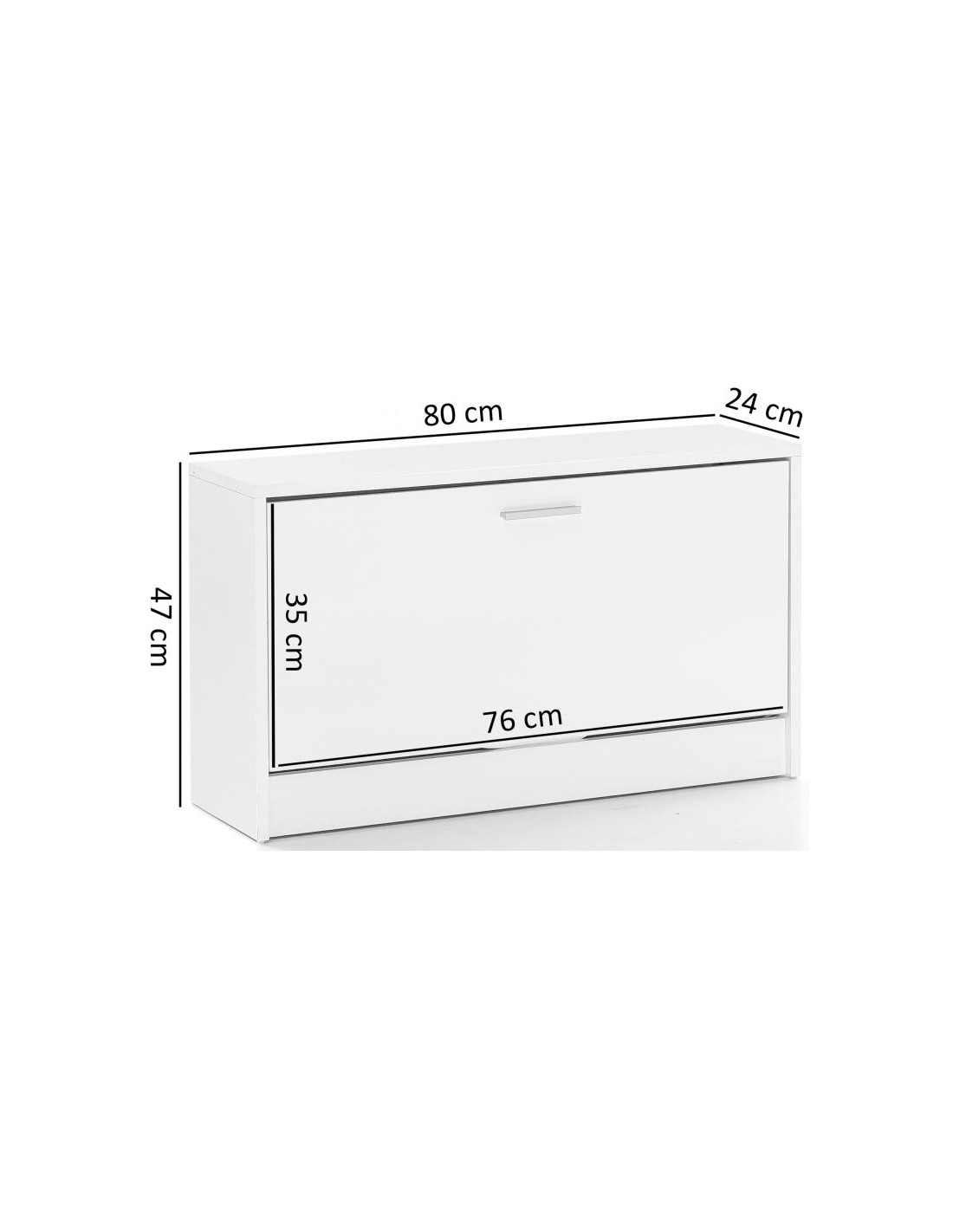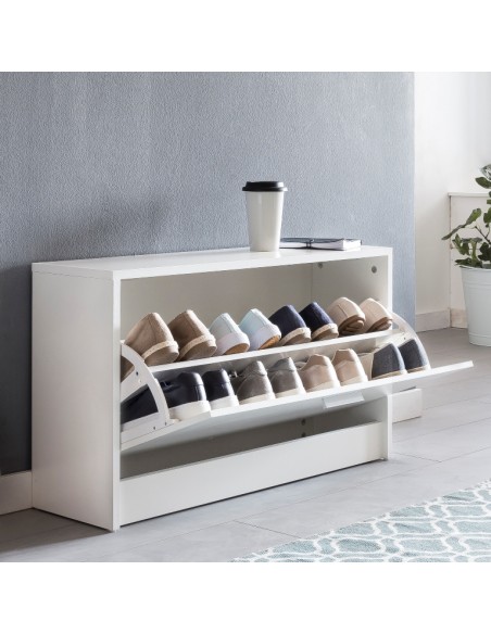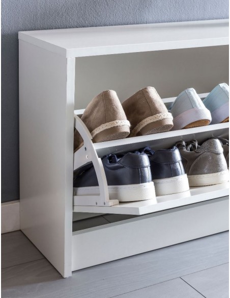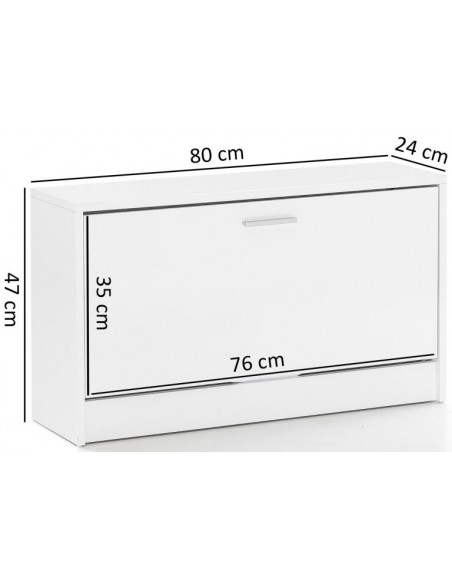 Skoskab fremstillet i et design af hvid møbelplade. Skoskabet måler 47 cm i højden og 80 x 24 cm i bredde og dybde.