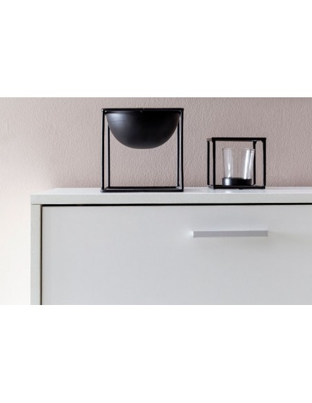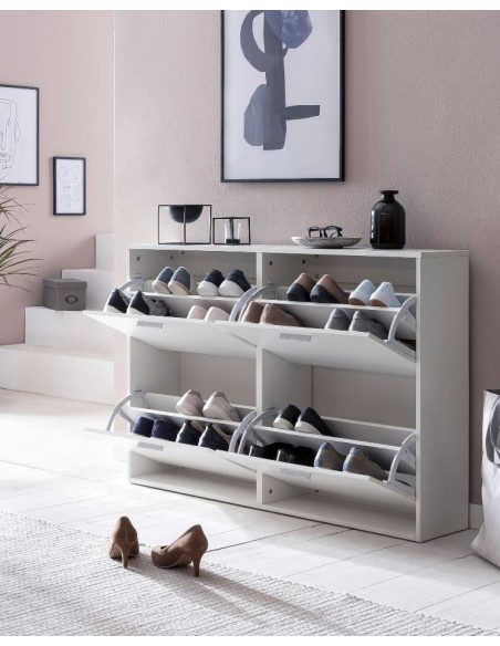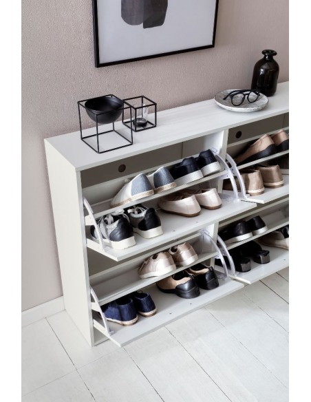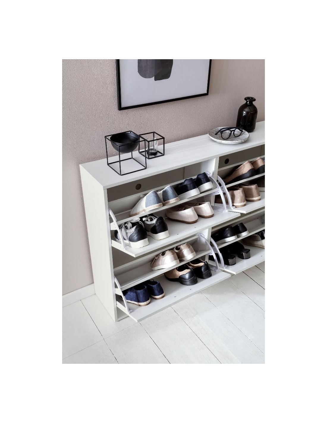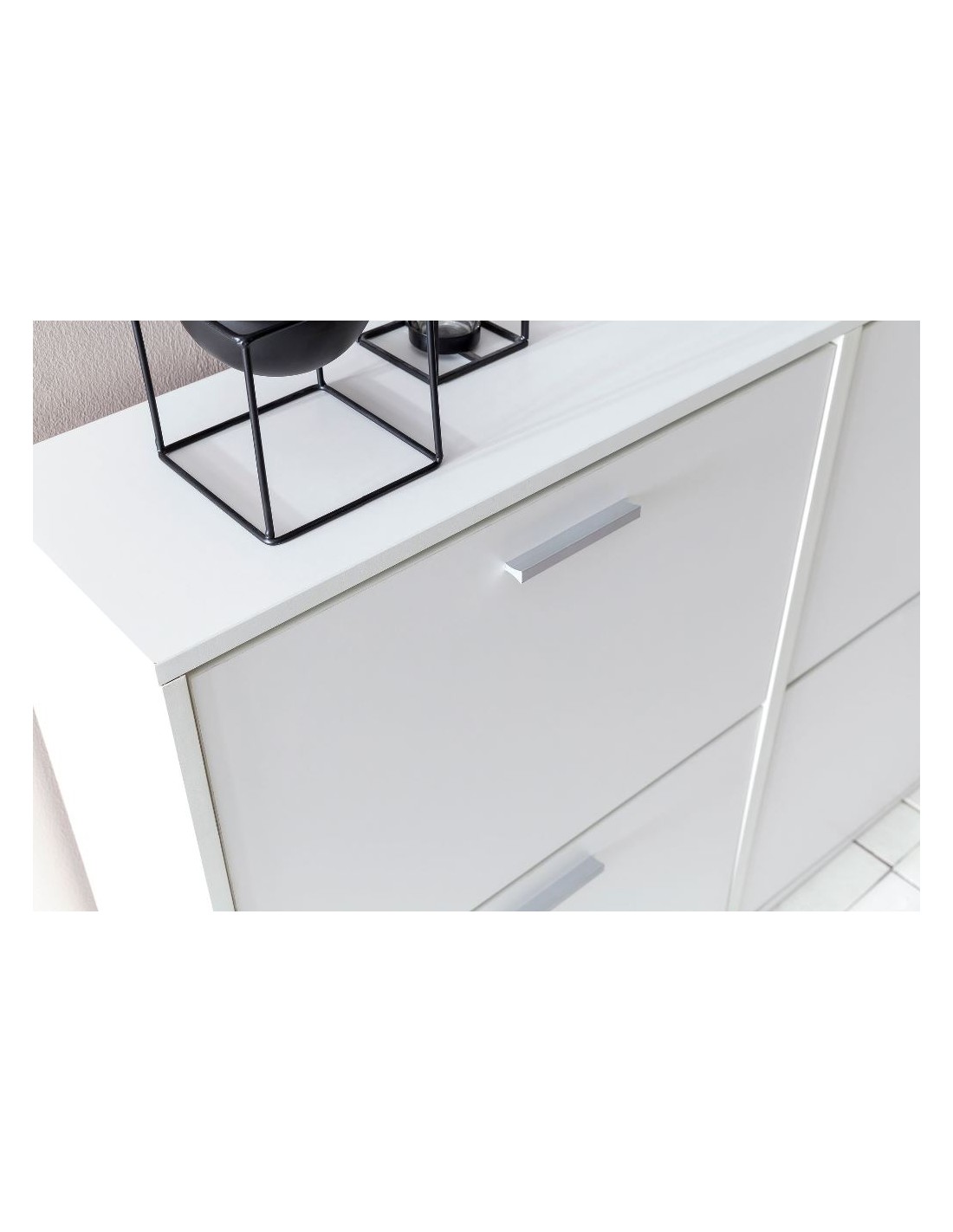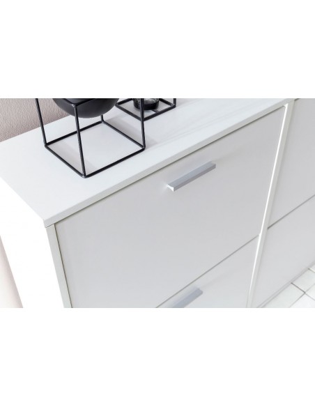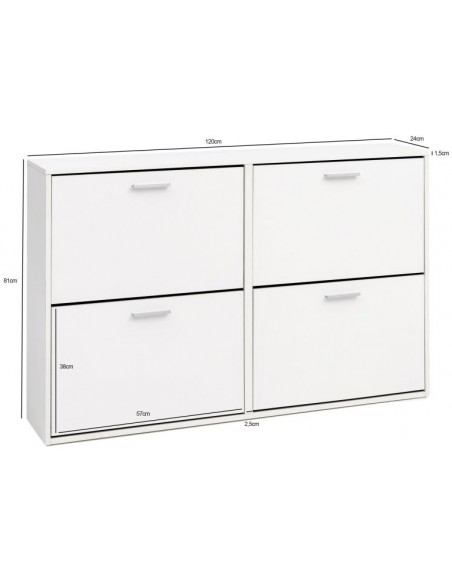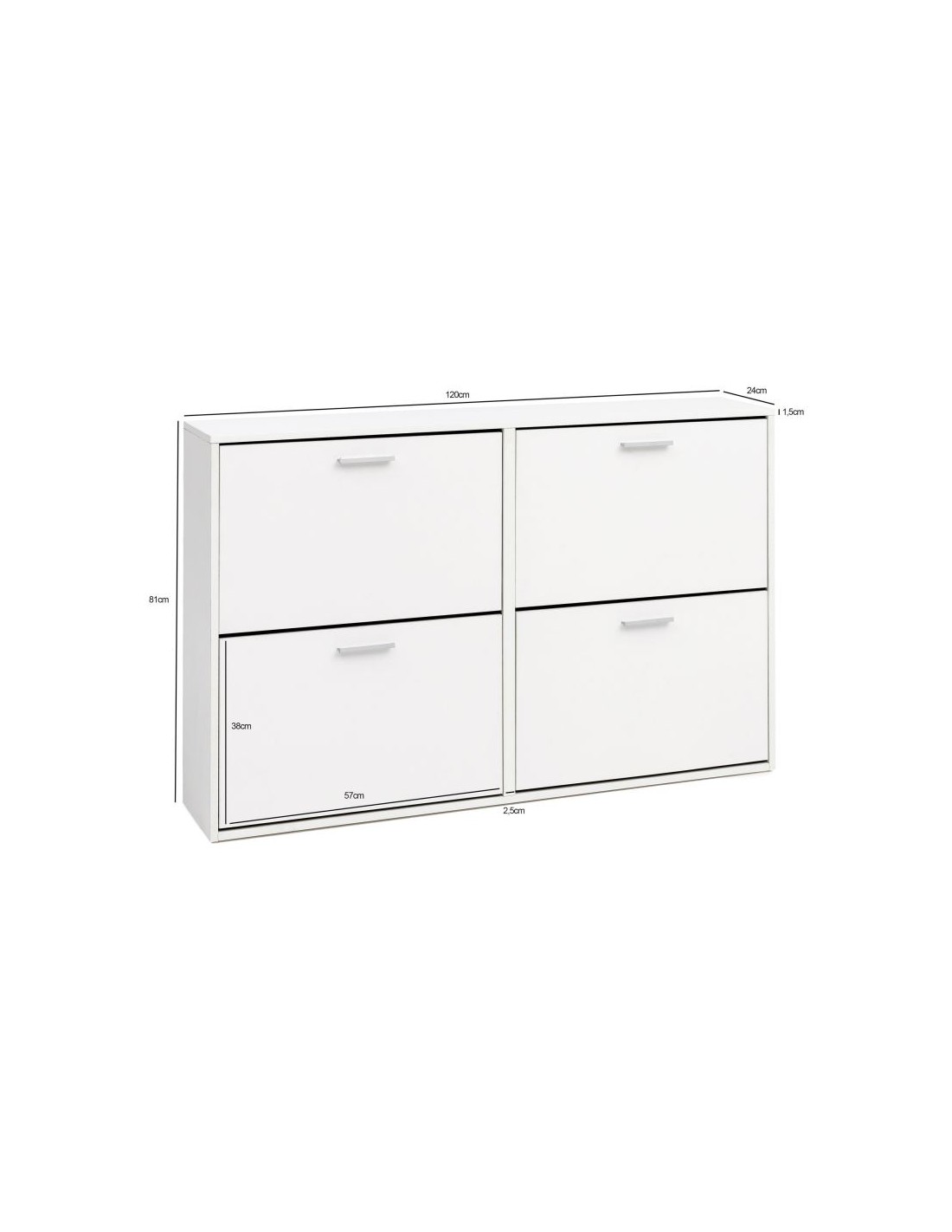 Skoskab fremstillet i et design af hvid møbelplade. Skoskabet måler 81 cm i højden og 120 x 24 cm i bredde og dybde.