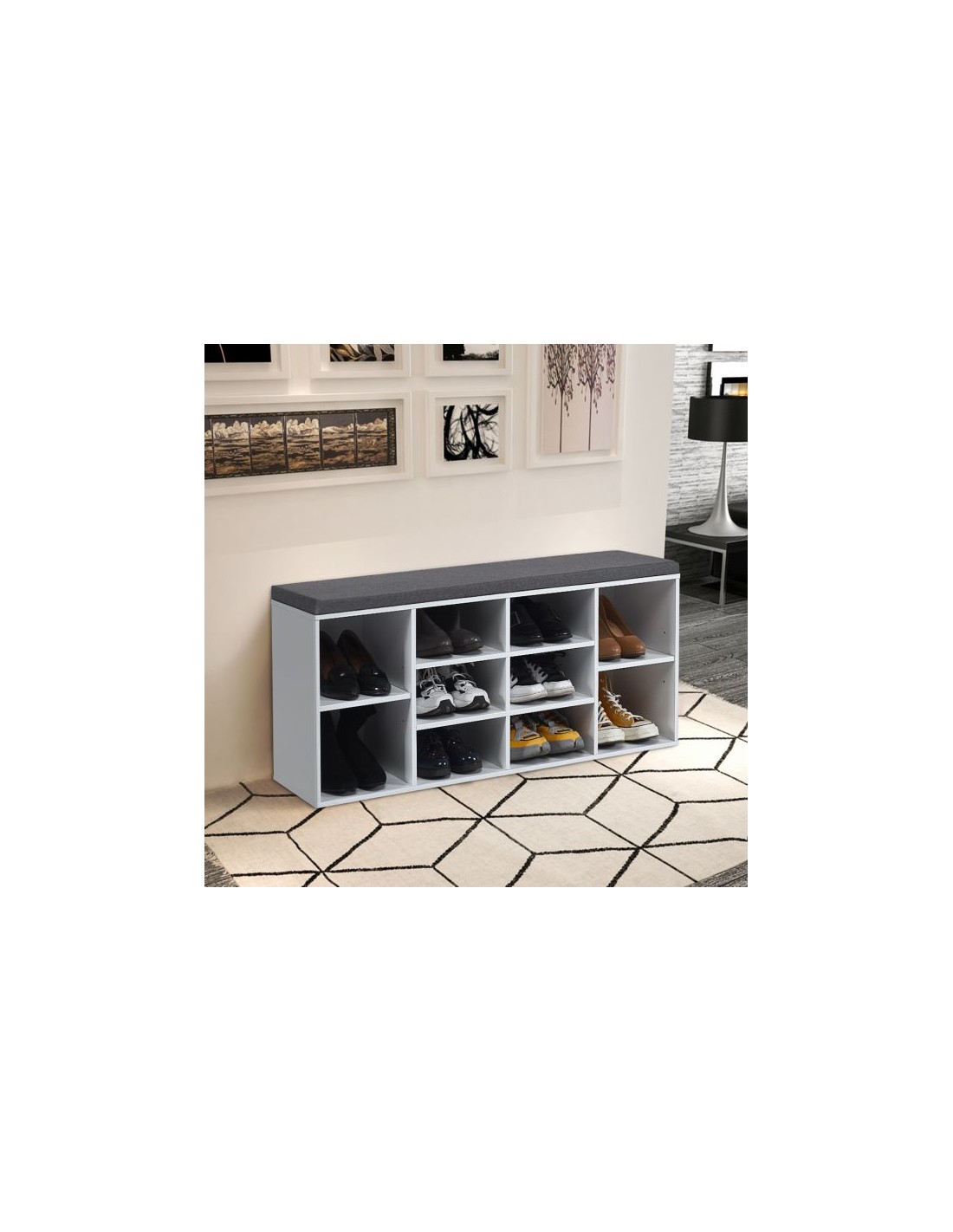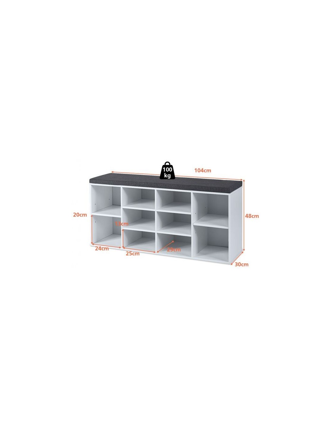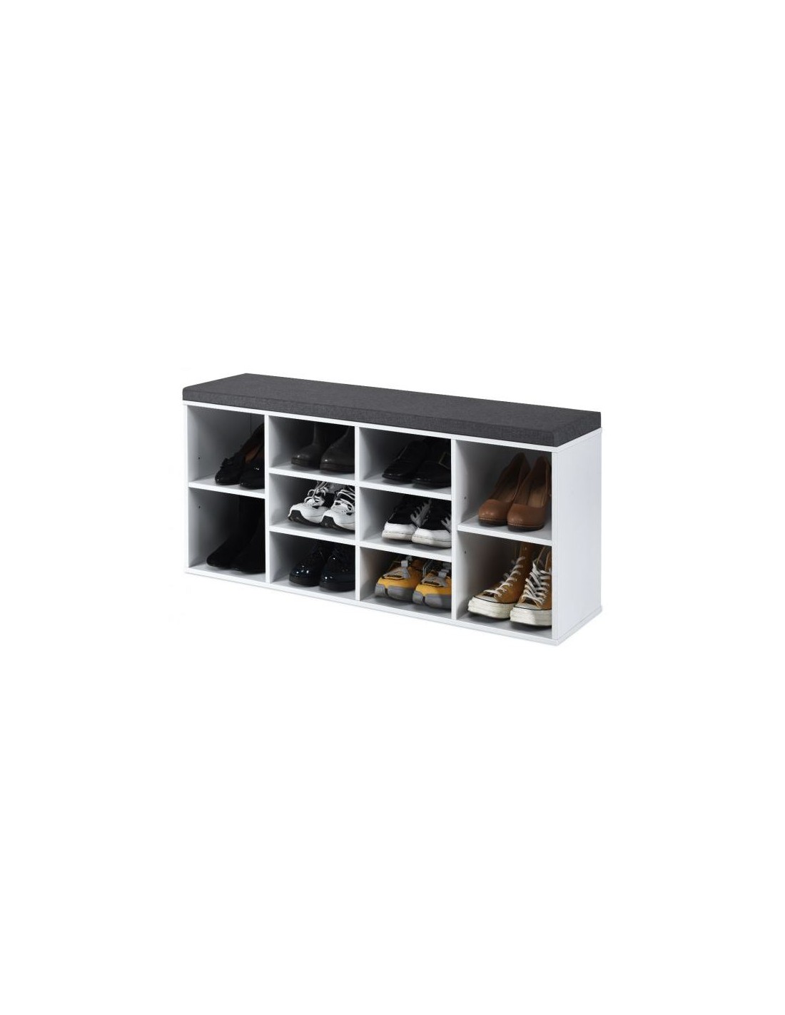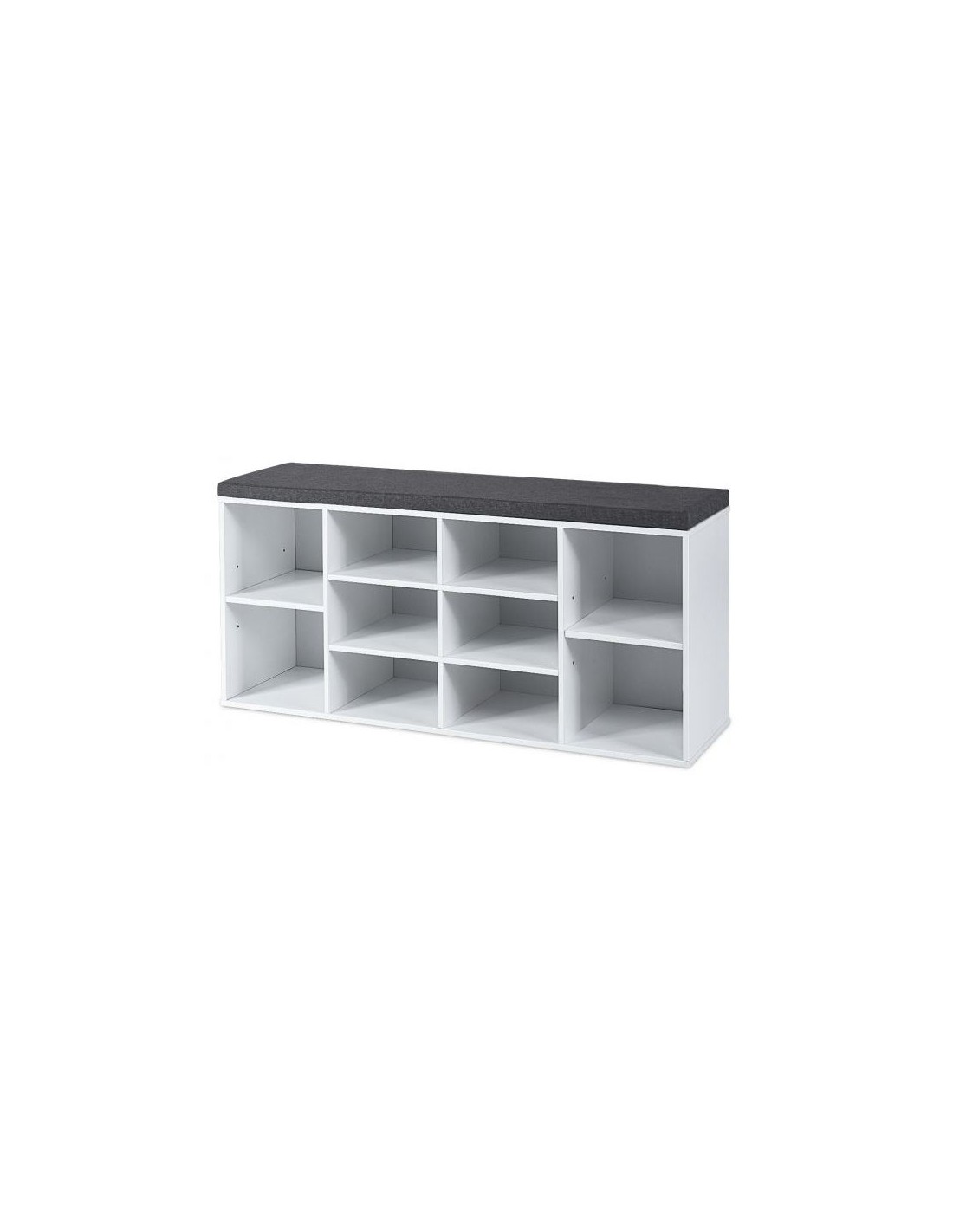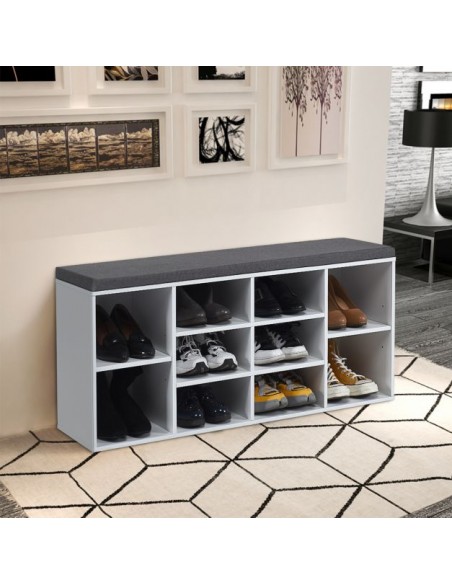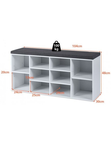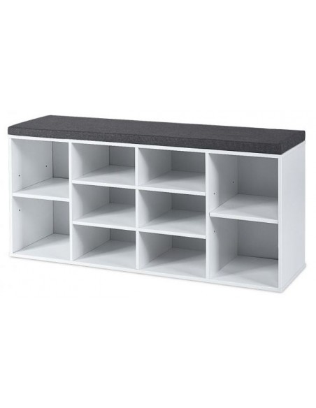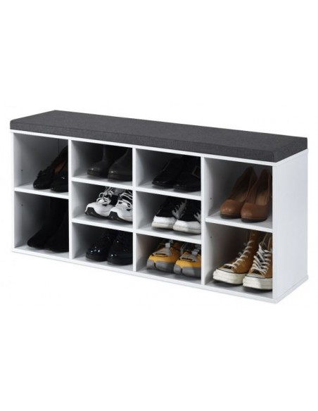 Skoreol med siddehynde, udført i et design af hvid møbelplade og grå polyester. Skoreolen har 2 justerbare hylder og måler 48 cm i højden og 104 x 30 cm i bredde og dybde.