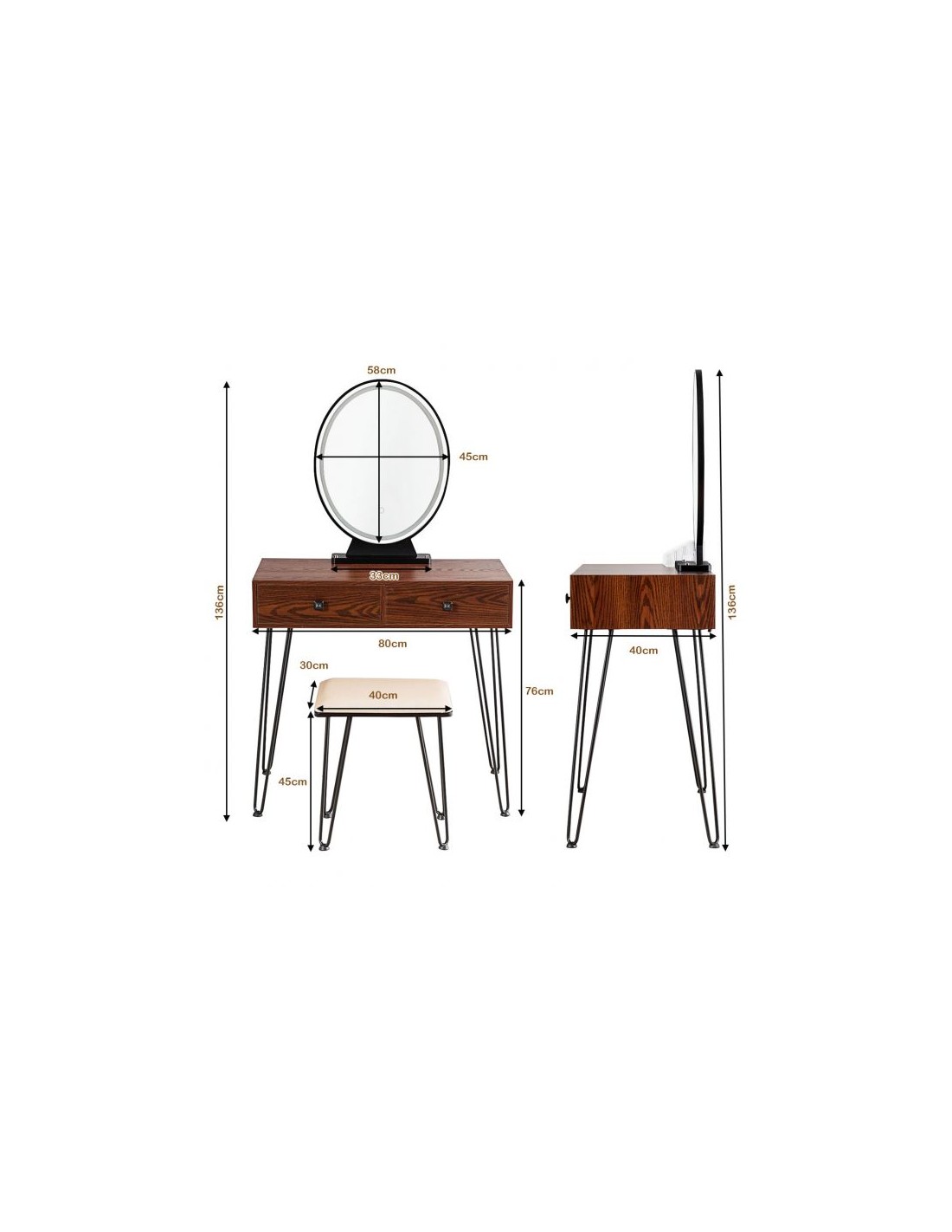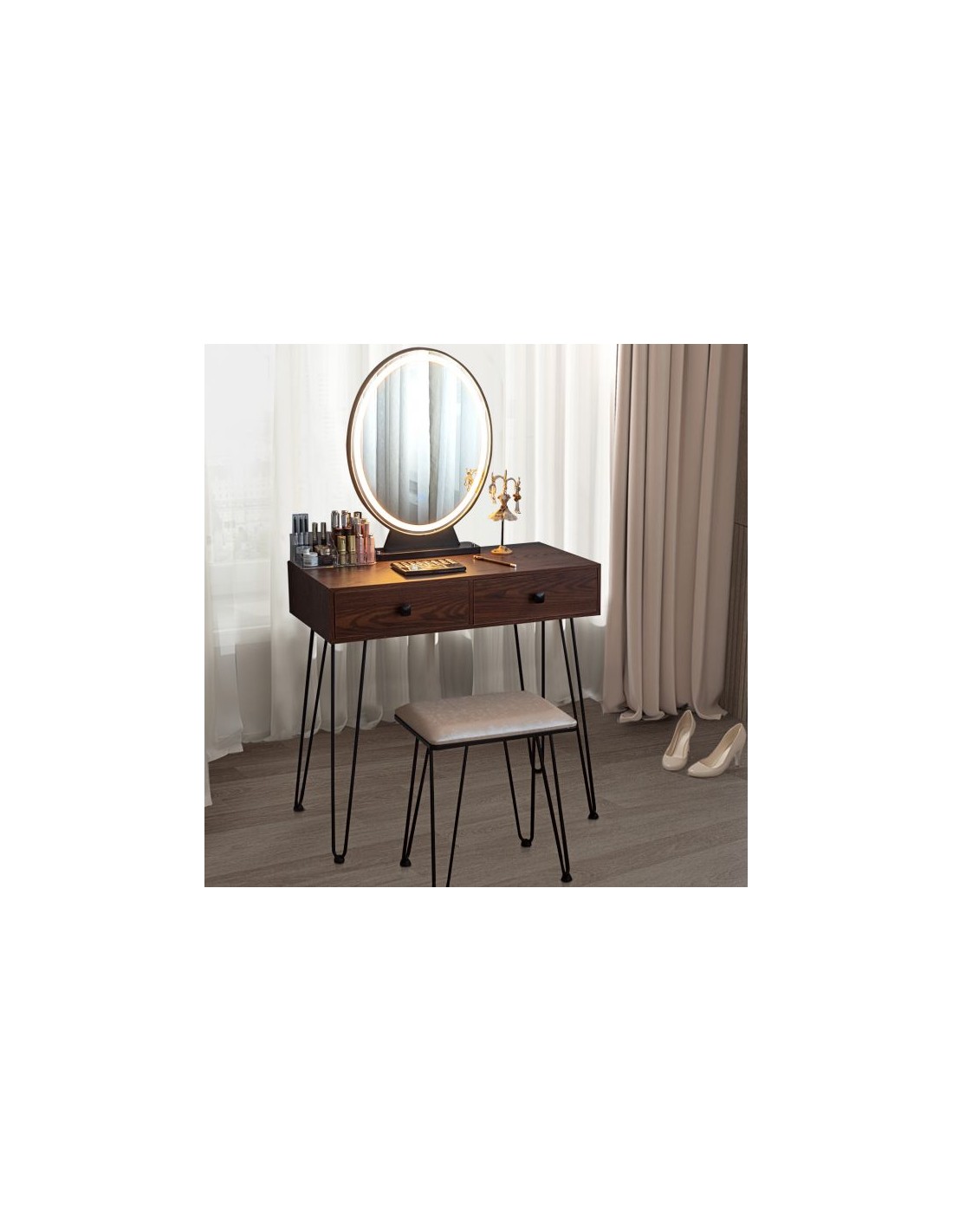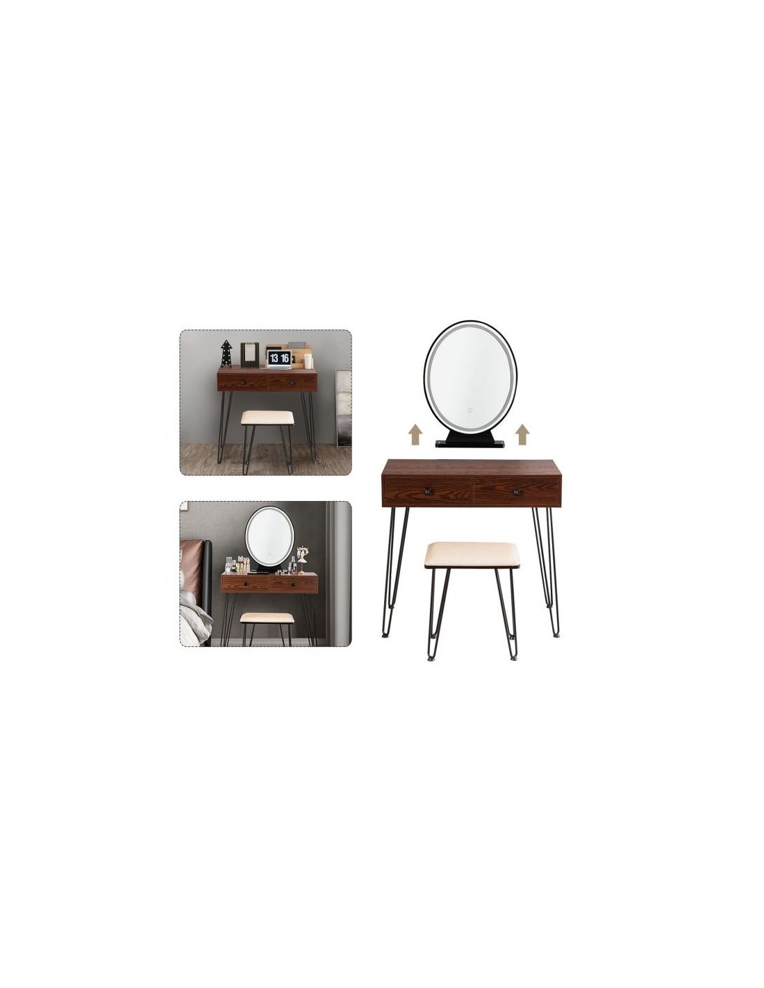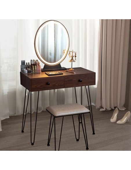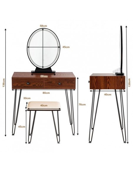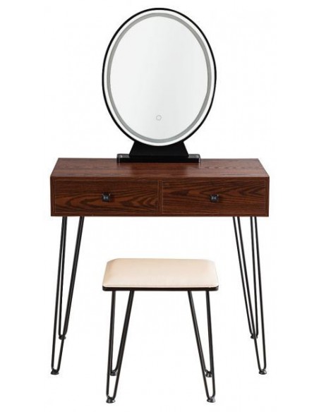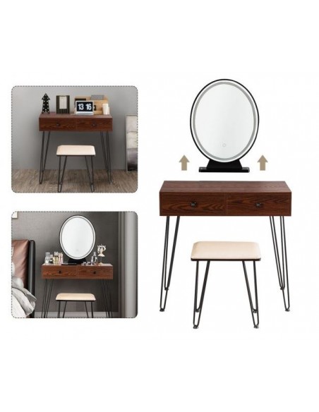 Sminkebord med spejl, udført i et design af sortlakeret metal og brun mdf. Sminkebordet måler 76 - 136 cm i højden og 80 x 40 cm i bredde og dybde. Spejlet har belysning og der medfølger stik/adapter 220V.