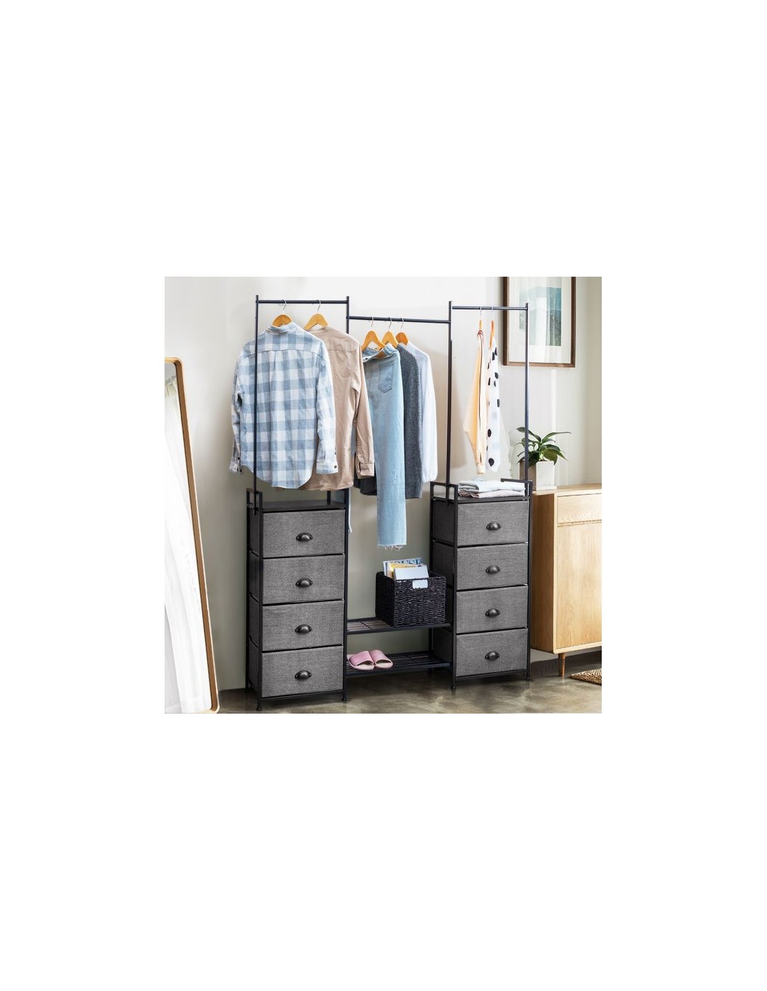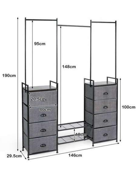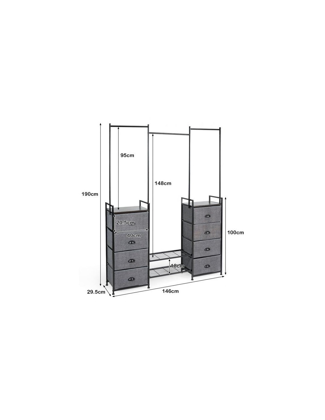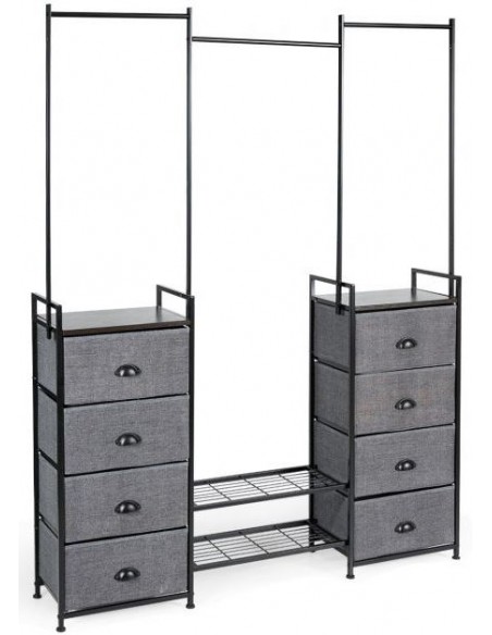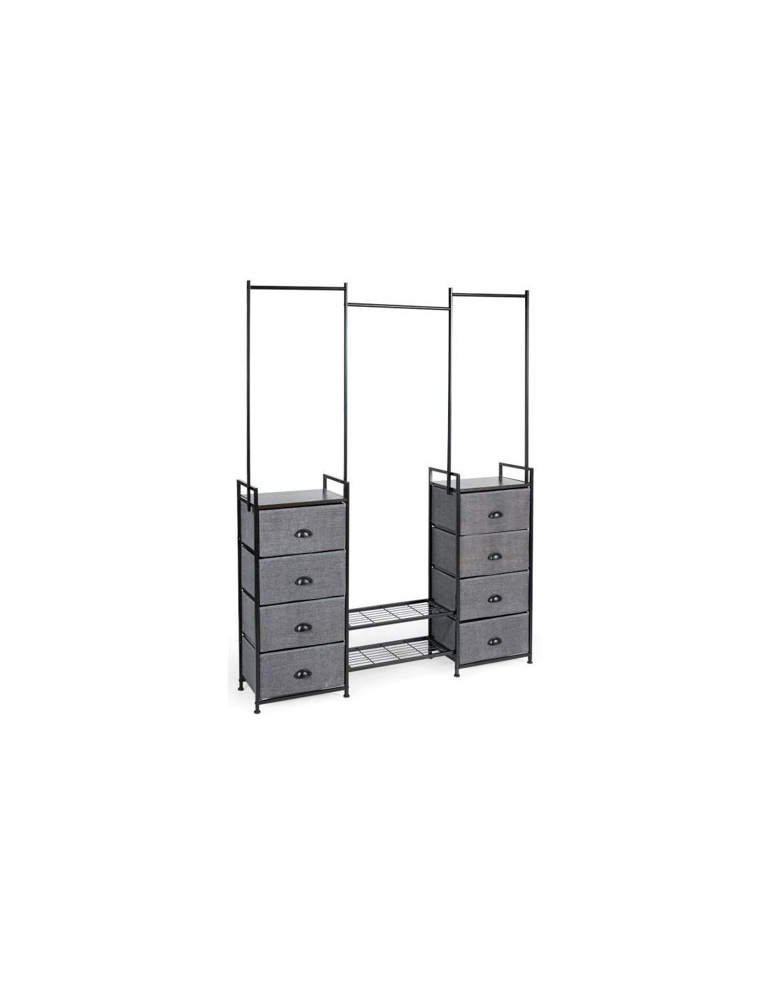 Garderobe stativ med skuffer, udført i et design af sortlakeret metal og grå polyester med mdf sider. Garderoben måler 190 cm i højden og 146 x 29,5 cm i bredde og dybde.