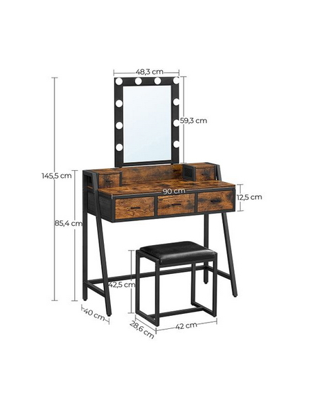 Sminkebord med spejl, udført i et design af sortlakeret metal og brun møbelplade. Sminkebordet måler 145,5 cm i højden og 90 x 40 cm i bredde og dybde.