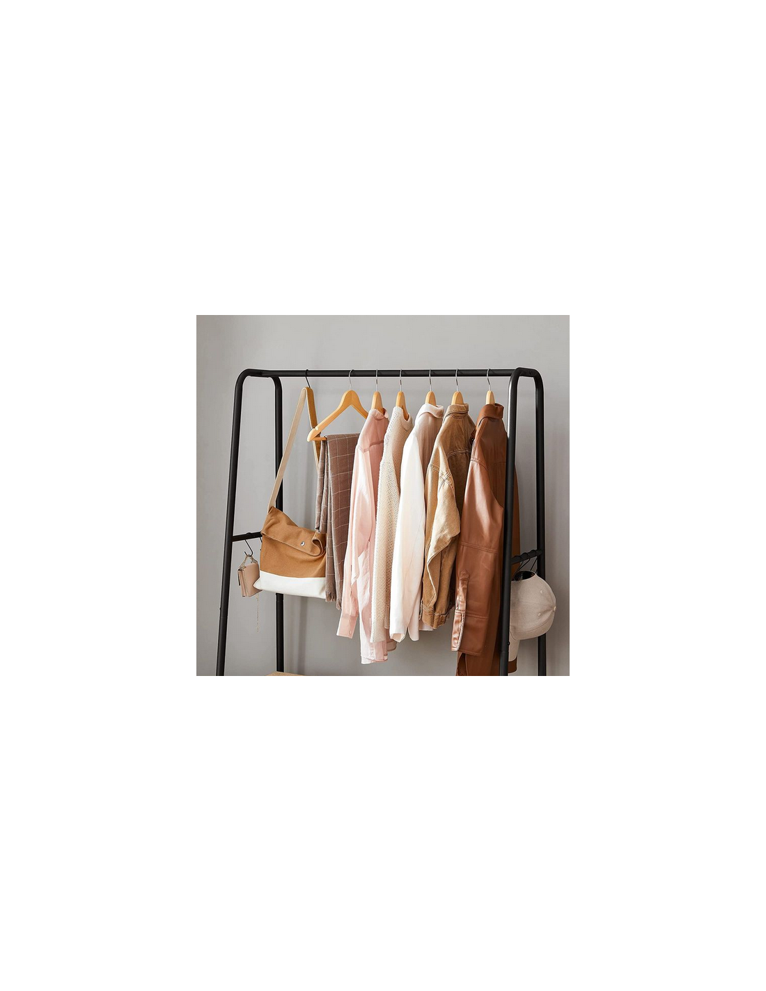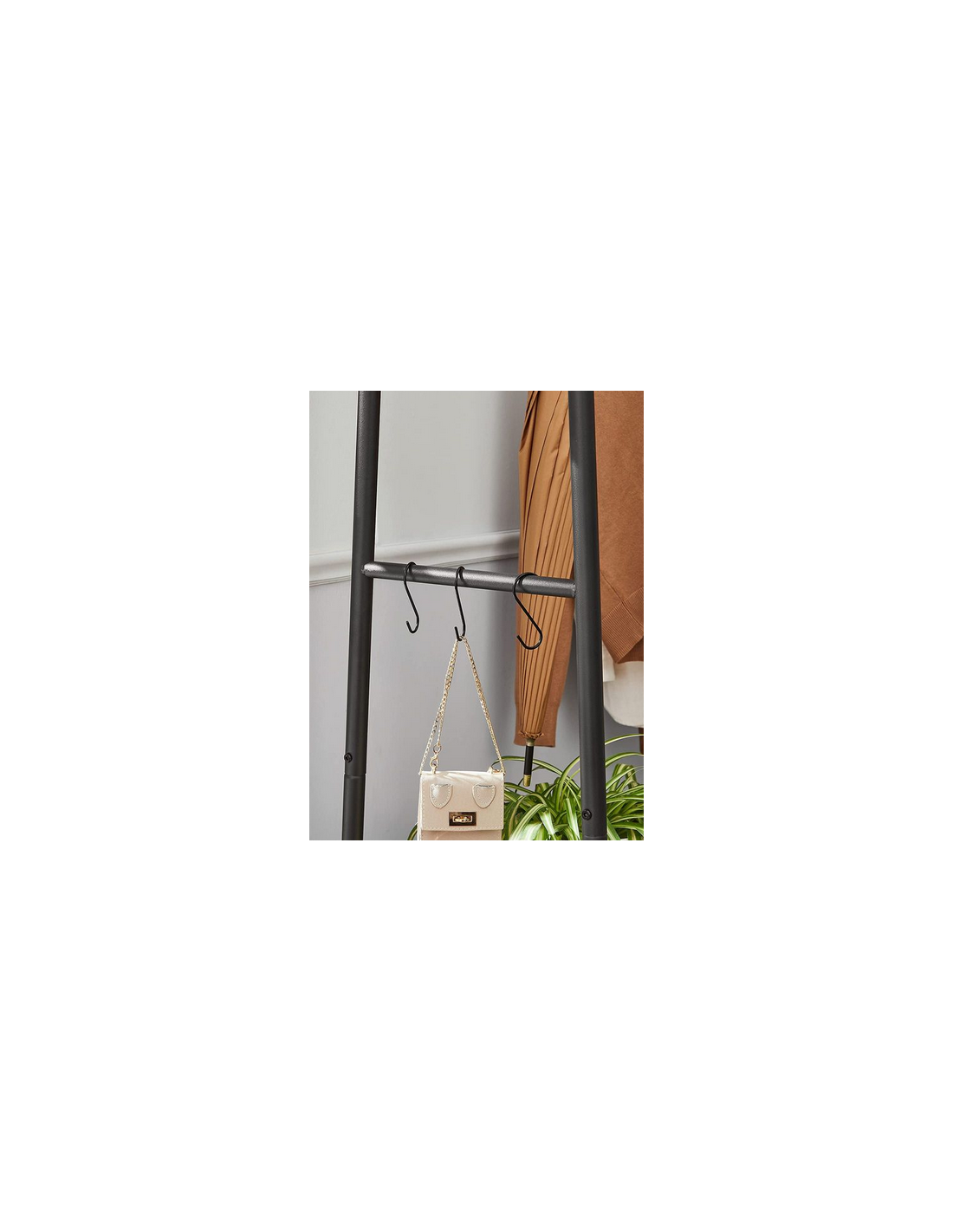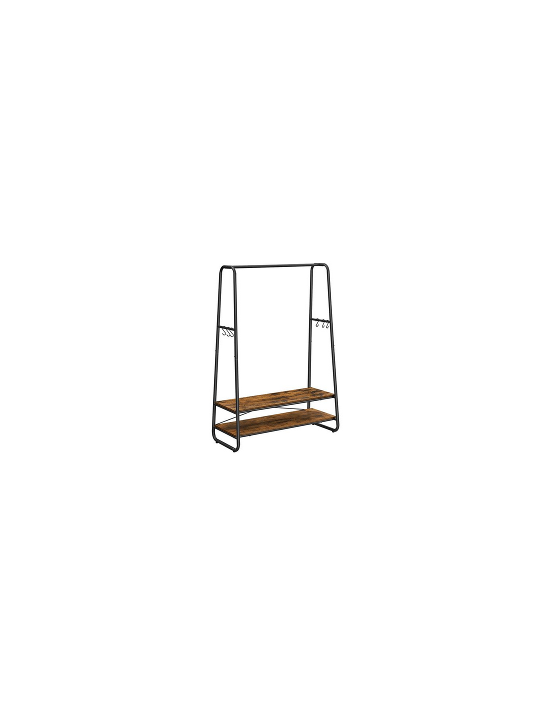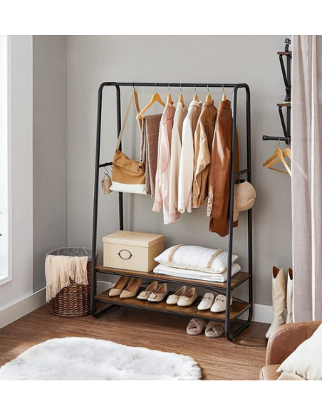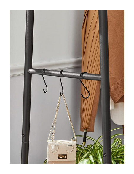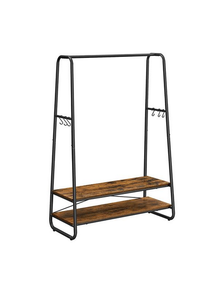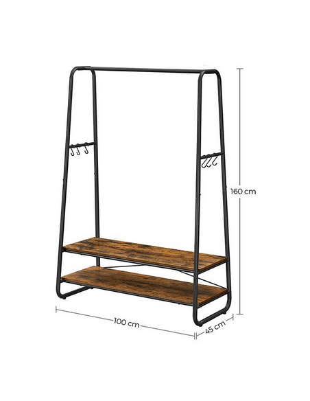 Garderobe stativ udført i et design af sortlakeret metal og brun møbelplade. Garderoben måler 160 cm i højden og 100 x 45 cm i bredde og dybde.
