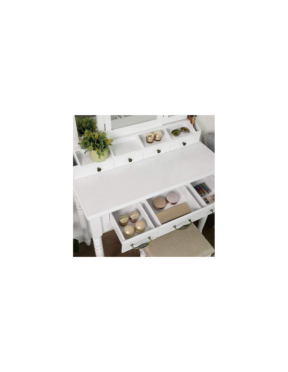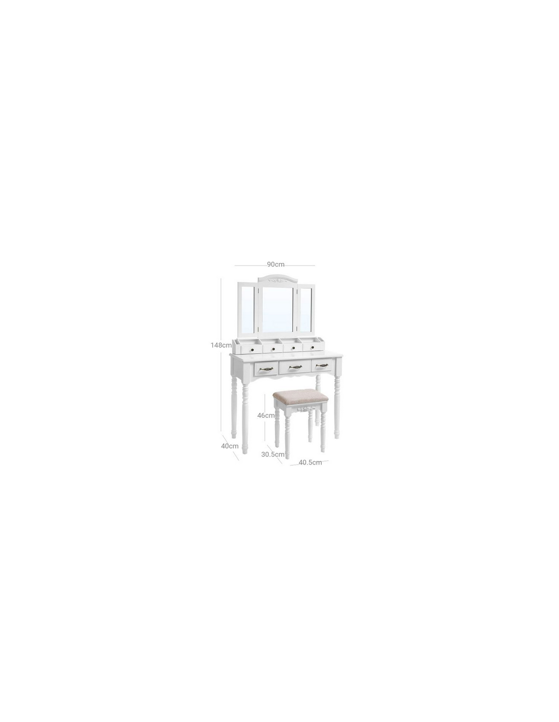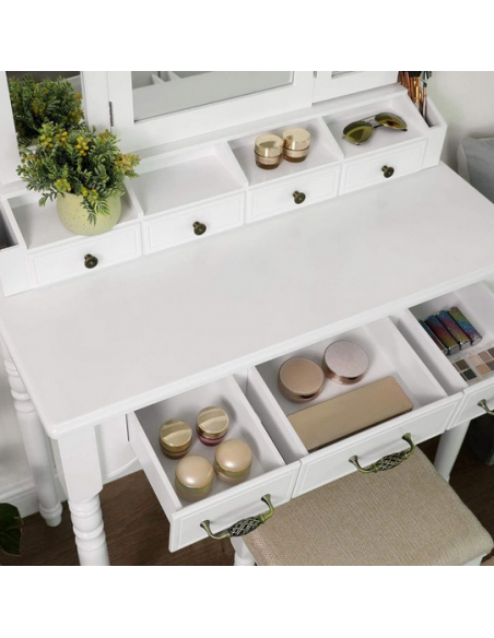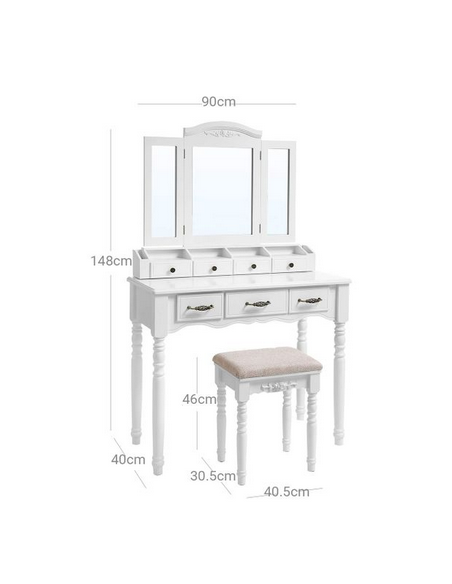 Sminkebord med spejl, udført i et design af hvid mdf og træ. Sminkebordet måler 148 cm i højden og 90 x 40 cm i bredde og dybde.