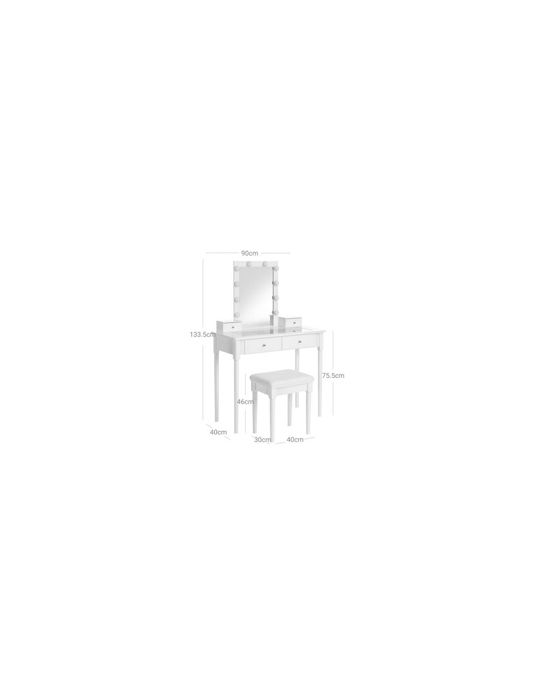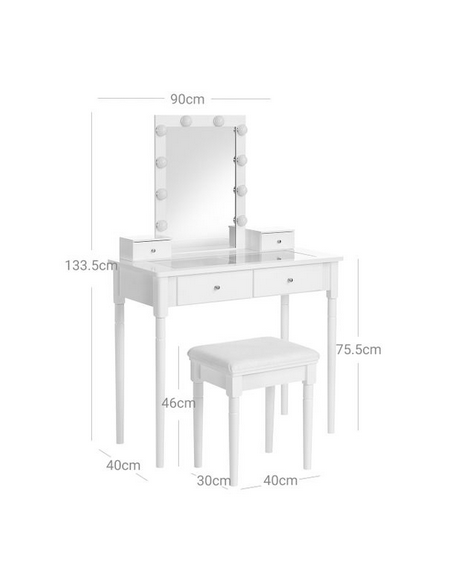 Sminkebord med spejl, udført i et design af hvid mdf og træ. Sminkebordet måler 133,5 cm i højden og 90 x 40 cm i bredde og dybde.