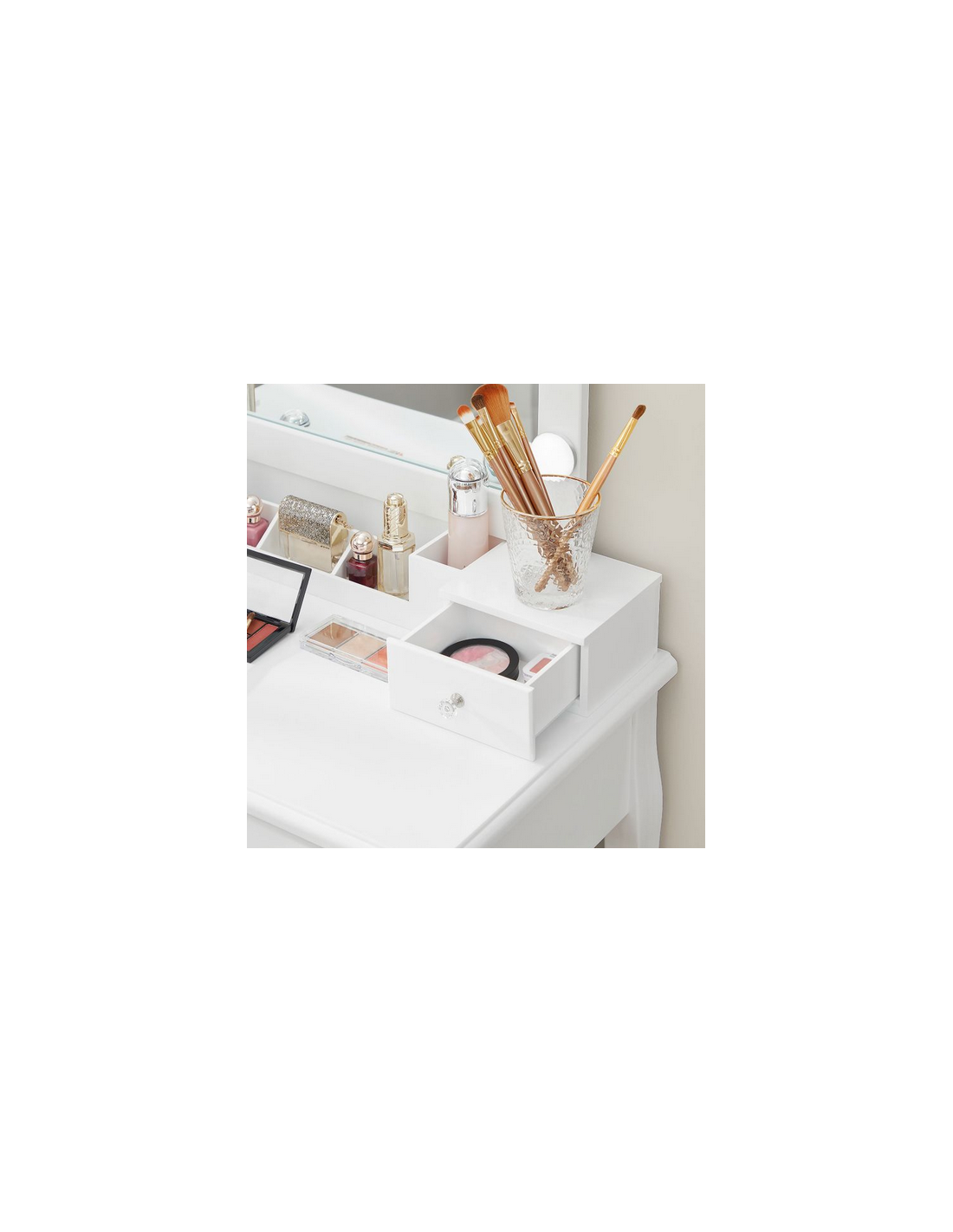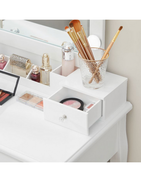 Sminkebord med spejl, udført i et design af hvid mdf og træ. Sminkebordet måler 139 cm i højden og 63 x 40 cm i bredde og dybde.