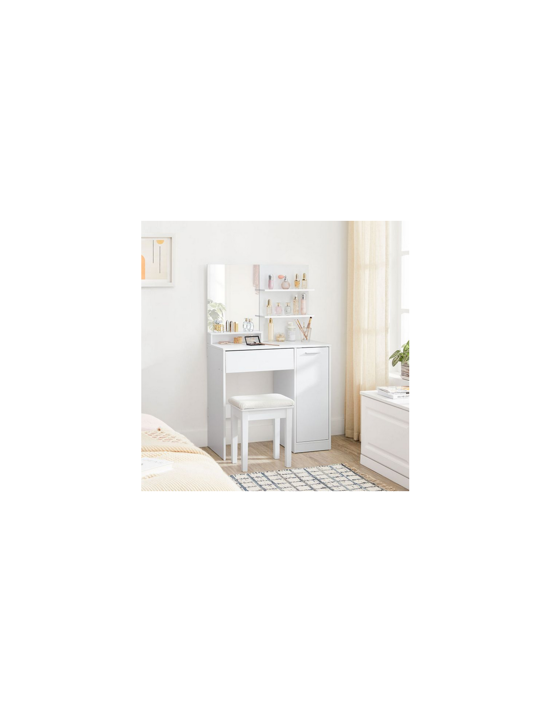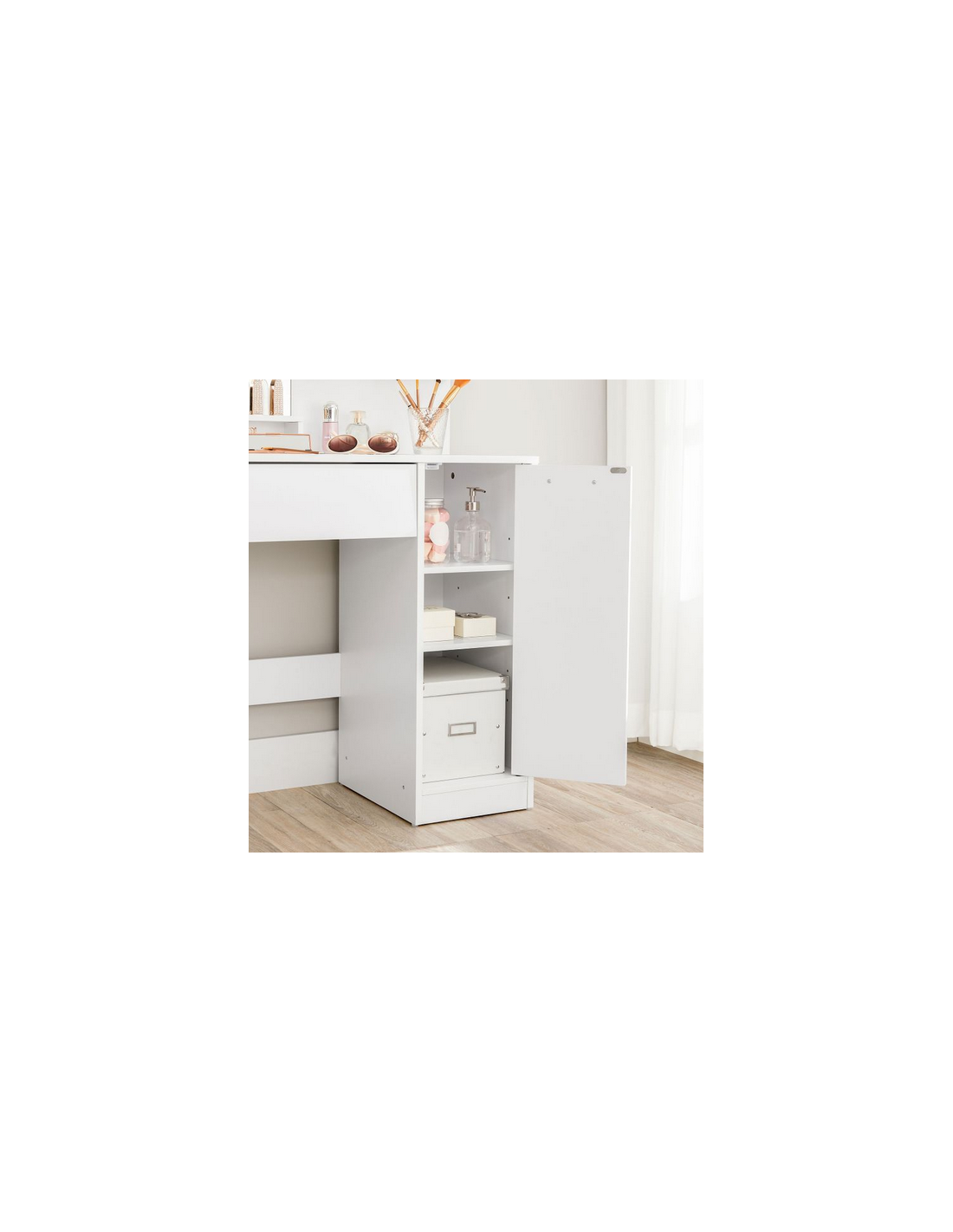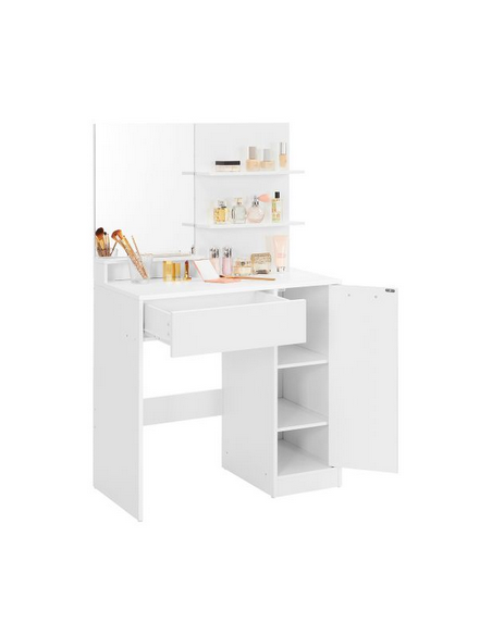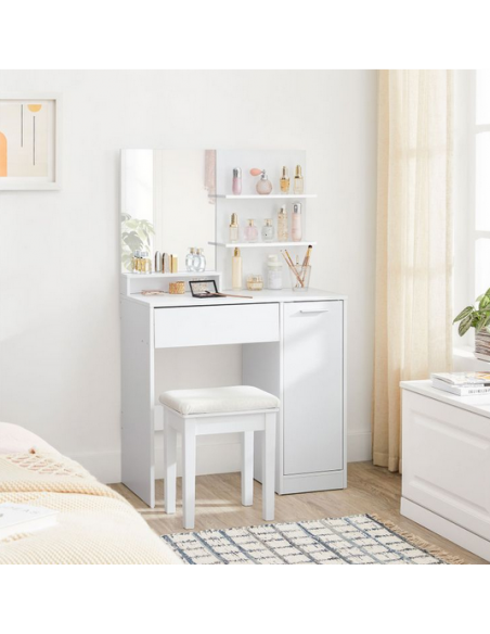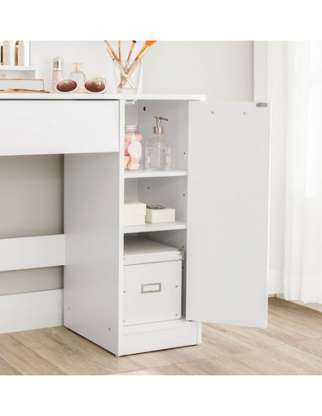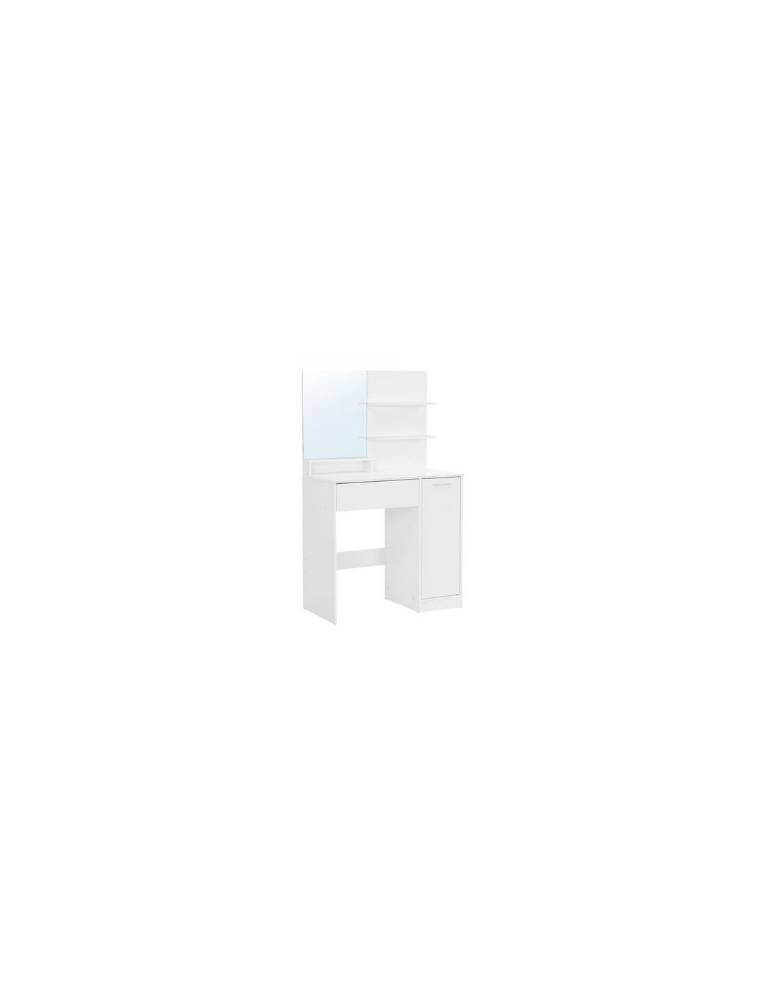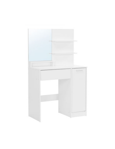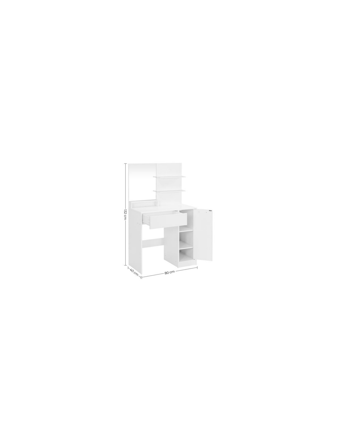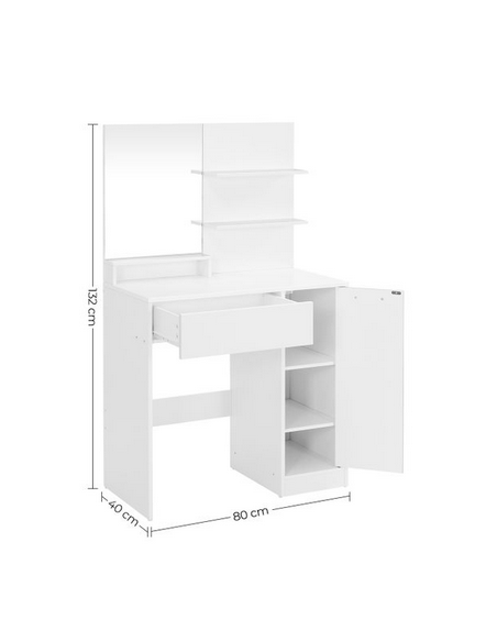 Sminkebord med spejl, udført i et design af hvid møbelplade. Sminkebordet måler 132 cm i højden og 80 x 40 cm i bredde og dybde.