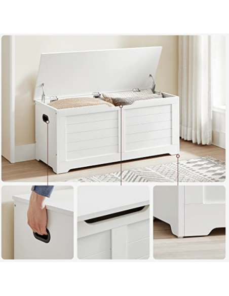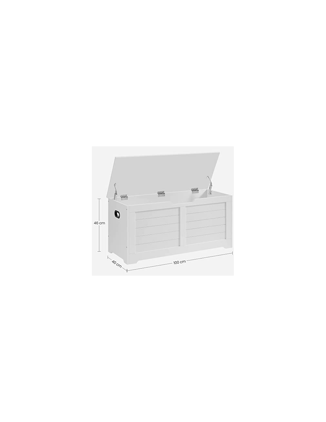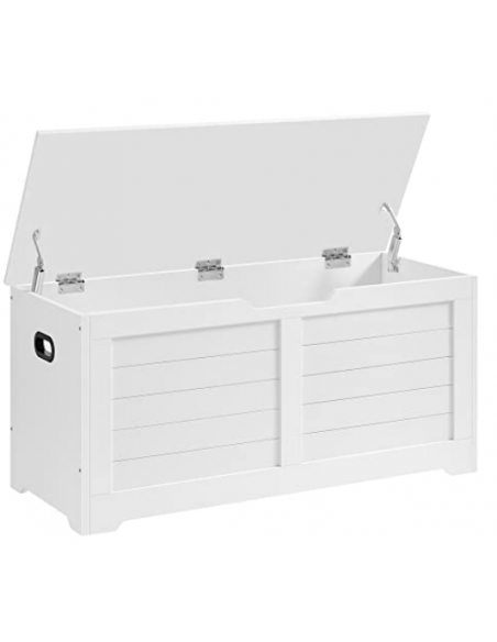 Bænk med opbevaring, udført i et design af hvid møbelplade. Bænken måler 46 cm i højden og 100 x 40 cm i bredde og dybde.