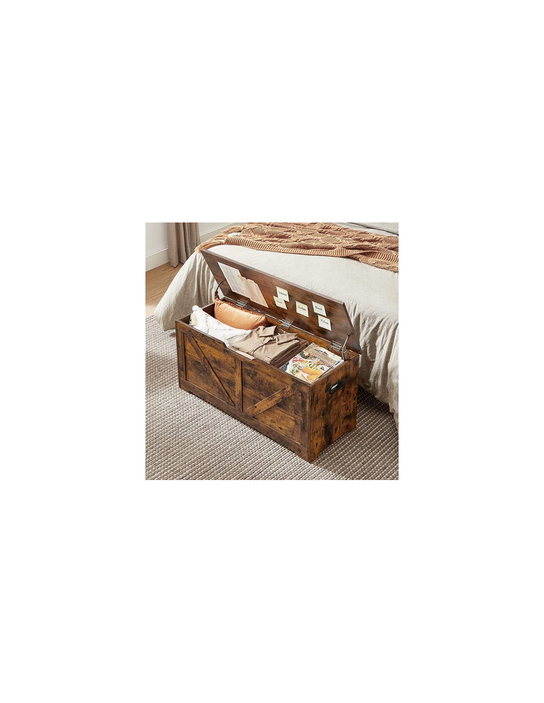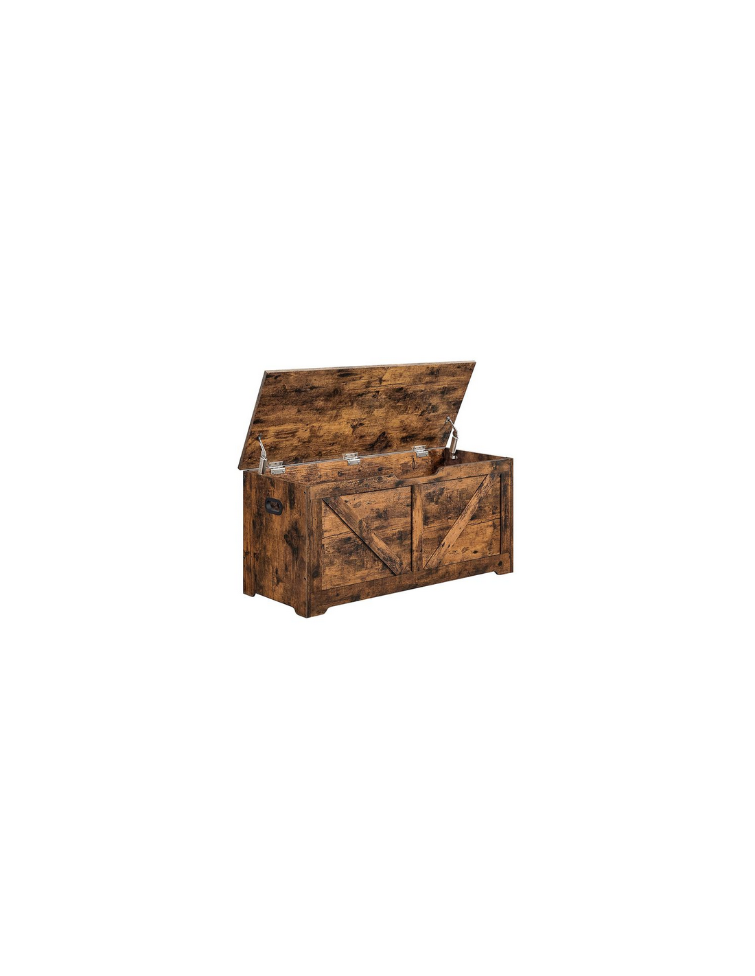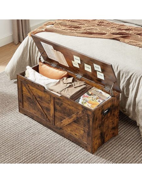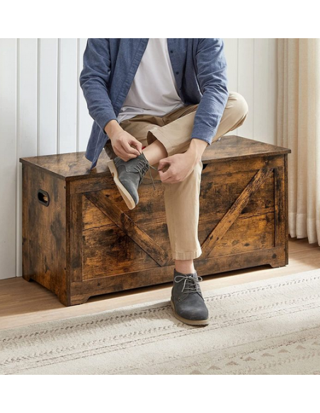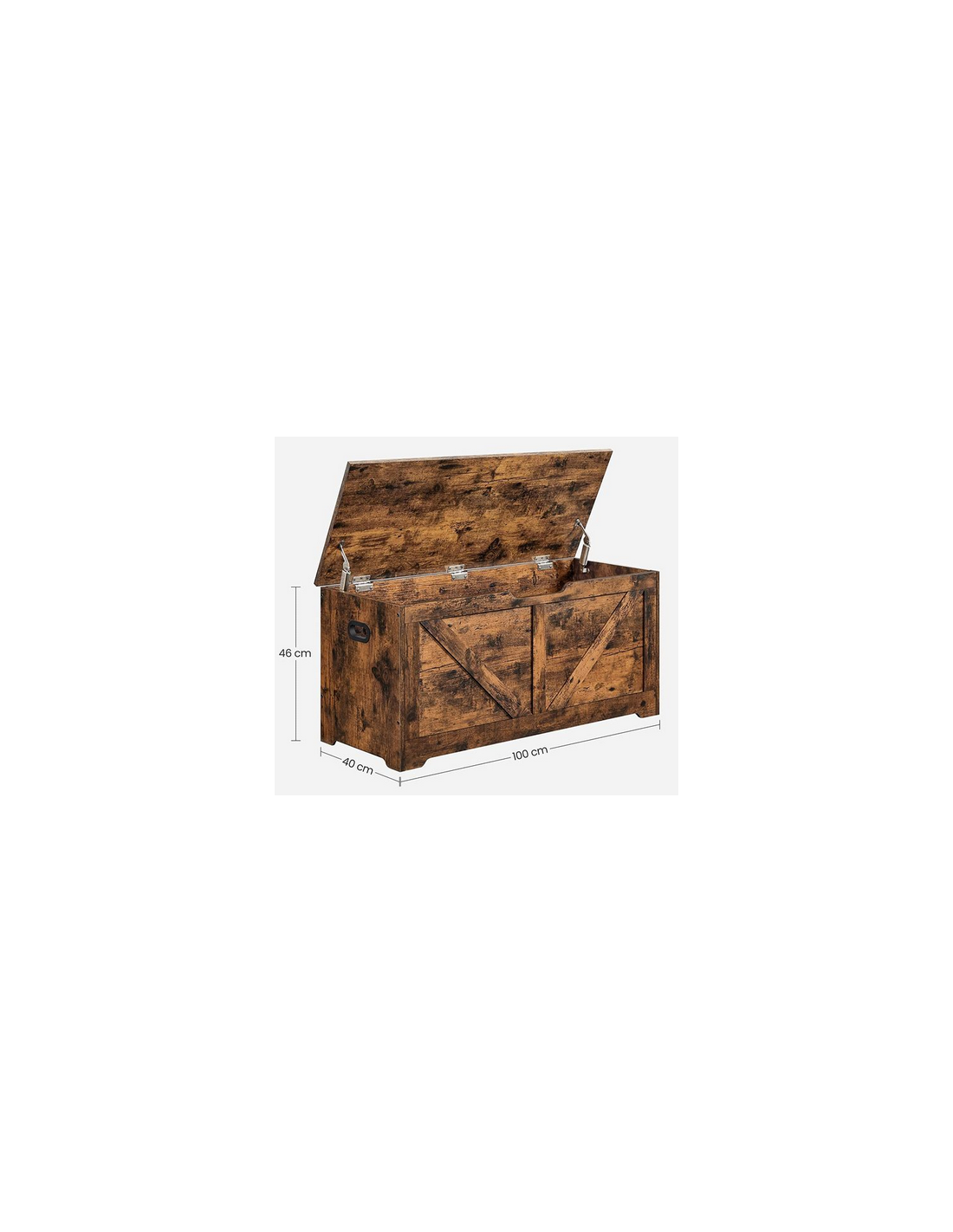 Bænk med opbevaring, udført i et design af brun møbelplade. Bænken måler 46 cm i højden og 100 x 40 cm i bredde og dybde.