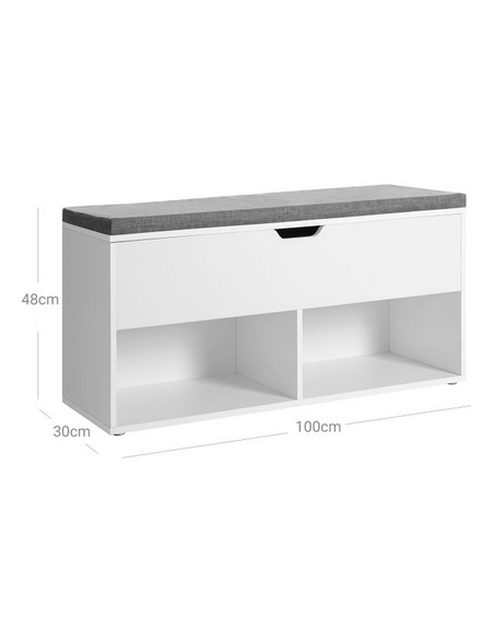 Skoreol med bænk, udført i et design af hvid møbelplade og grå polyester. Bænken måler 48 cm i højden og 100 x 30 cm i bredde og dybde.