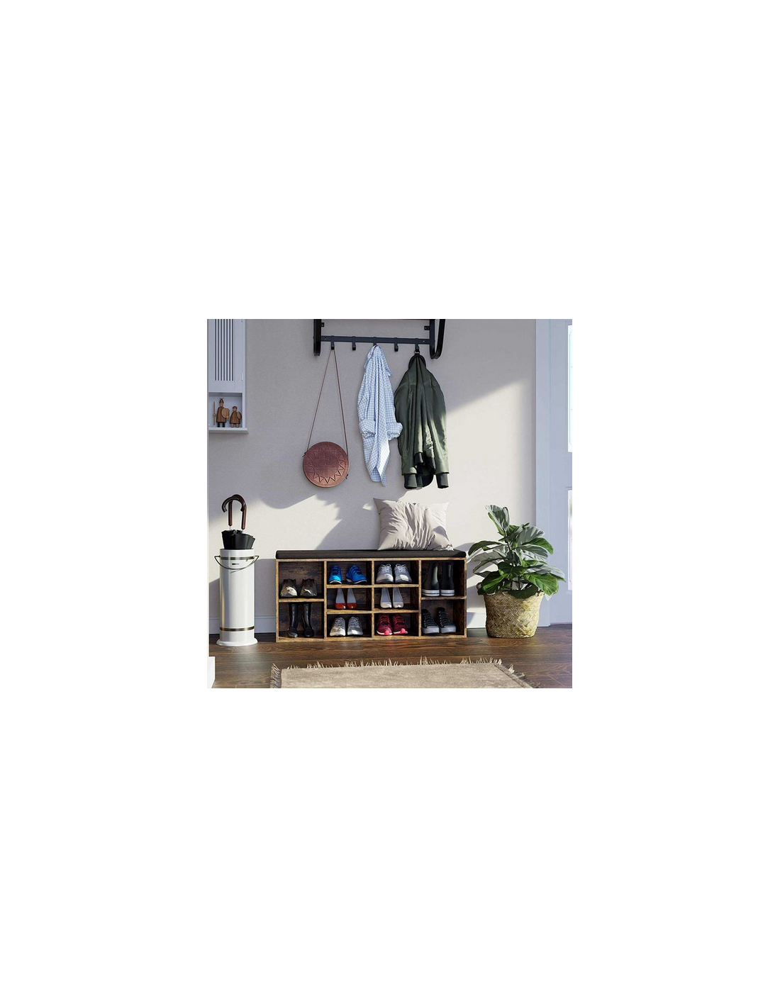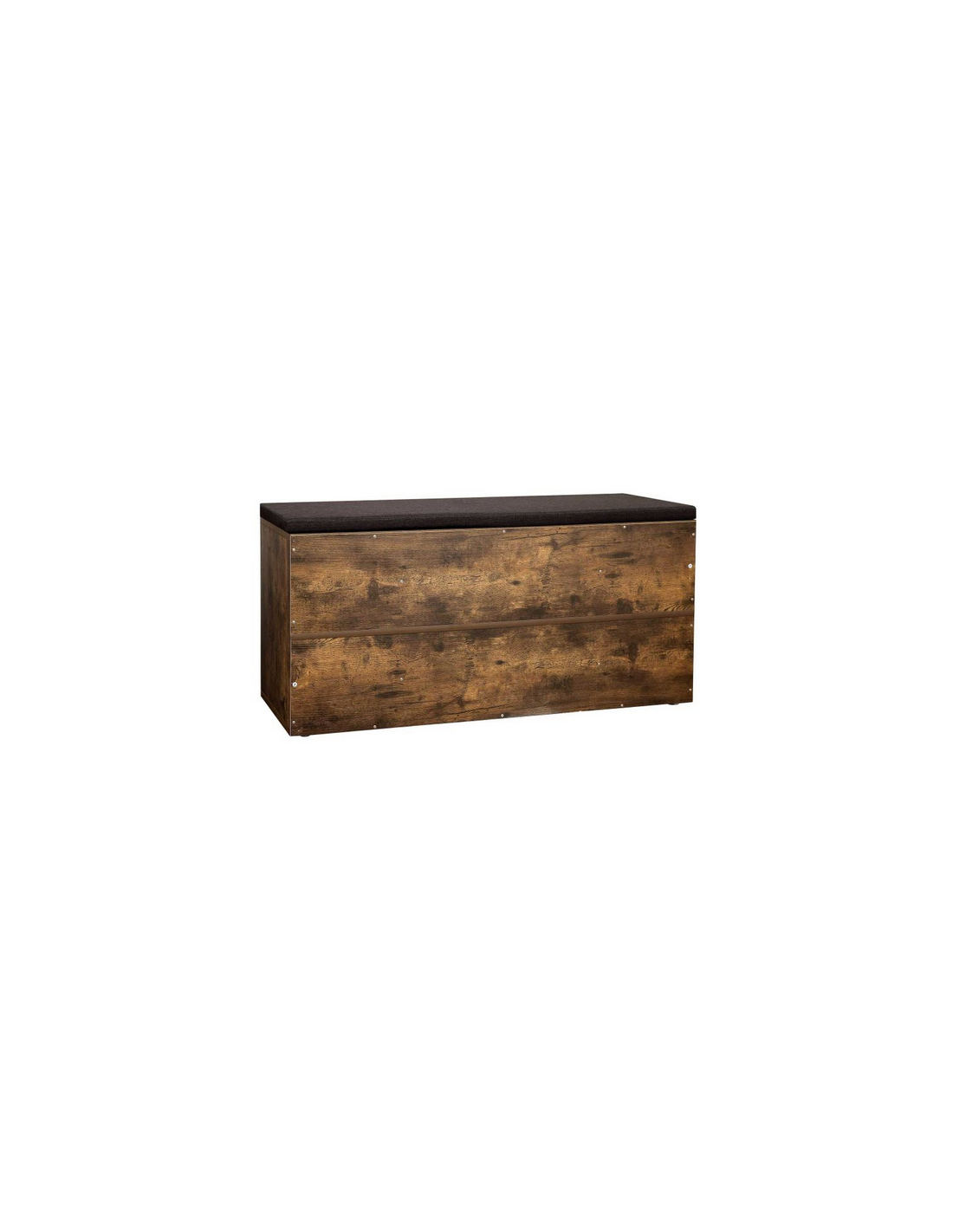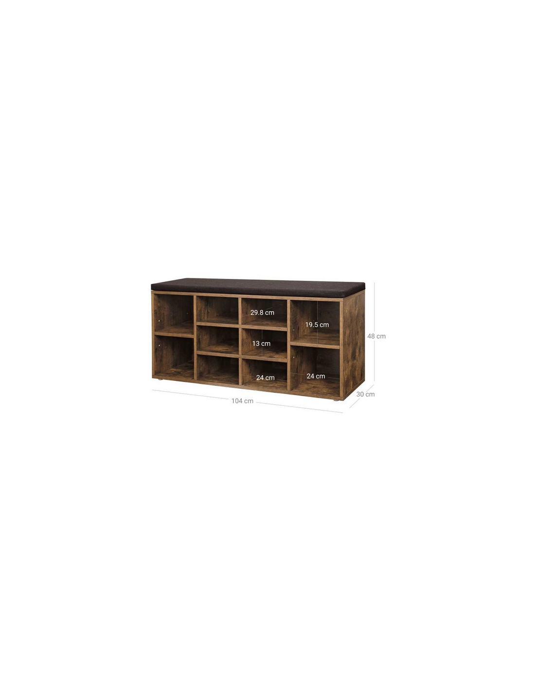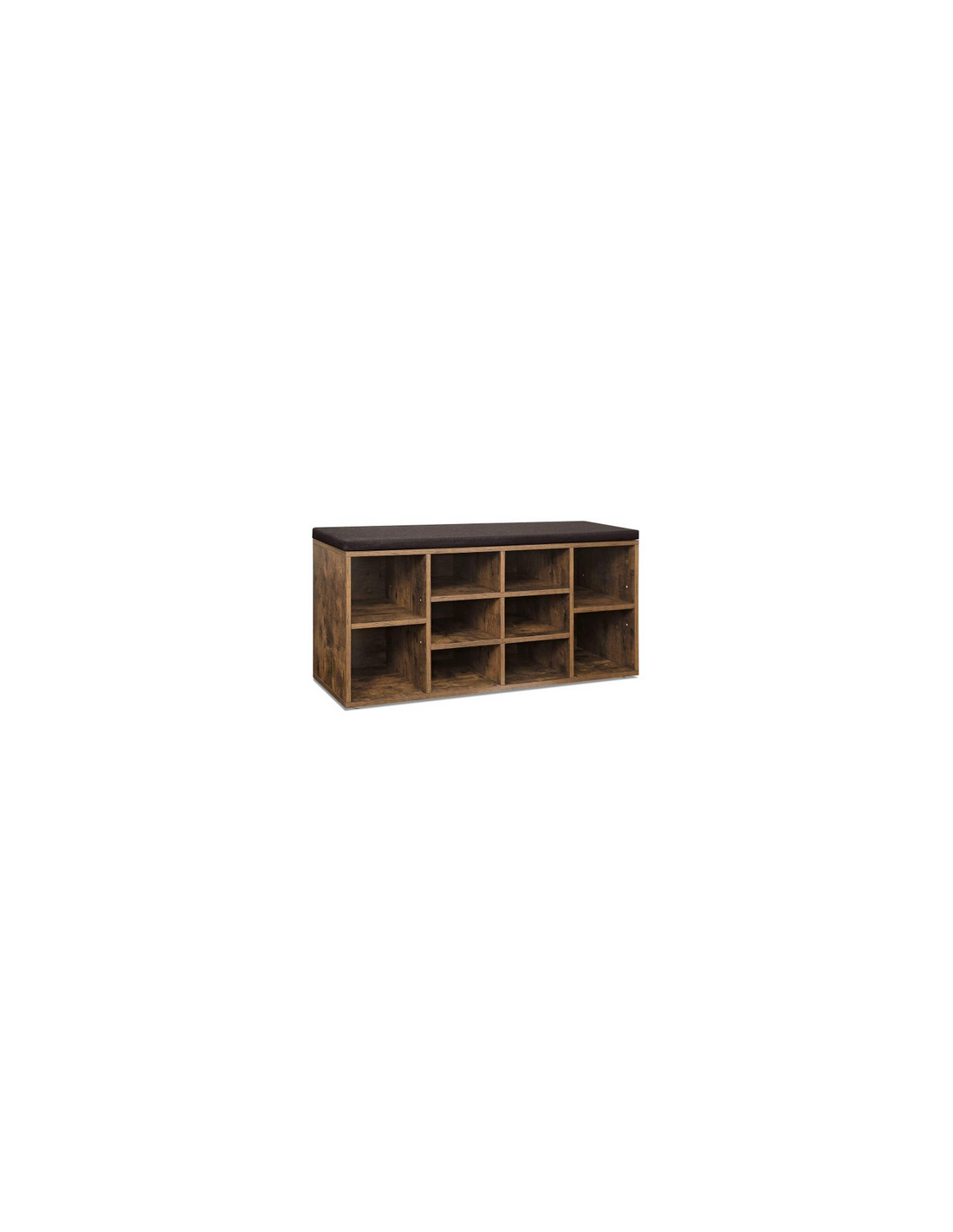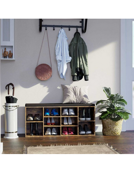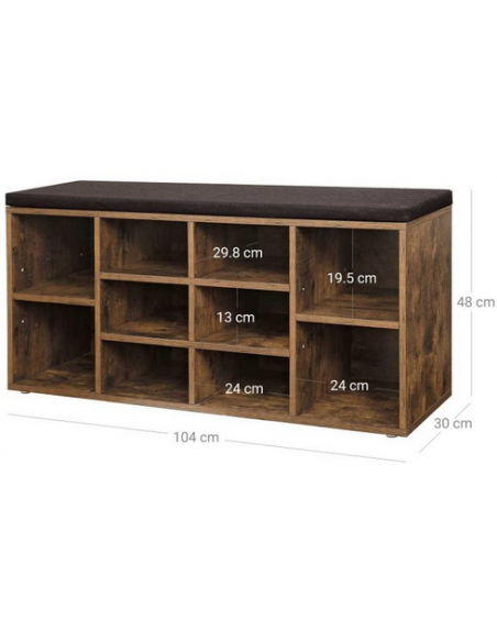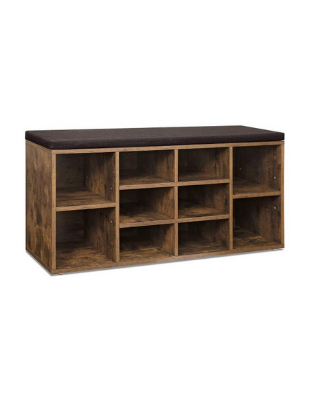 Skoreol med bænk, udført i et design af brun møbelplade og mørkegrå polyester. Bænken måler 48 cm i højden og 103 x 30 cm i bredde og dybde.