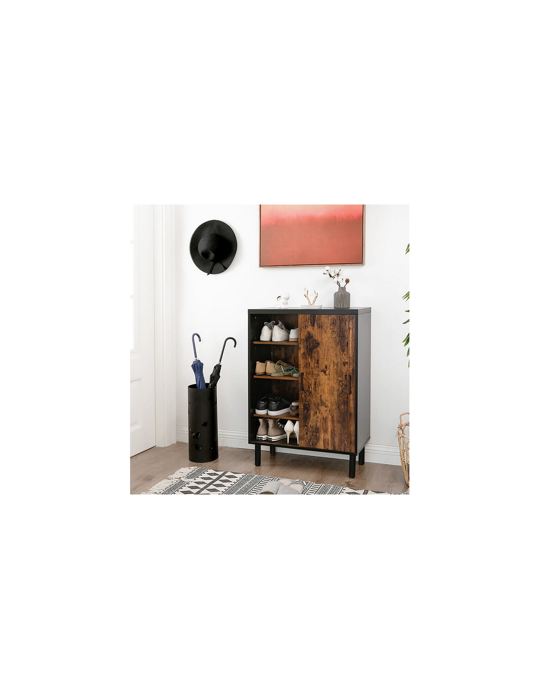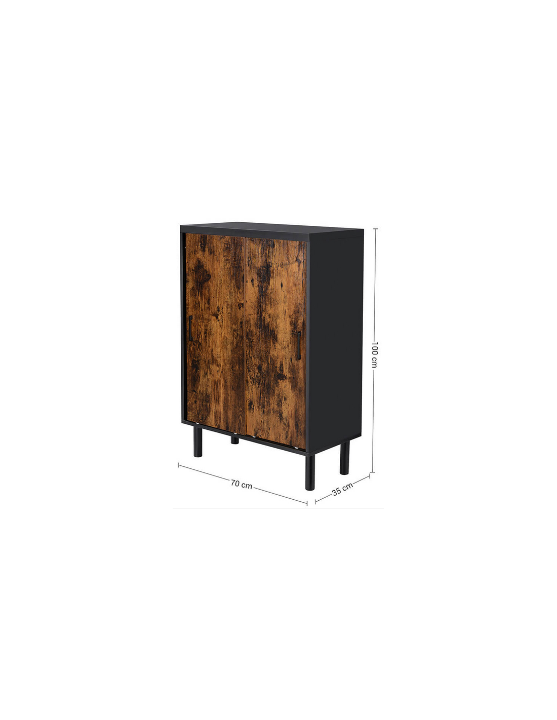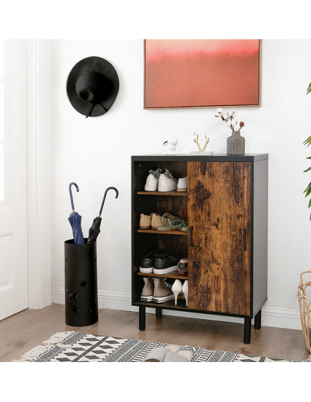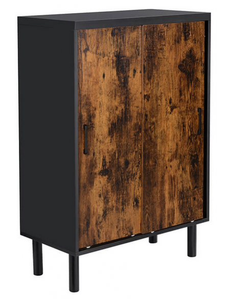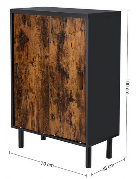Skoskab med skydelåger, udført i et design af sort og brun møbelplade og metal. Skoskabet måler 100 cm i højden og 70 x 35 cm i bredde og dybde.