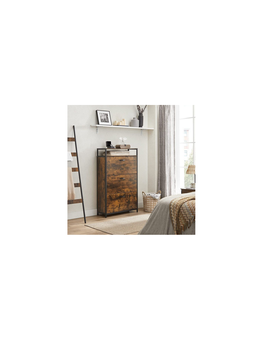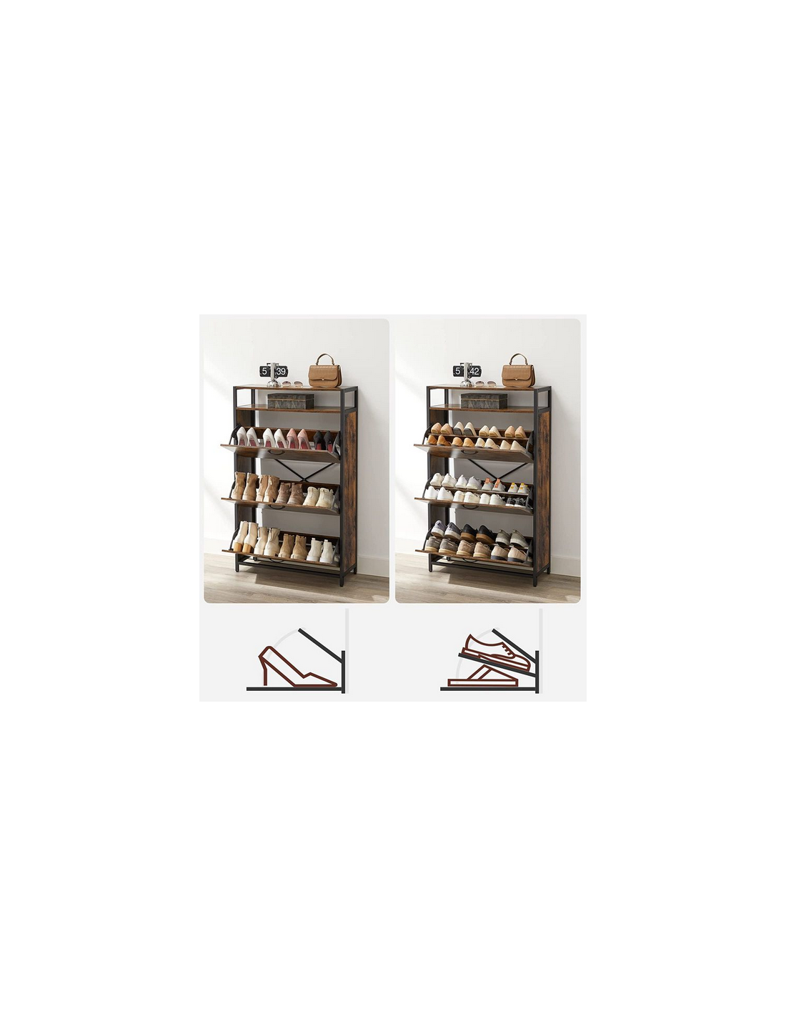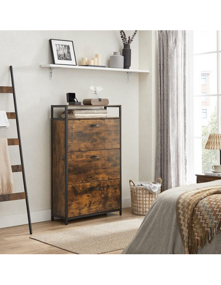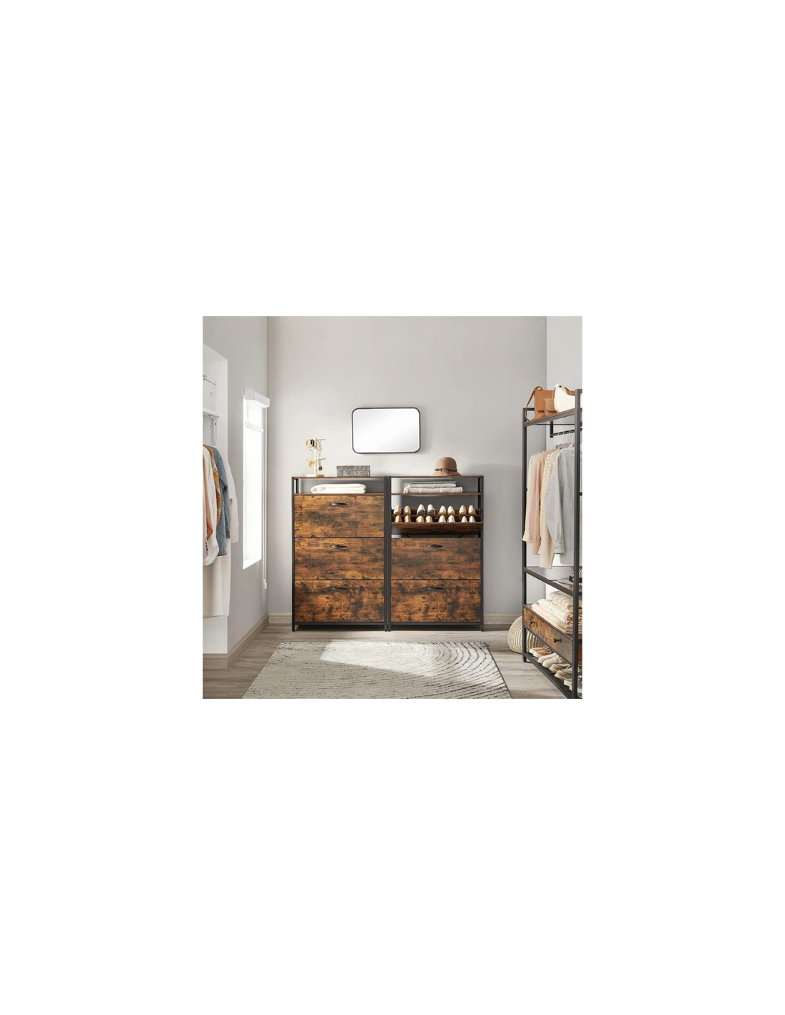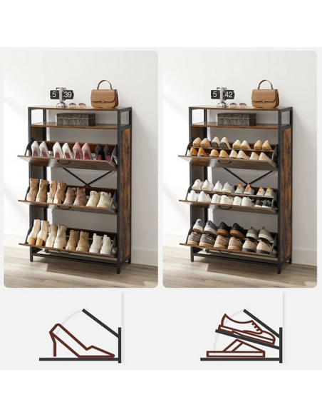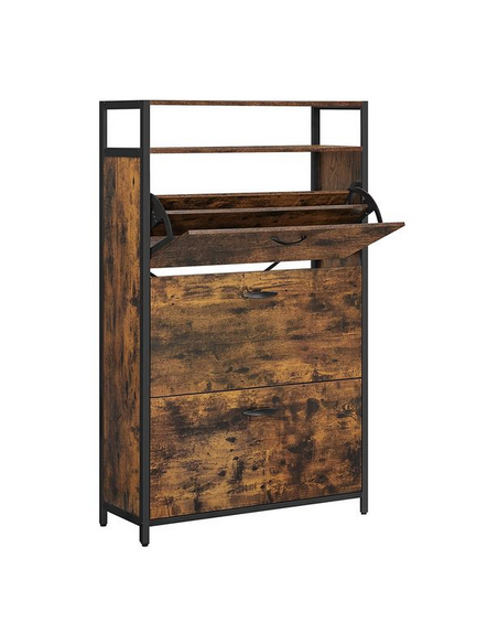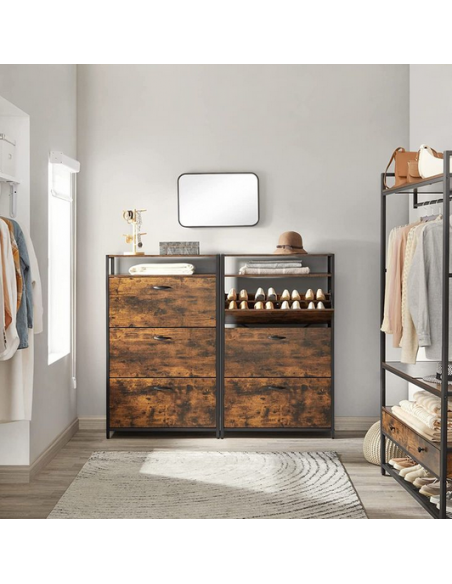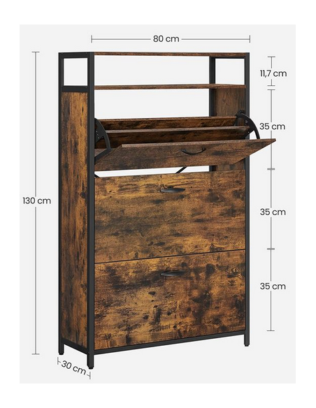 Skoskab udført i et design af sortlakeret metal og brun møbelplade. Skoskabet måler 130 cm i højden og 80 x 30 cm i bredde og dybde.