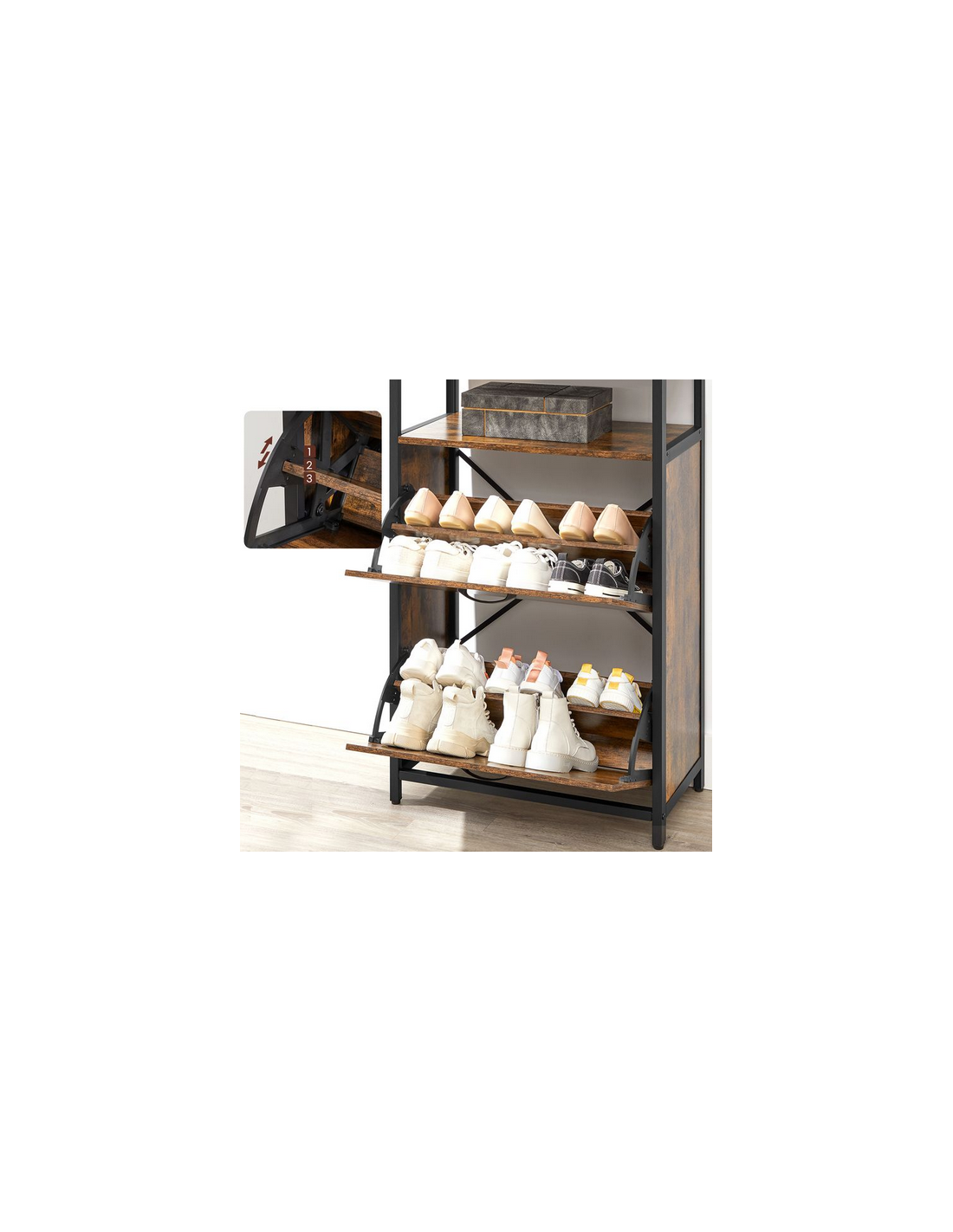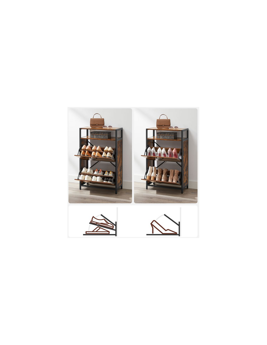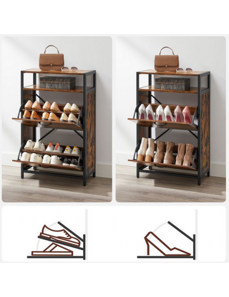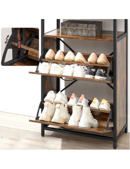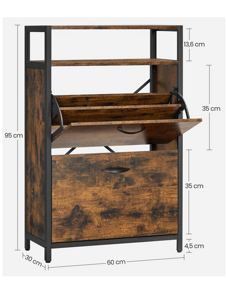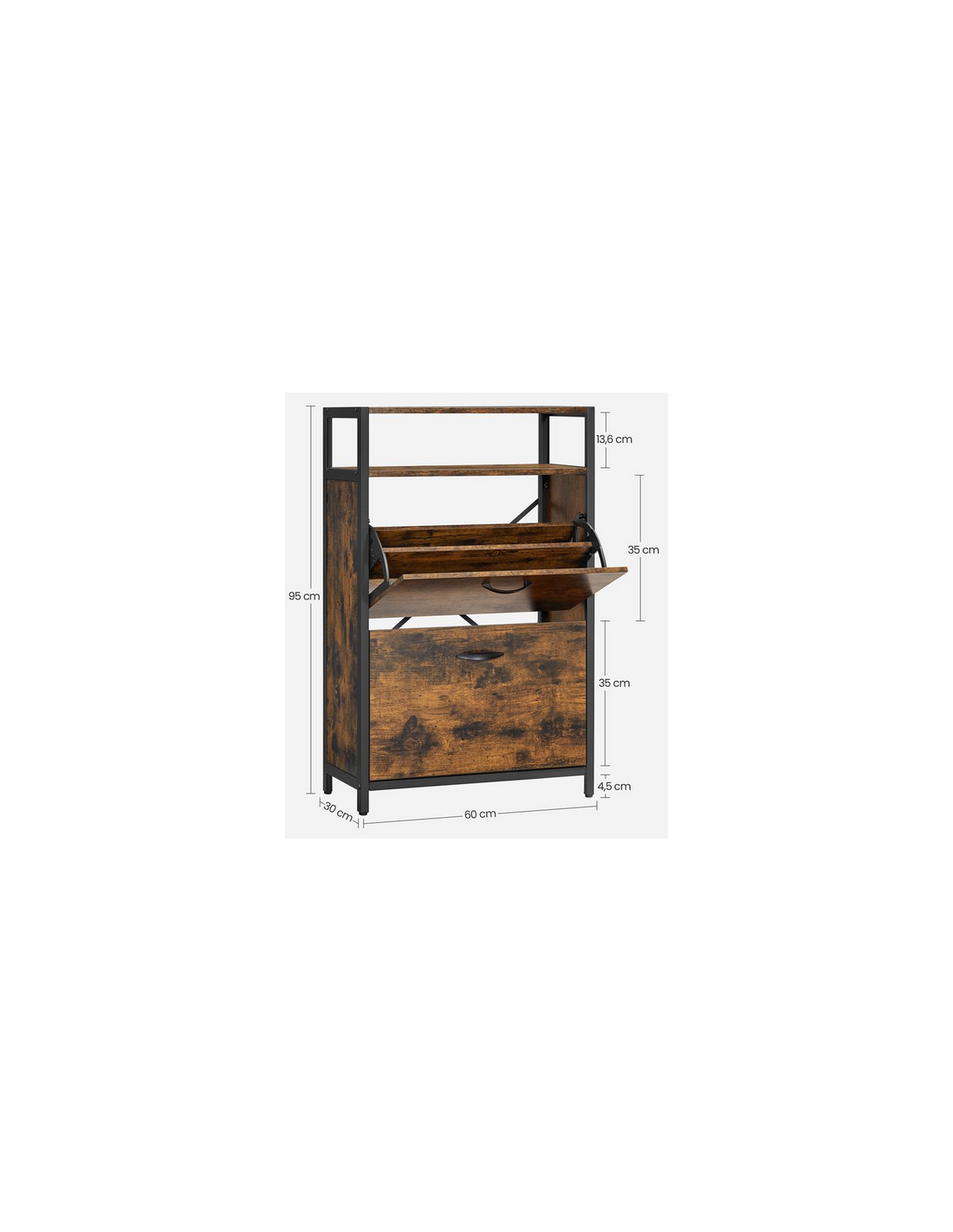 Skoskab udført i et design af sortlakeret metal og brun møbelplade. Skoskabet måler 95 cm i højden og 60 x 30 cm i bredde og dybde.