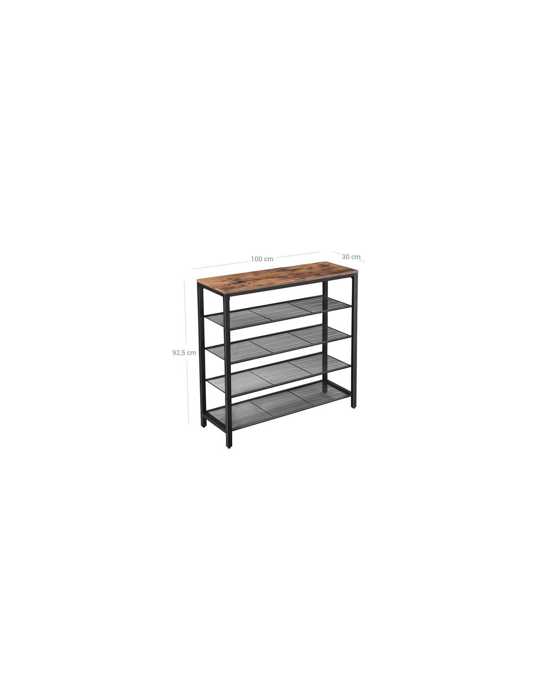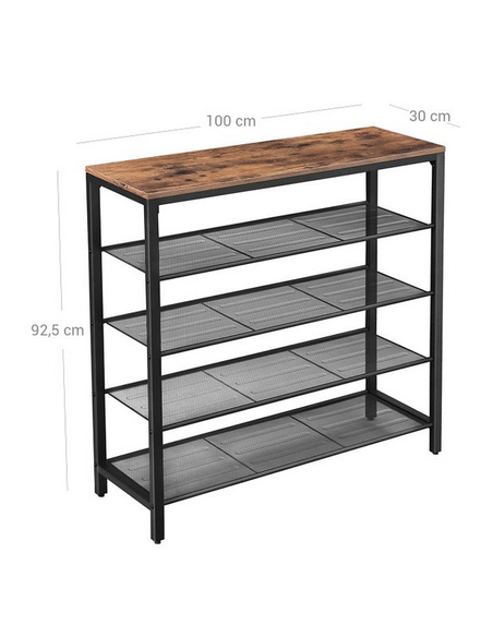 Skoreol udført i et design af sortlakeret metal og brun møbelplade. Skoreolen måler 92,5 cm i højden og 100 x 30 cm i bredde og dybde.