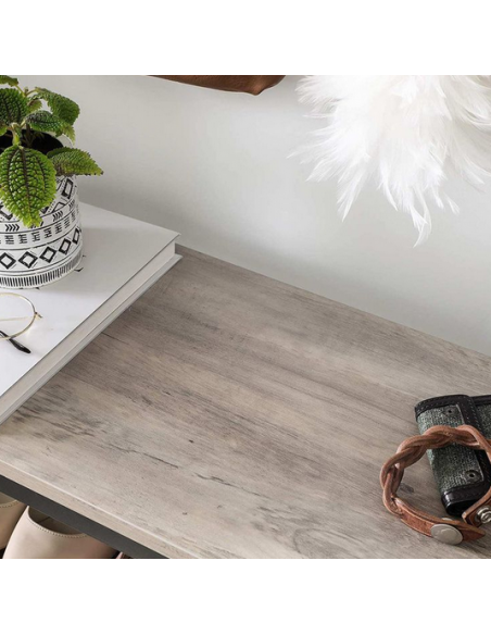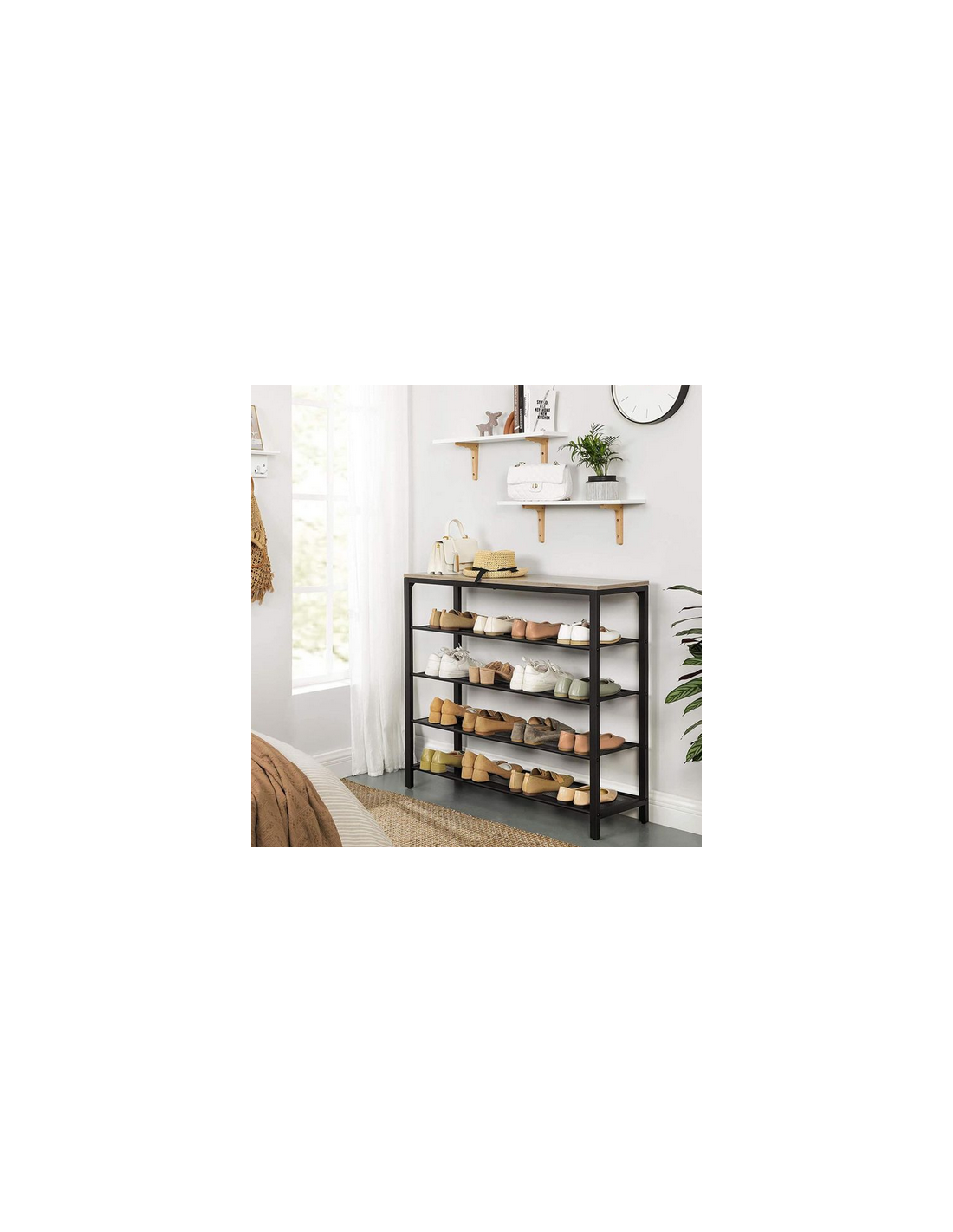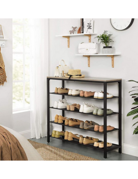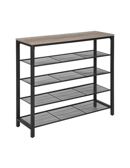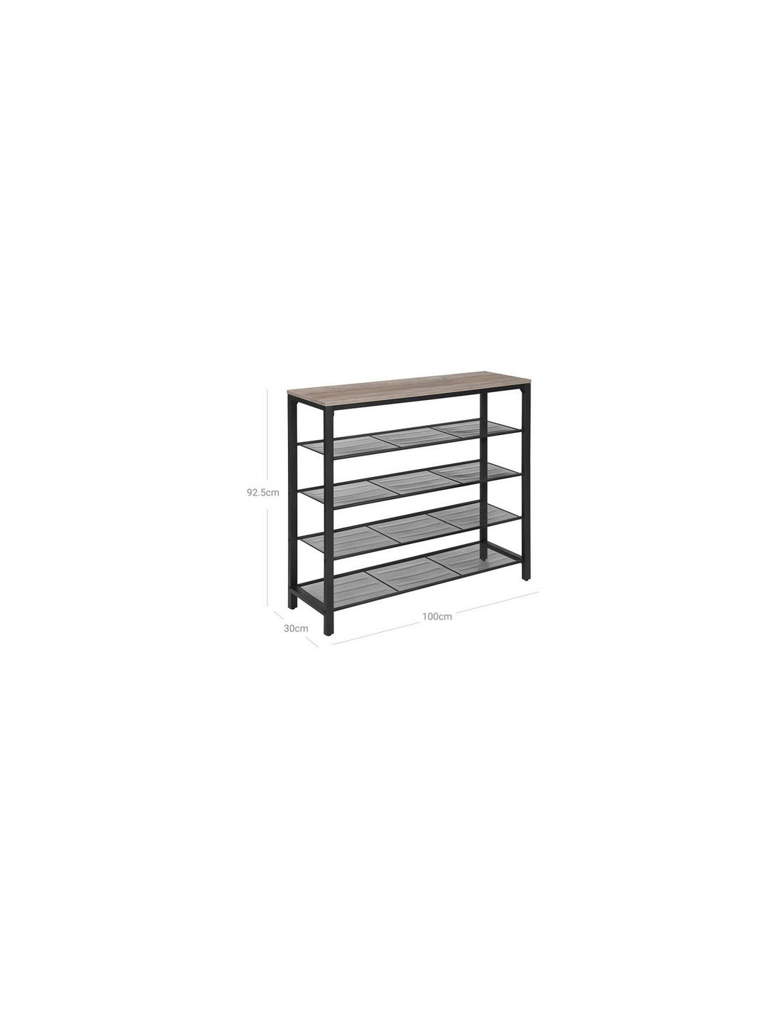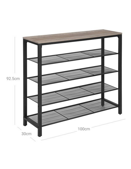Skoreol udført i et design af sortlakeret metal og grå møbelplade. Skoreolen måler 92,5 cm i højden og 100 x 30 cm i bredde og dybde.