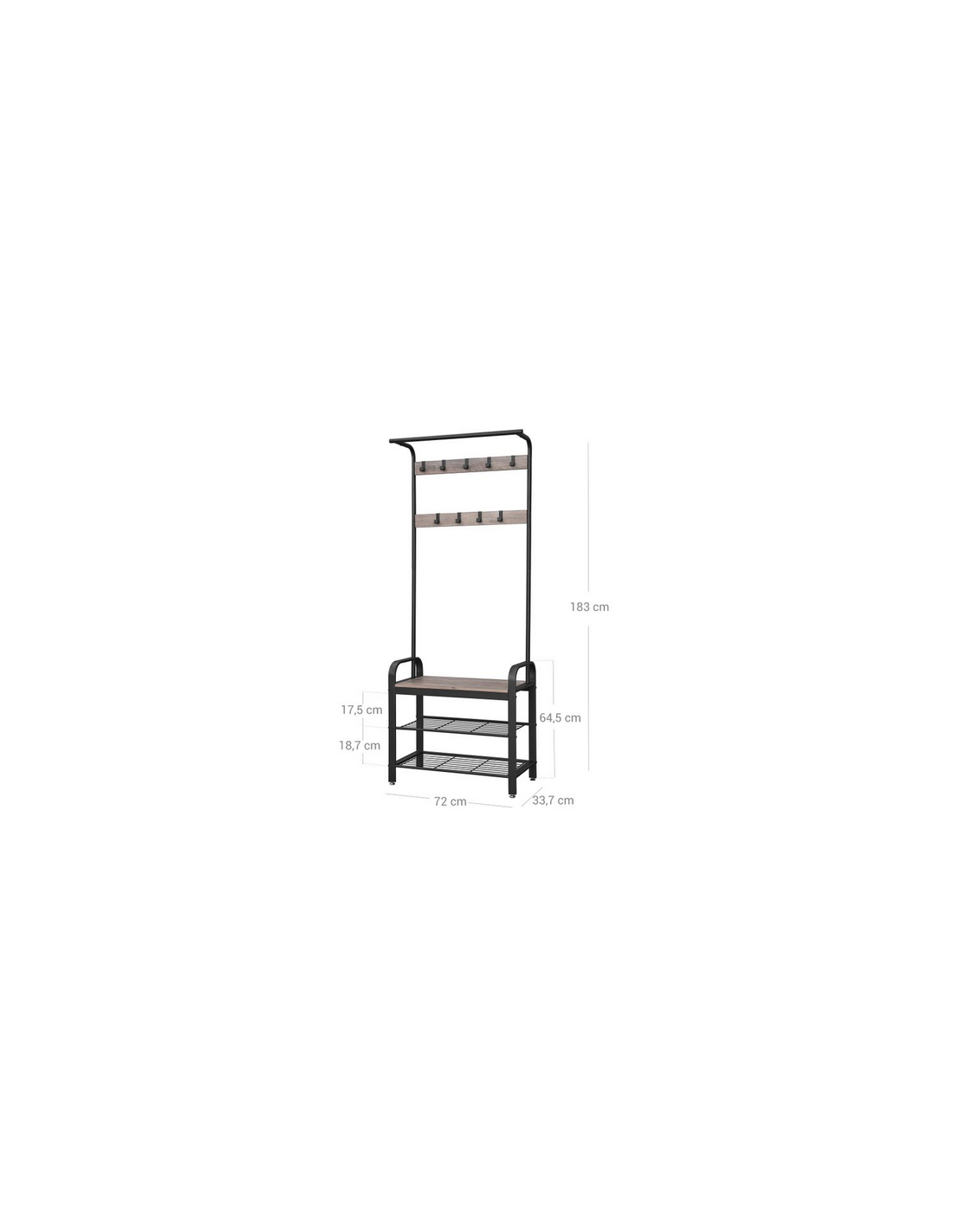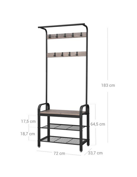 Garderobe udført i et design af sortlakeret metal og grå møbelplade. Garderoben måler 183 cm i højden og 72 x 33,7 cm i bredde og dybde.