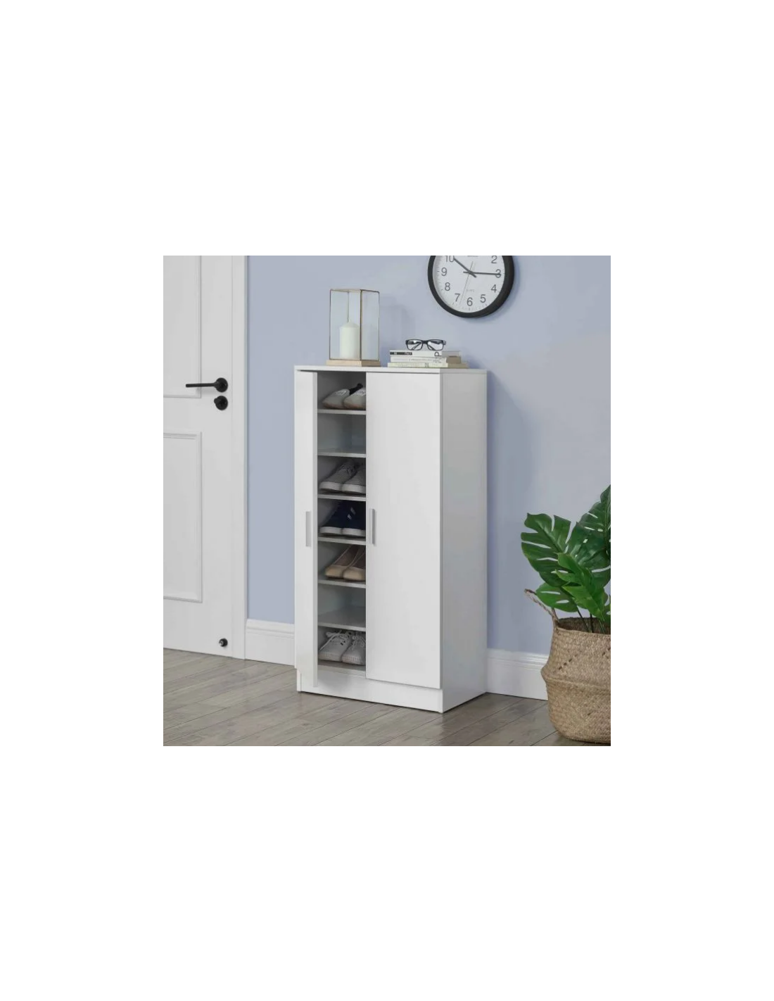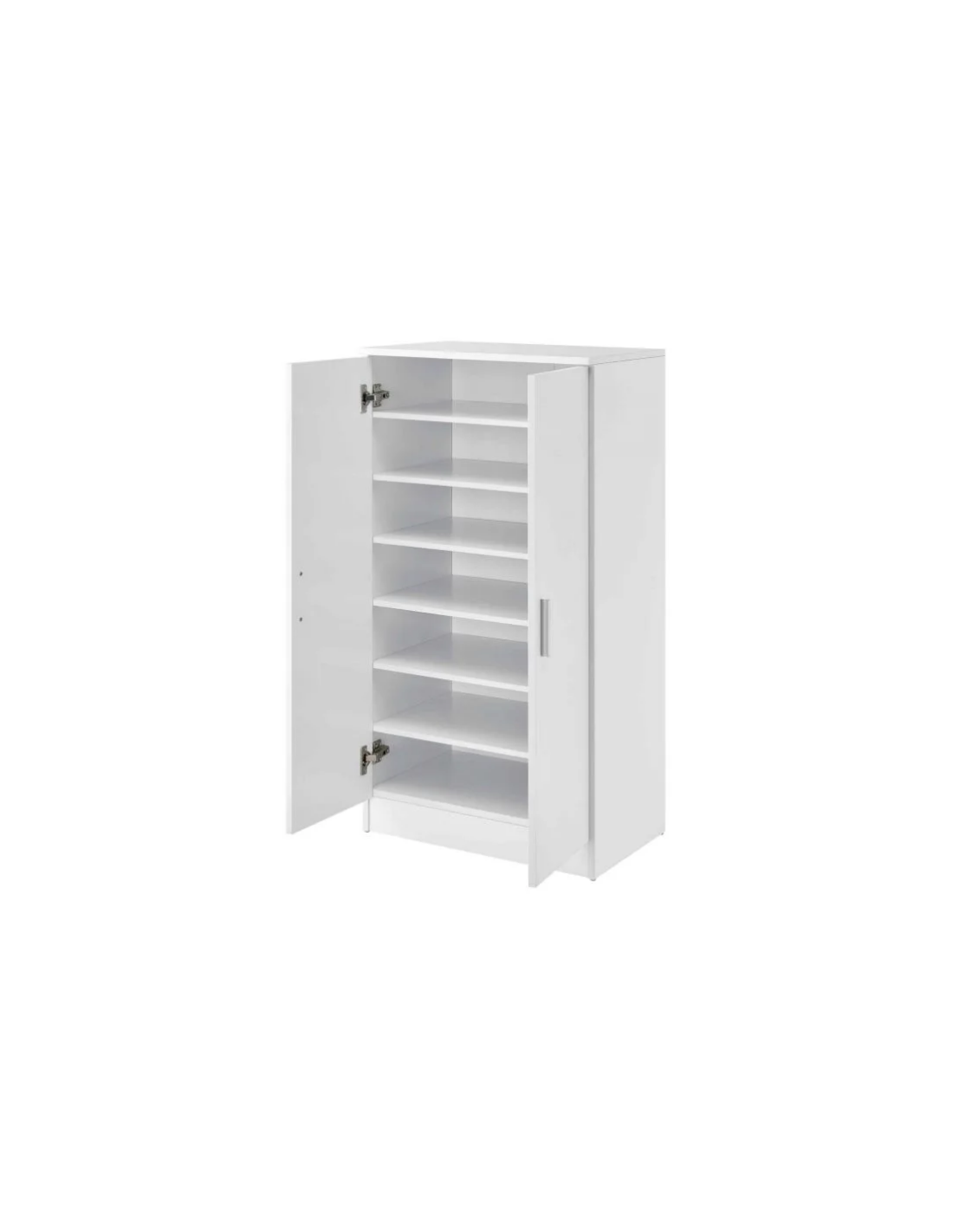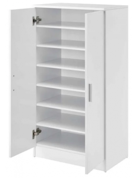Skoskab udført i et design af hvid møbelplade. Skoskabet måler 108 cm i højden og 55 x 35 cm i bredde og dybde.