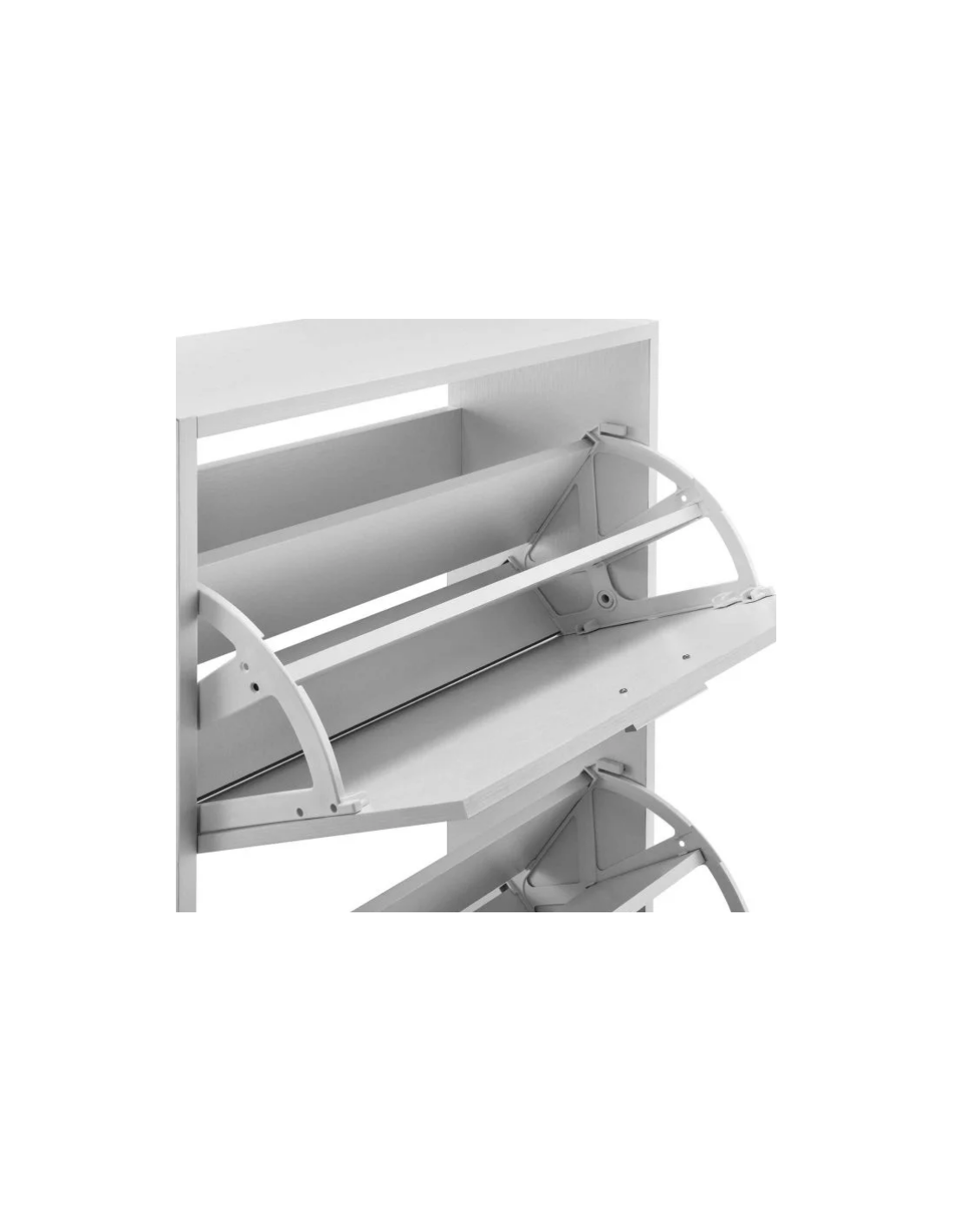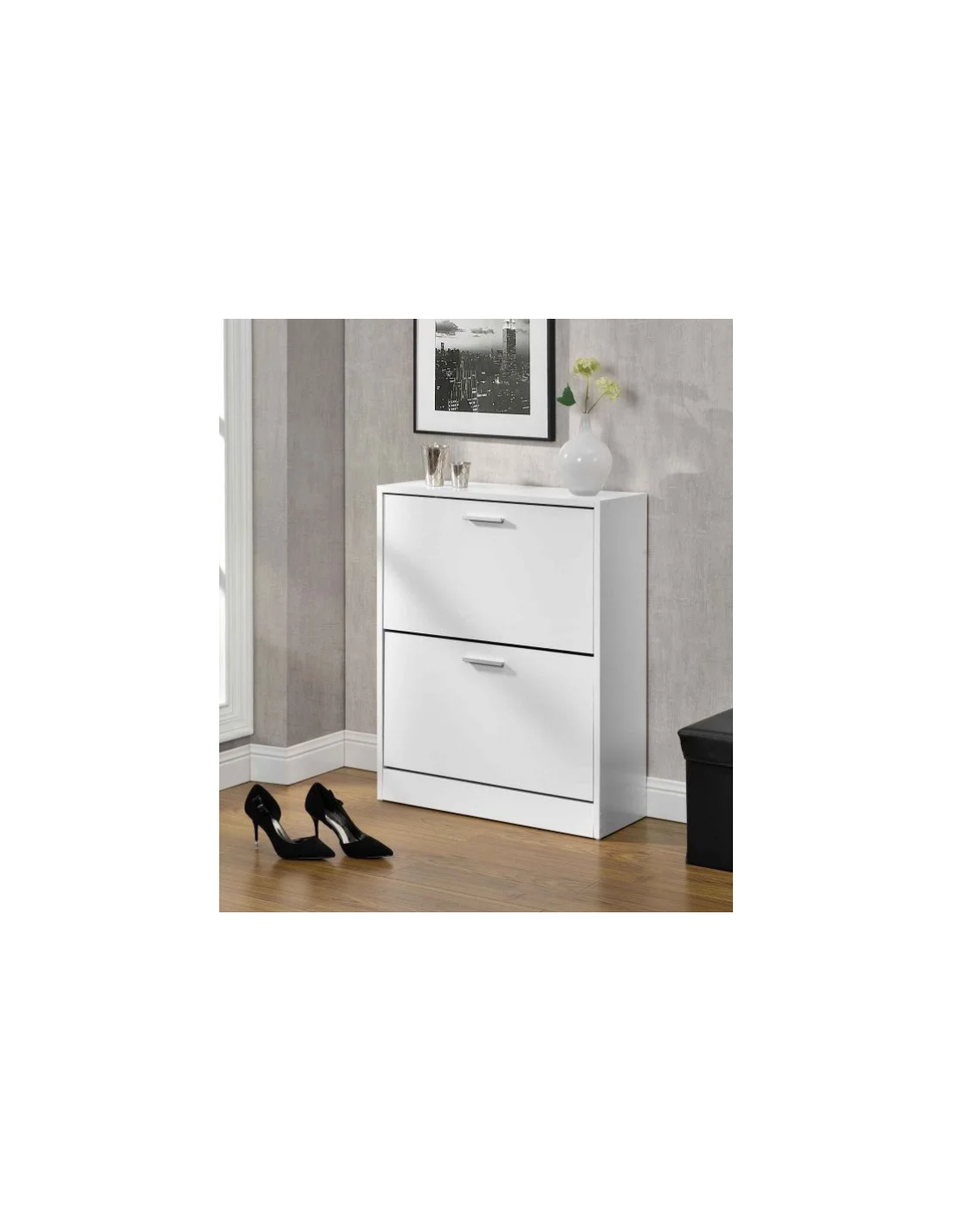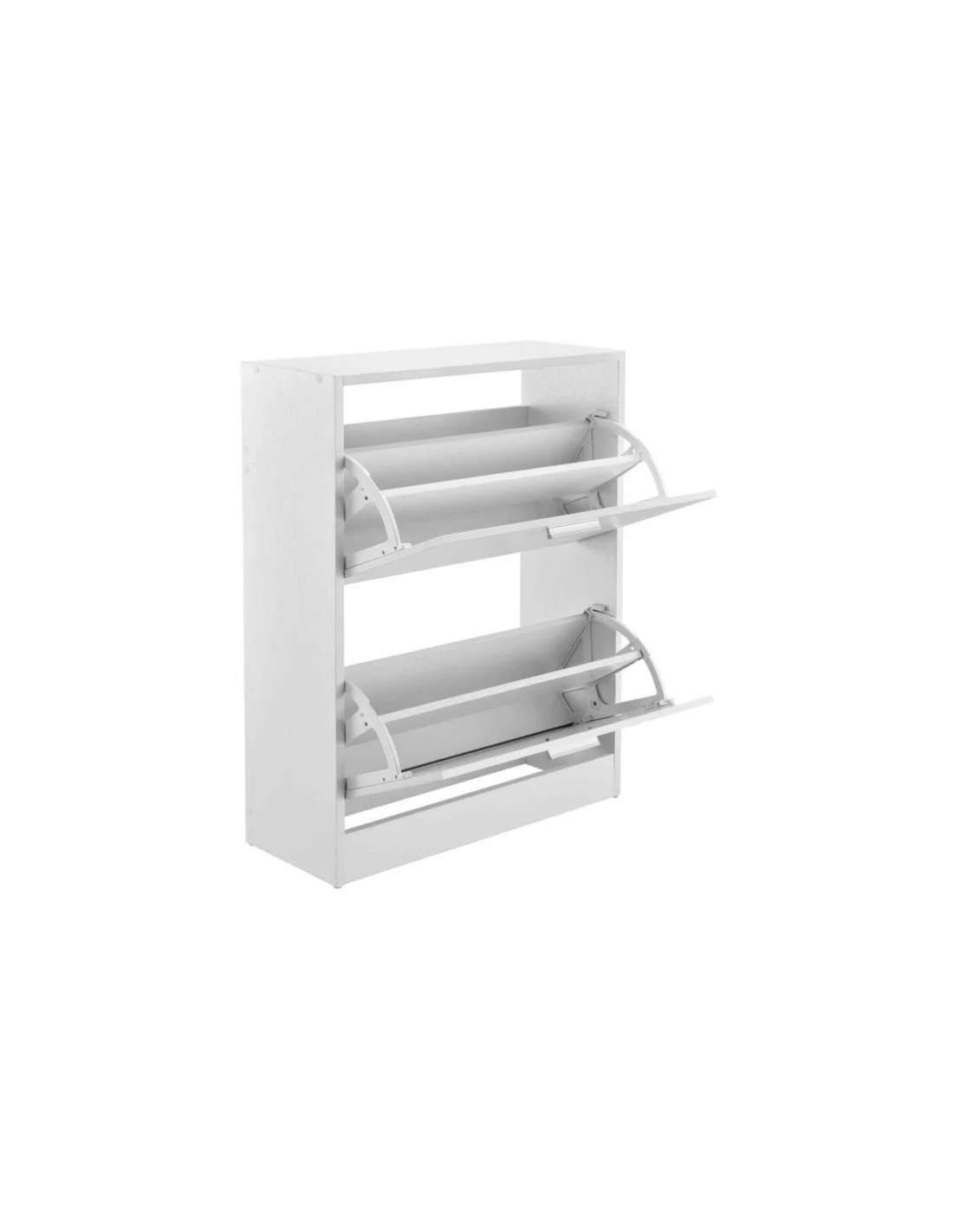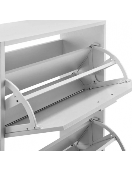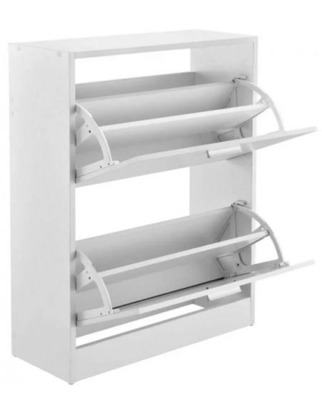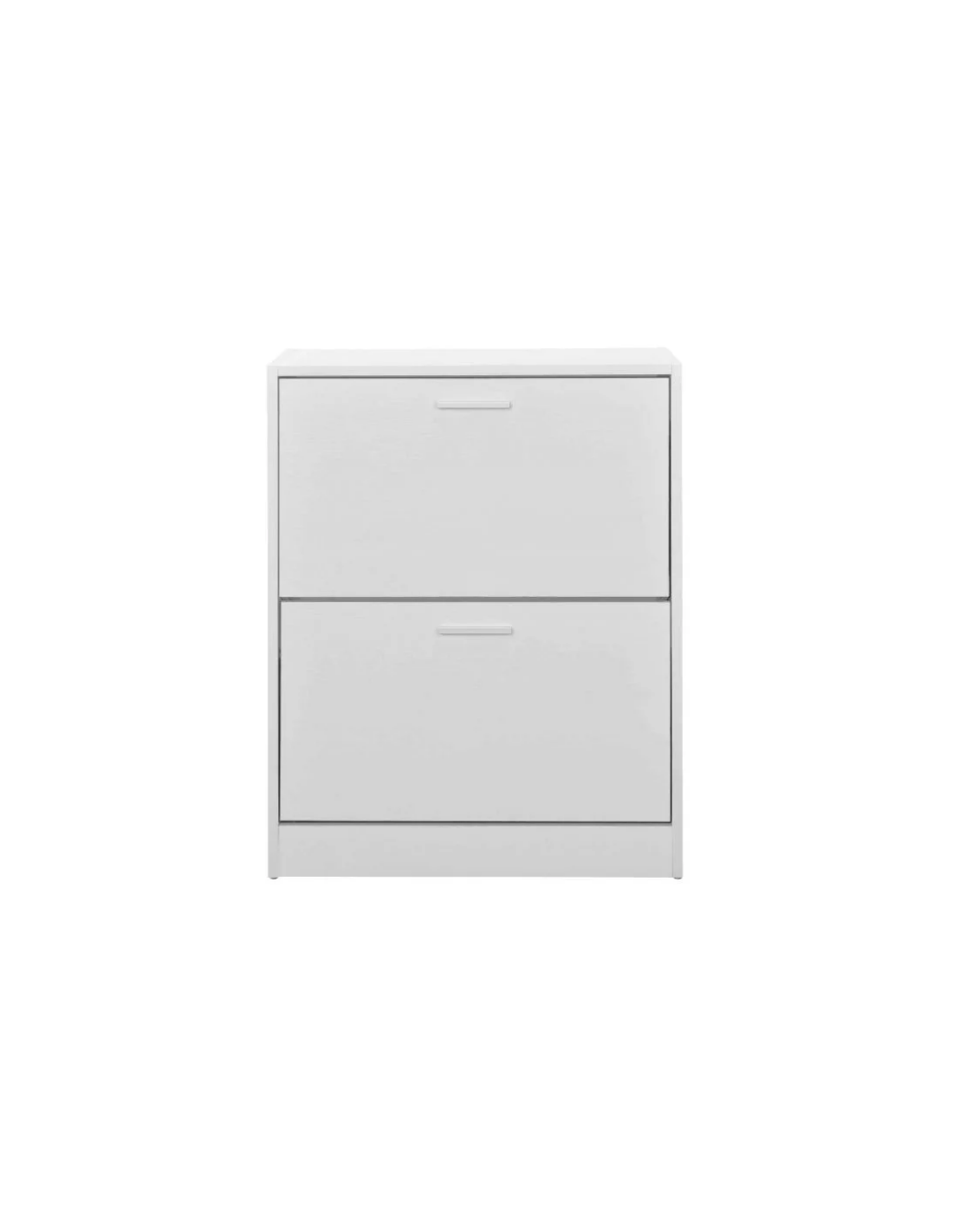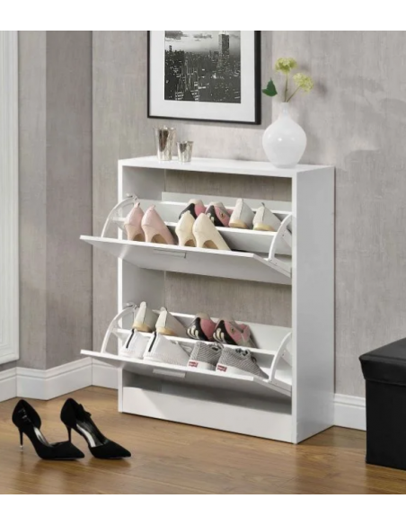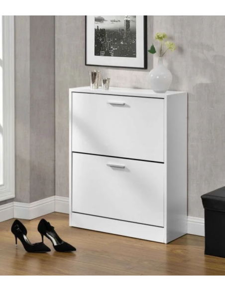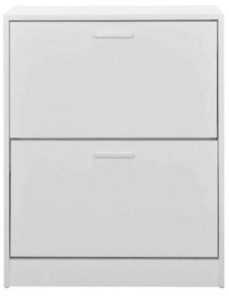 Skoskab udført i et design af hvid møbelplade. Skoskabet måler 81 cm i højden og 63 x 24 cm i bredde og dybde.