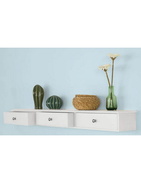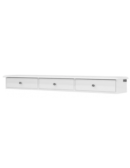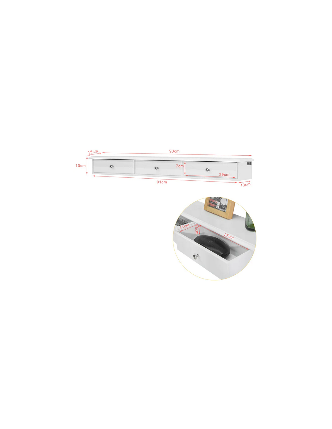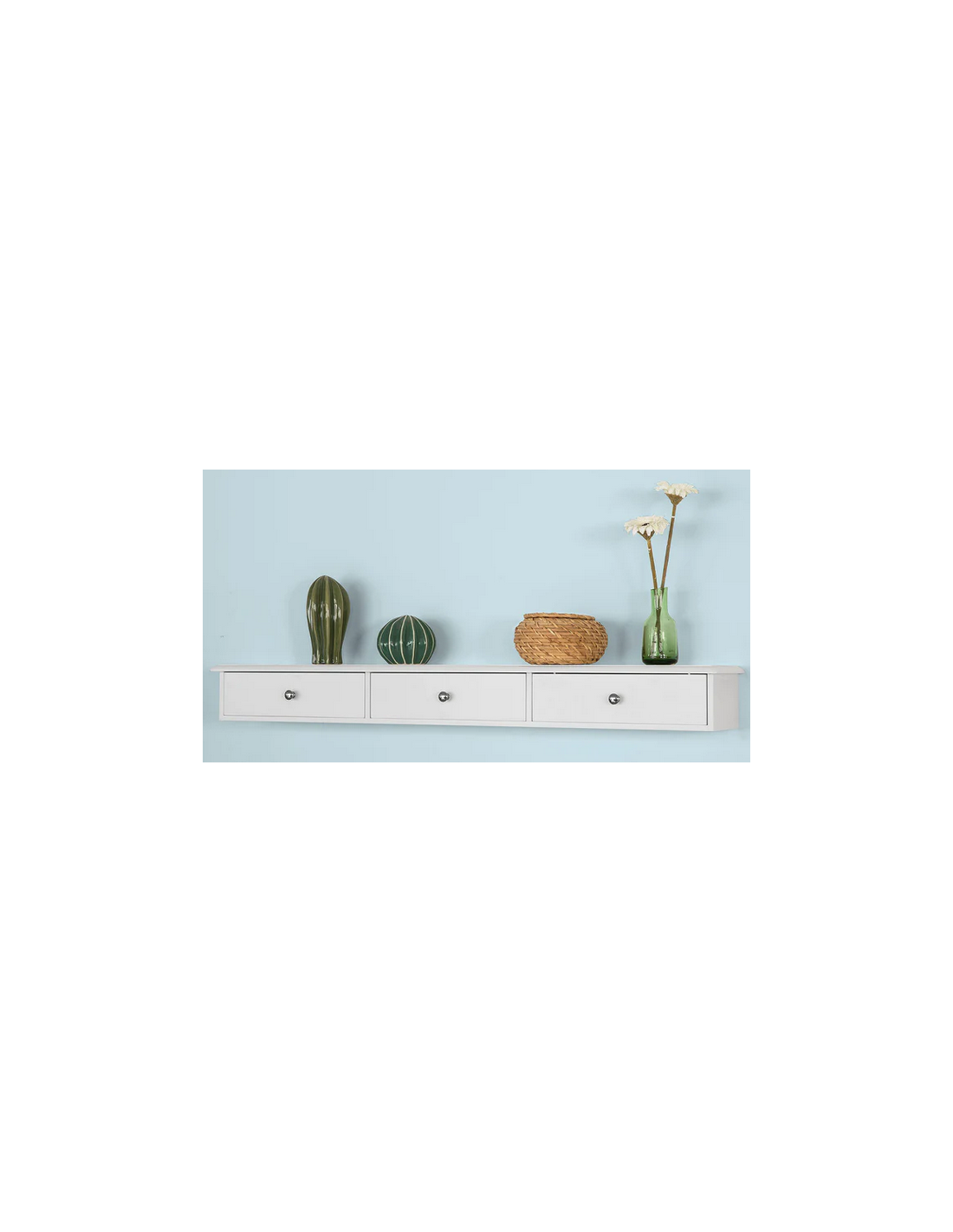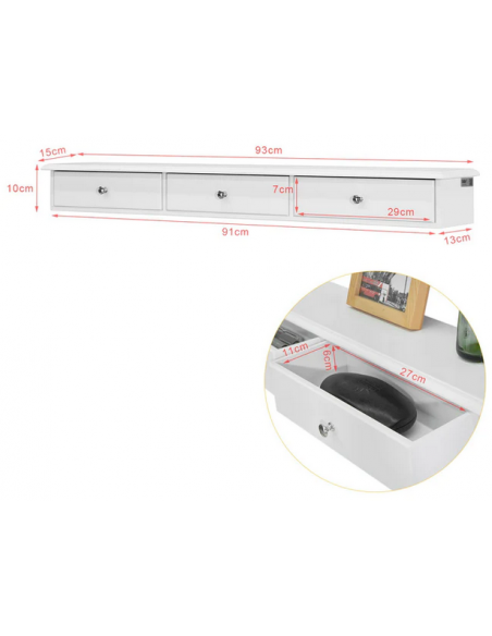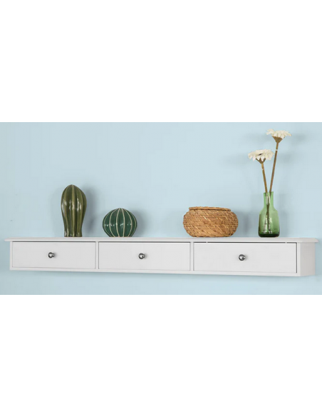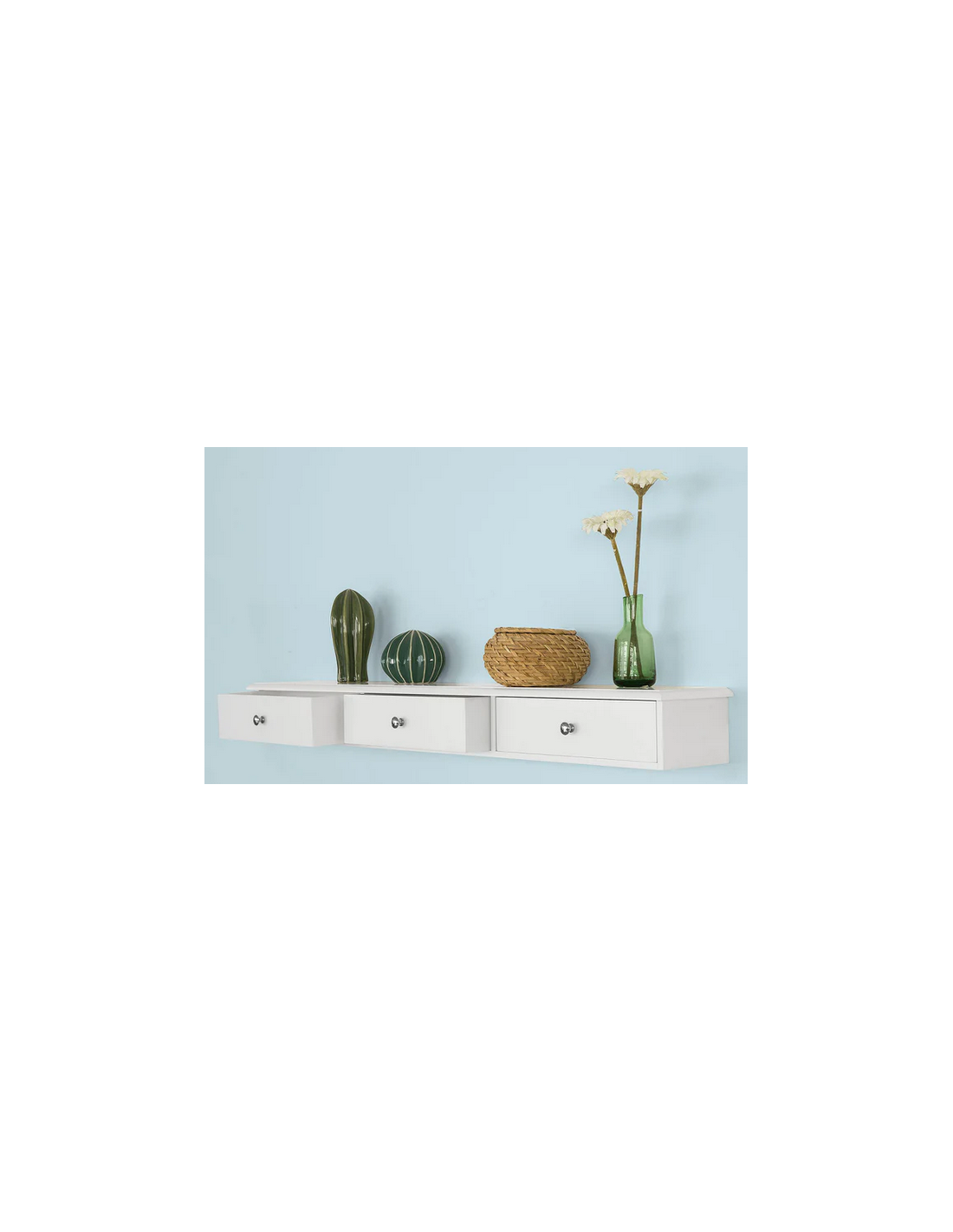 Væghylde med 2 skuffer, udført i et design af hvid møbelplade. Væghylden måler 10 cm i højden og 93 x 15 cm i bredde og dybde og tåler max. belastning på 15 kg.