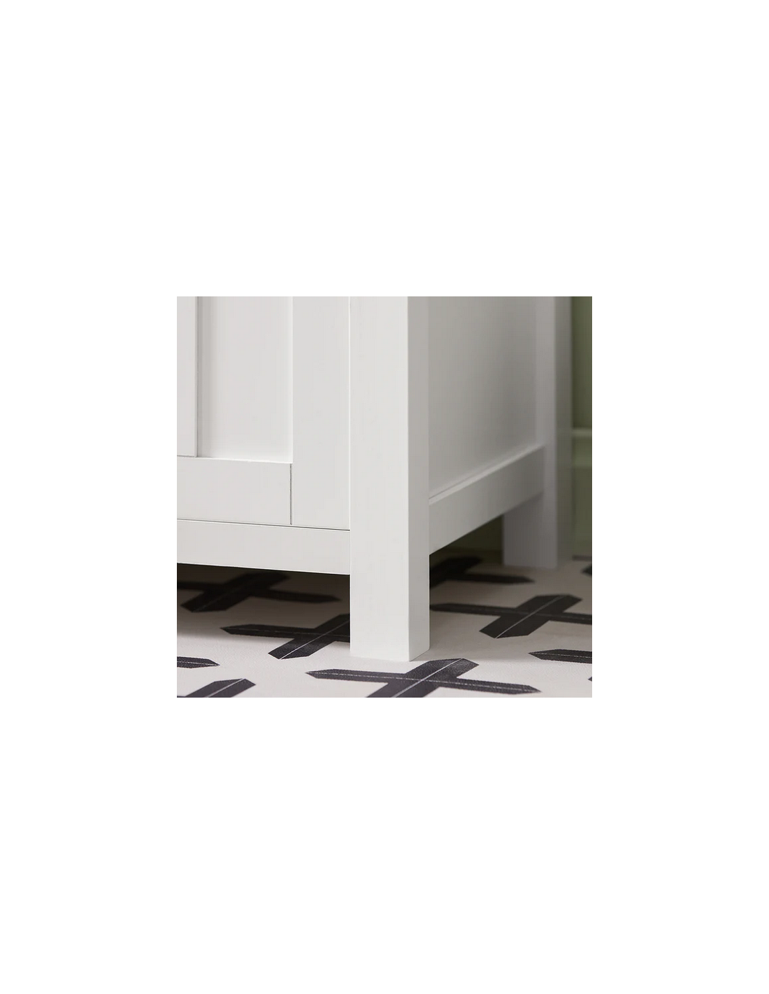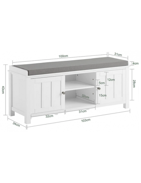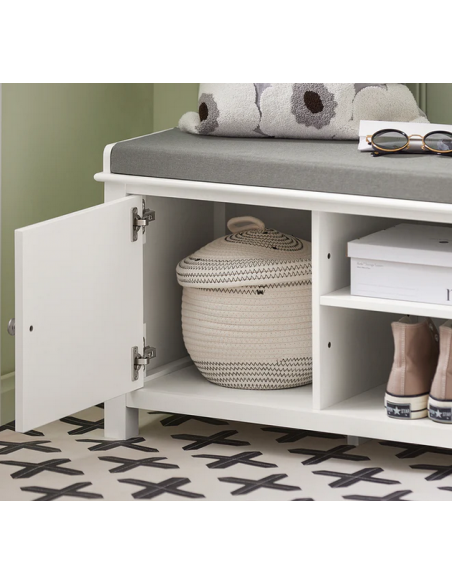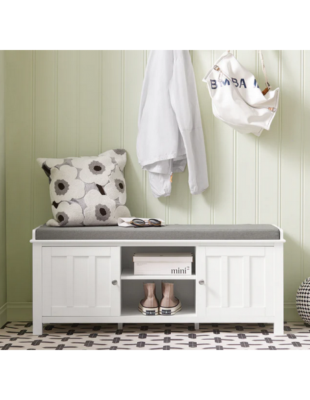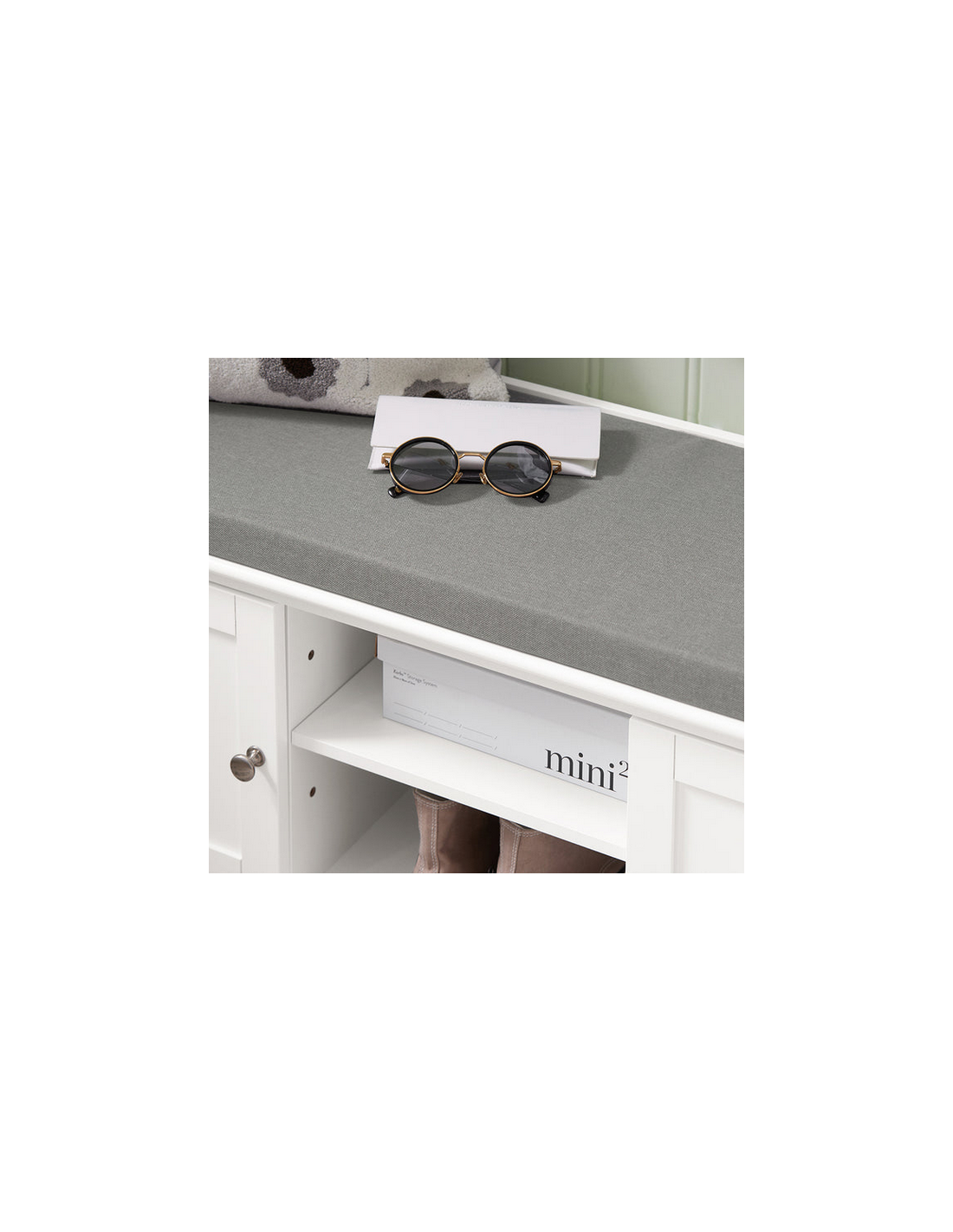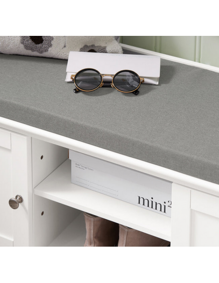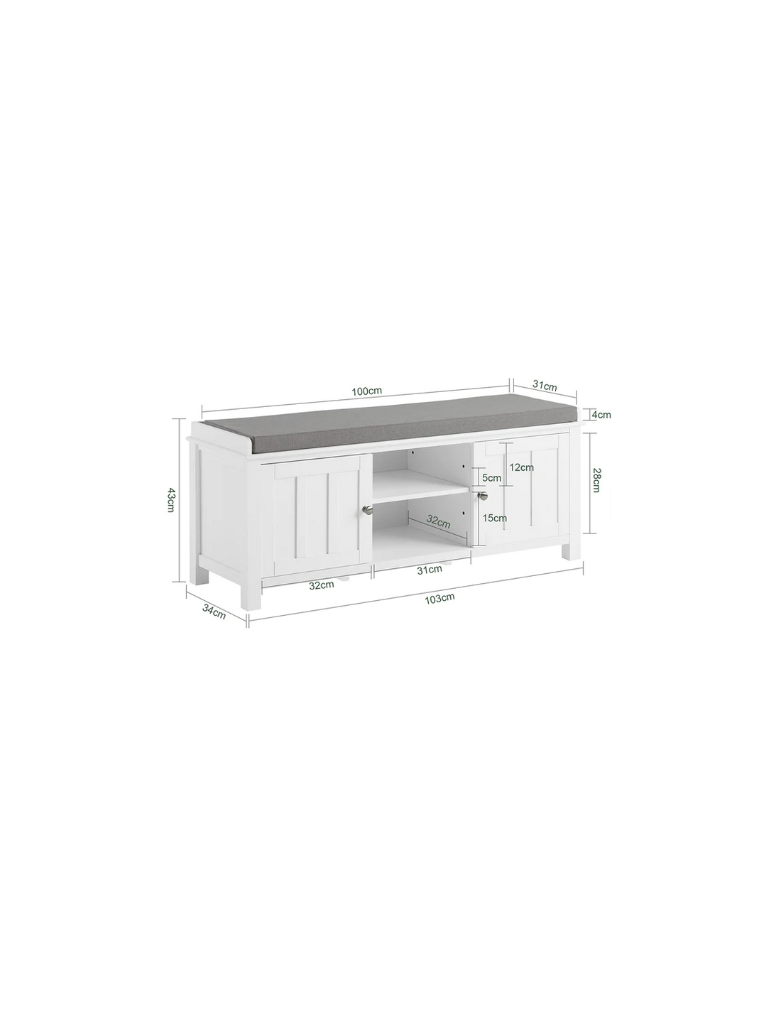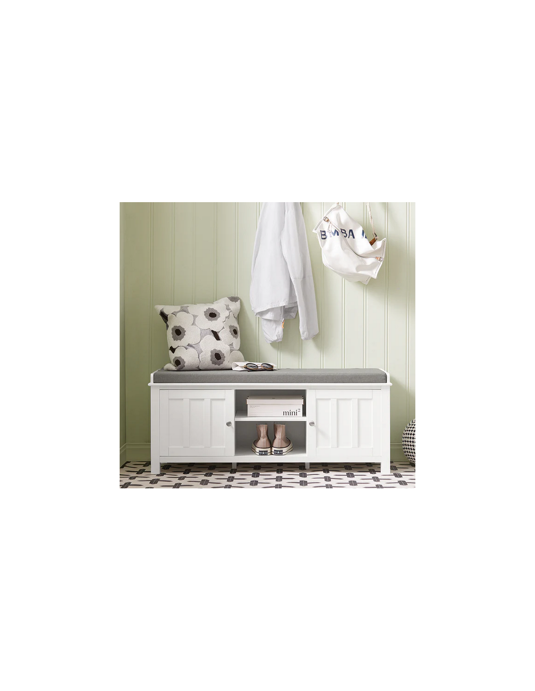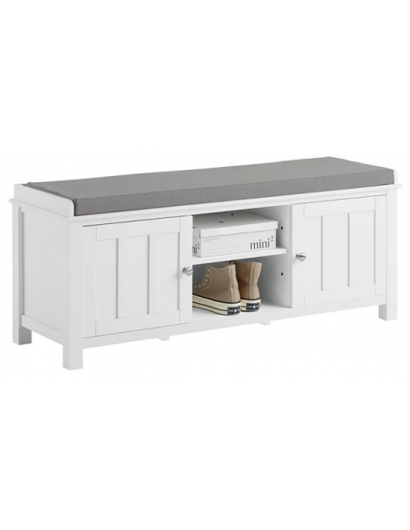Skobænk med hynde, udført i et design af hvid møbelplade og grå polyester. Bænken måler 43 cm i højden og 103 x 36 cm i bredde og dybde.
