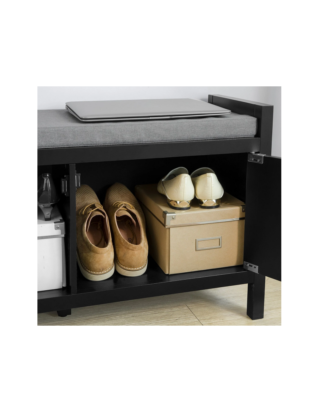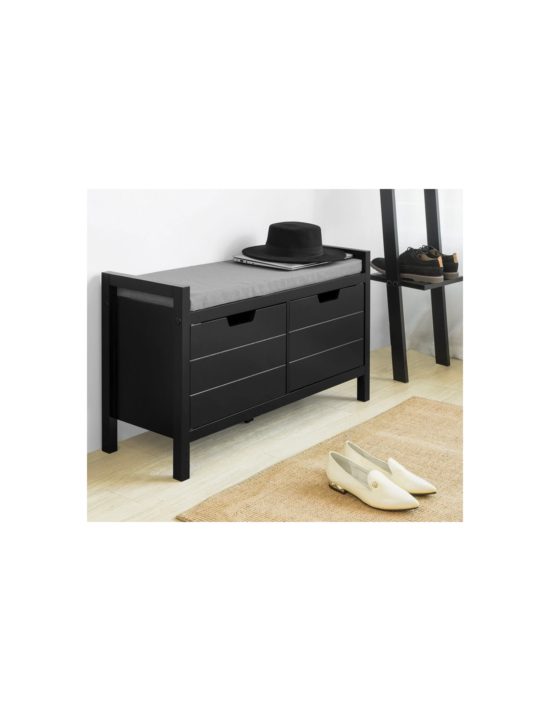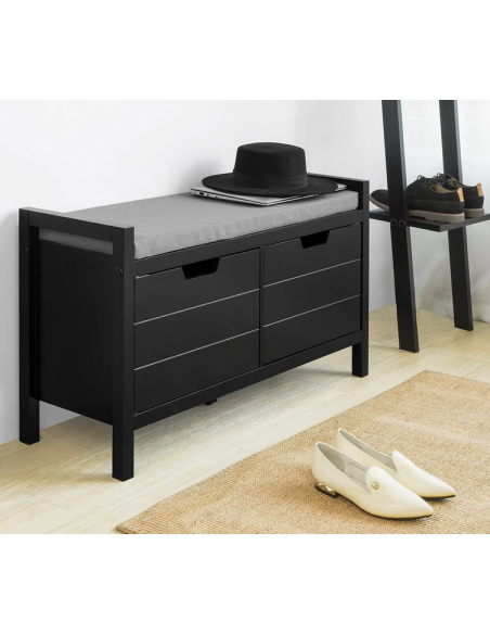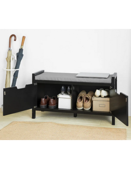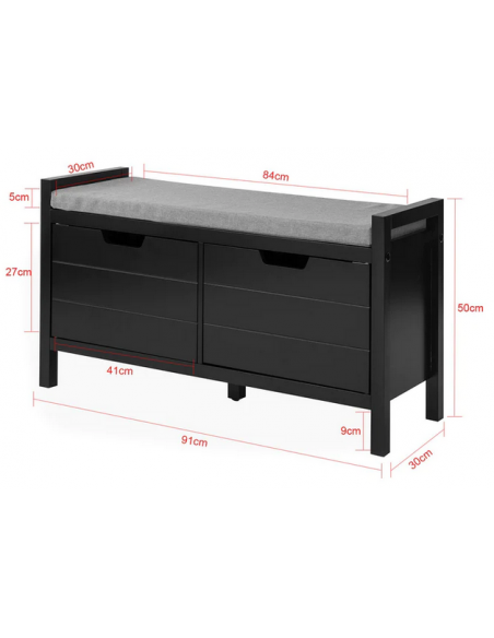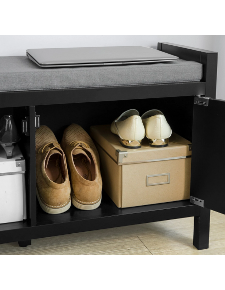 Skobænk med hynde, udført i et design af sort møbelplade og grå polyester. Bænken måler 50 cm i højden og 91 x 30 cm i bredde og dybde.