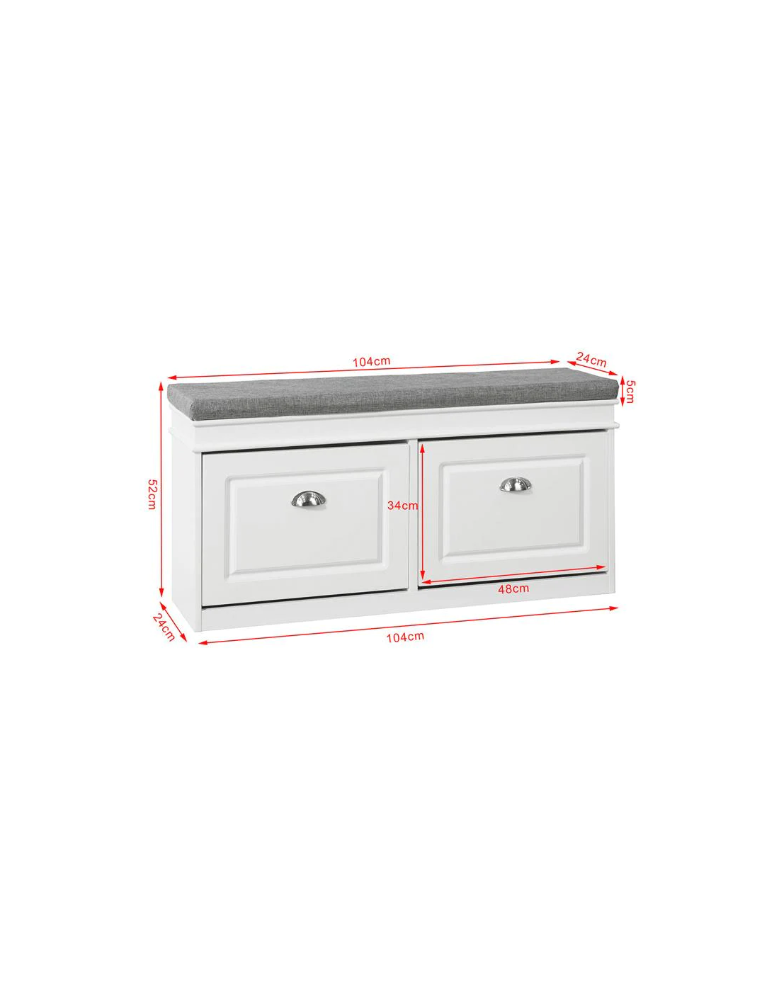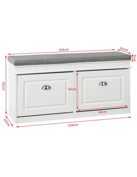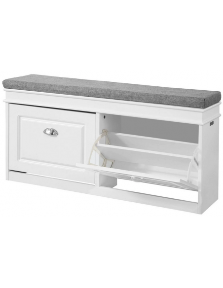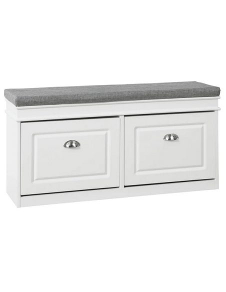 Skobænk med hynde, udført i et design af hvid møbelplade og grå polyester. Bænken måler 52 cm i højden og 104 x 24 cm i bredde og dybde.