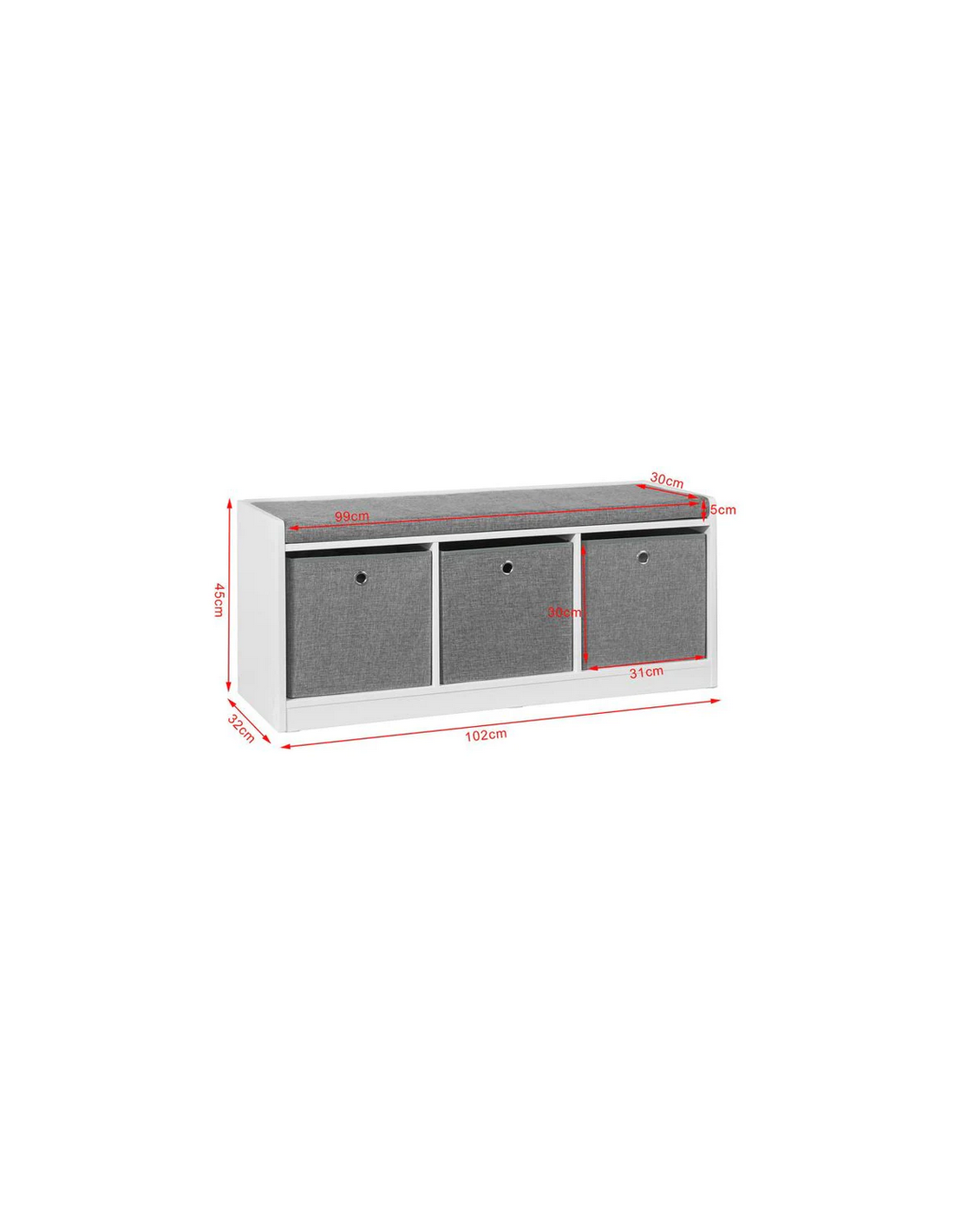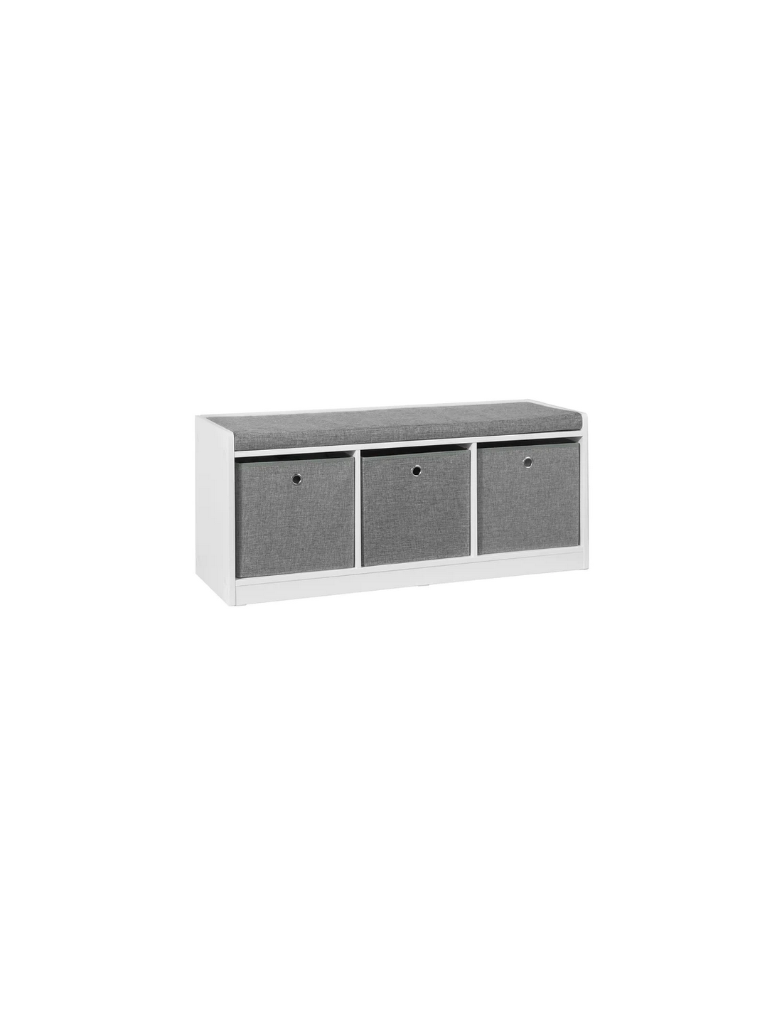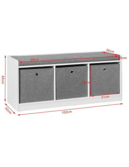 Skobænk med hynde, udført i et design af hvid møbelplade og grå polyester. Bænken måler 45 cm i højden og 102 x 32 cm i bredde og dybde.