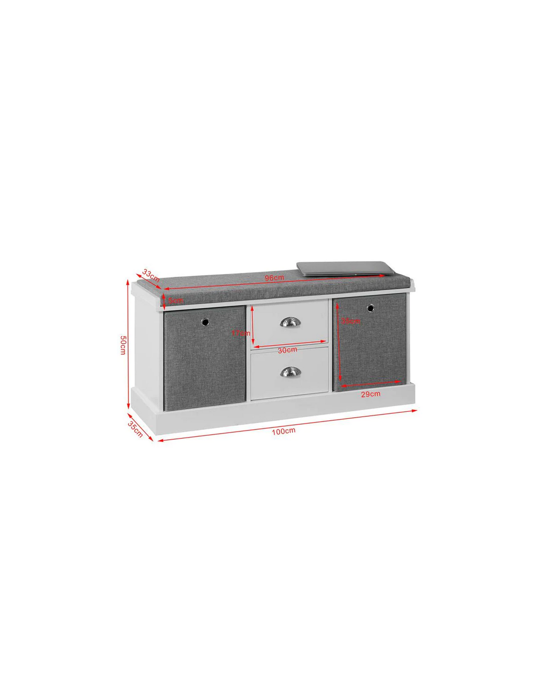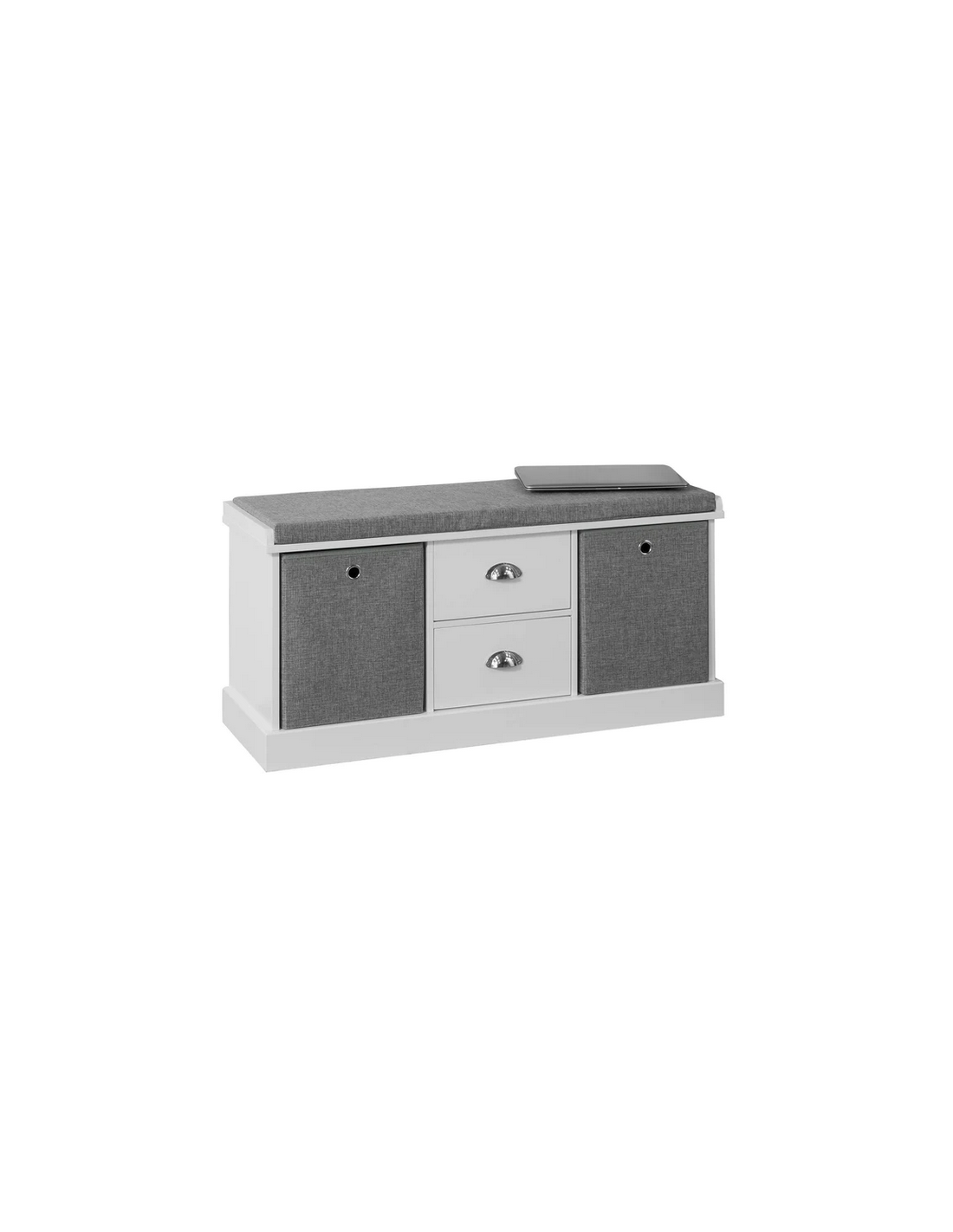 Skobænk med hynde, udført i et design af hvid møbelplade og grå polyester. Bænken måler 50 cm i højden og 100 x 35 cm i bredde og dybde.