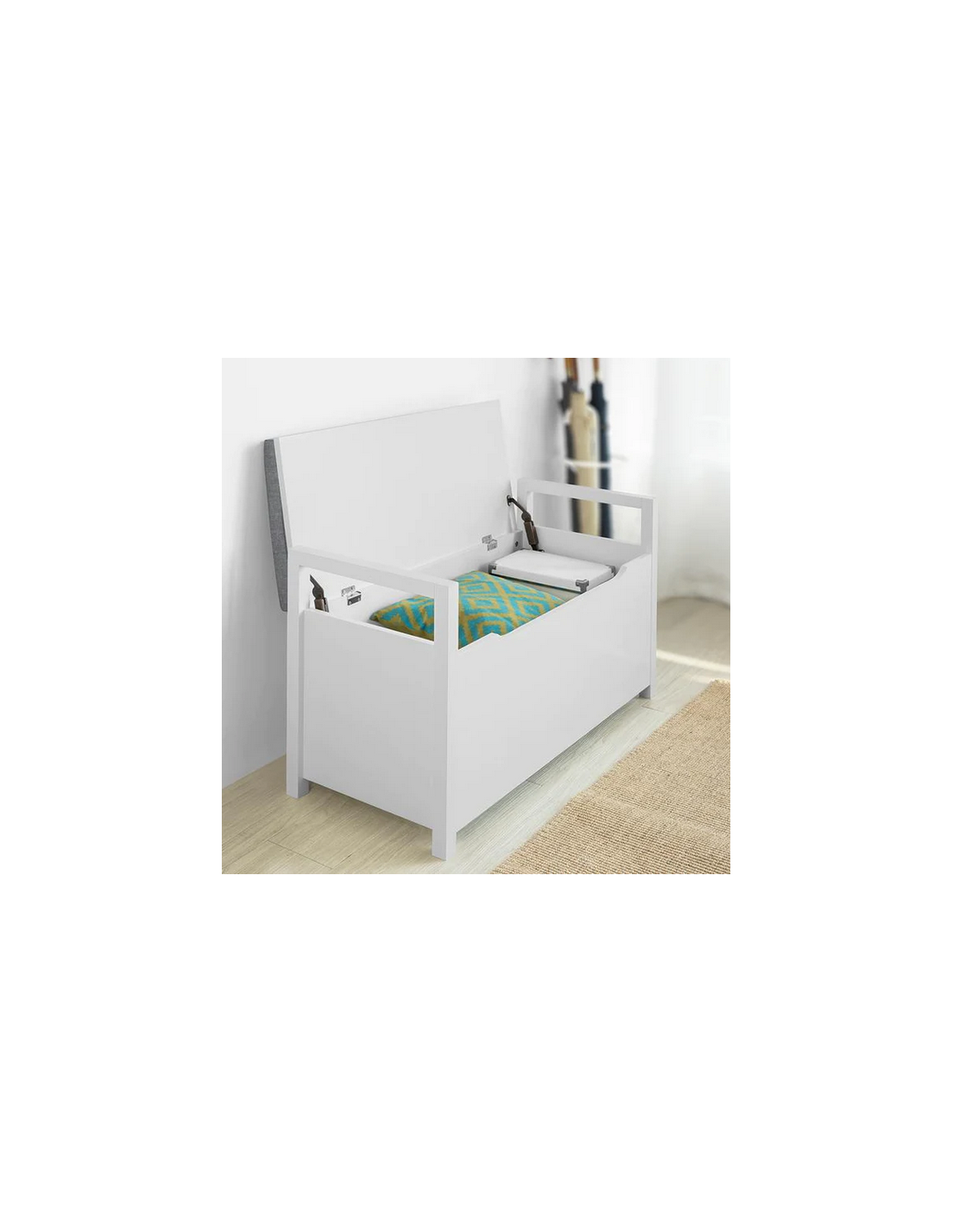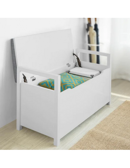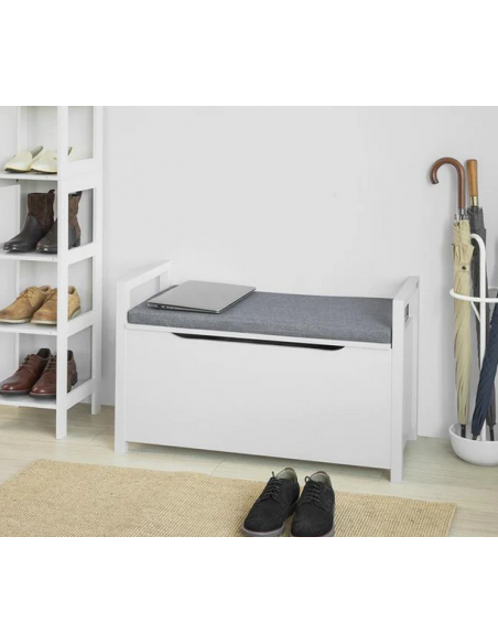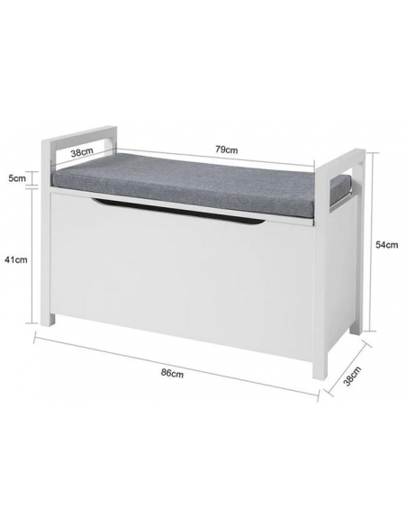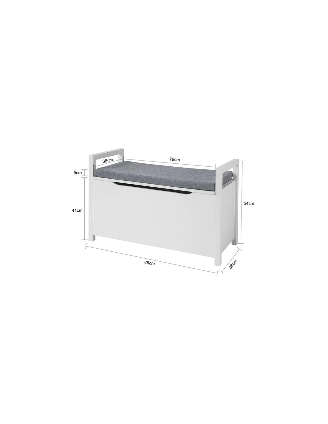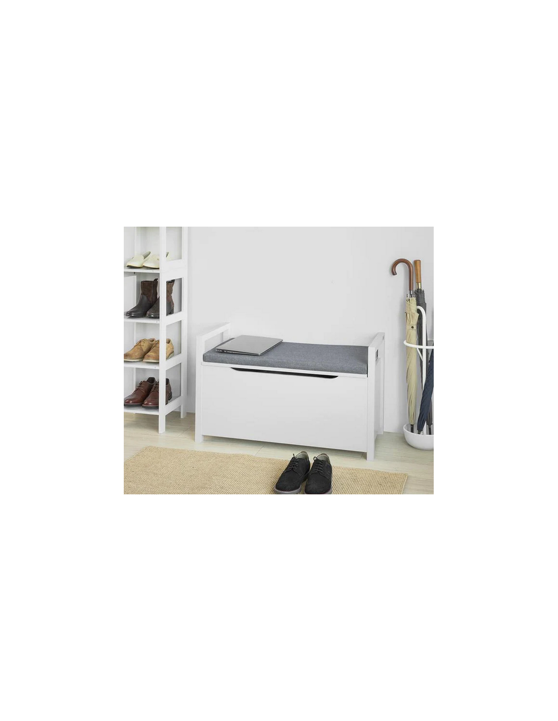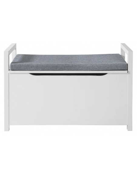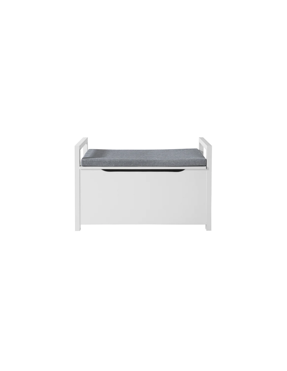 Skobænk med hynde, udført i et design af hvid møbelplade og grå polyester. Bænken måler 54 cm i højden og 86 x 38 cm i bredde og dybde.