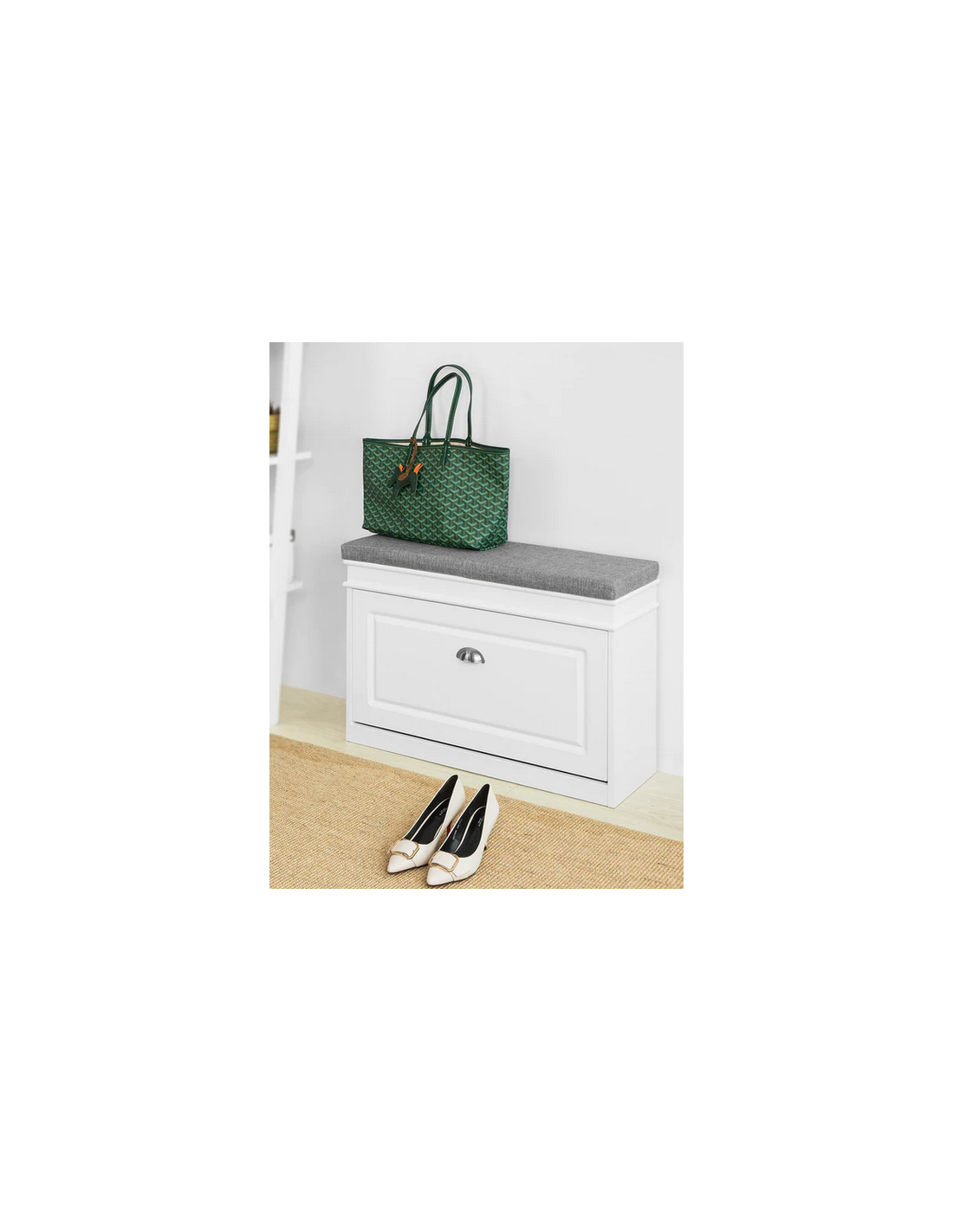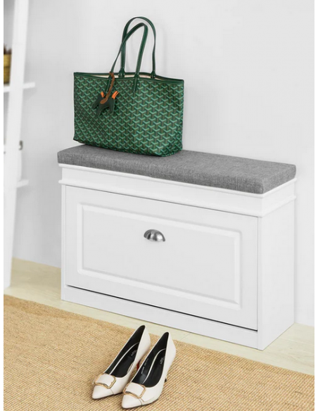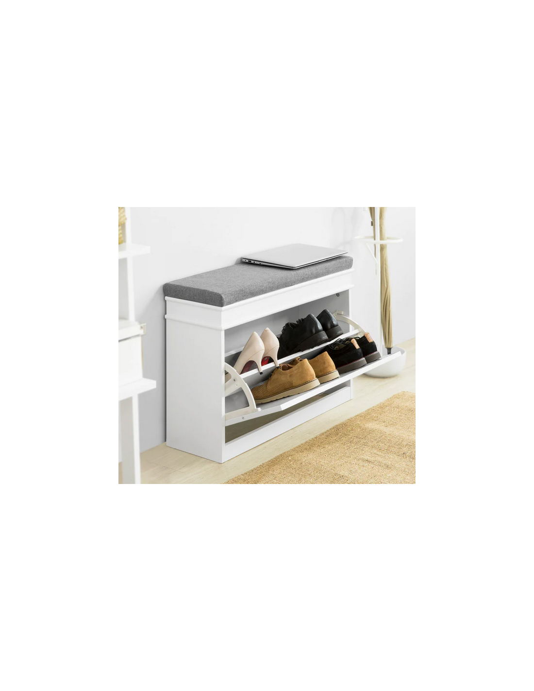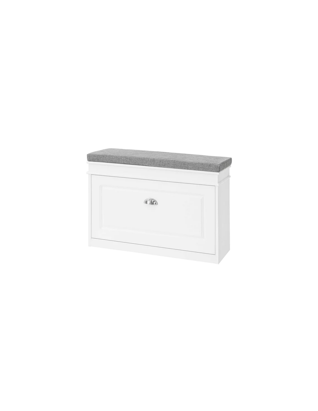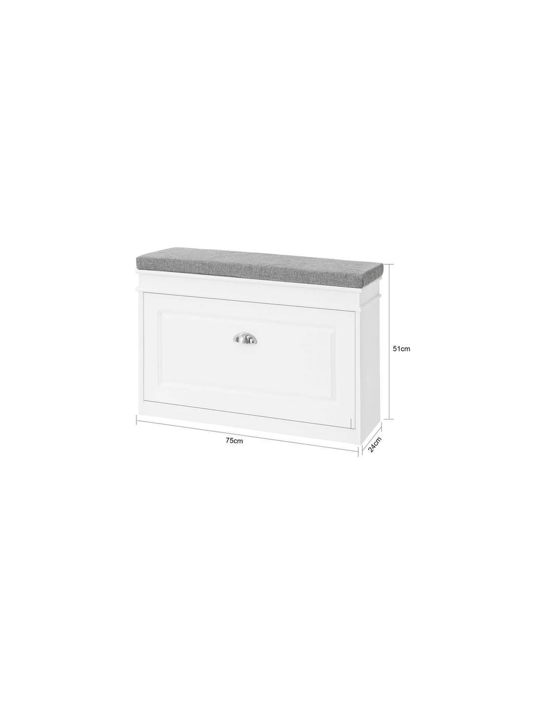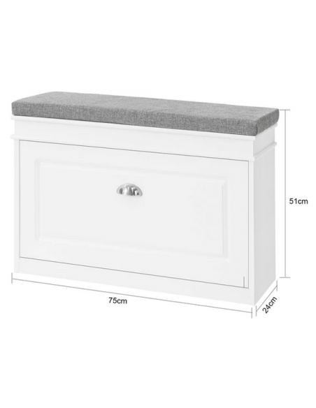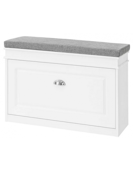 Skobænk med hynde, udført i et design af hvid møbelplade og grå polyester. Bænken måler 51 cm i højden og 75 x 24 cm i bredde og dybde.