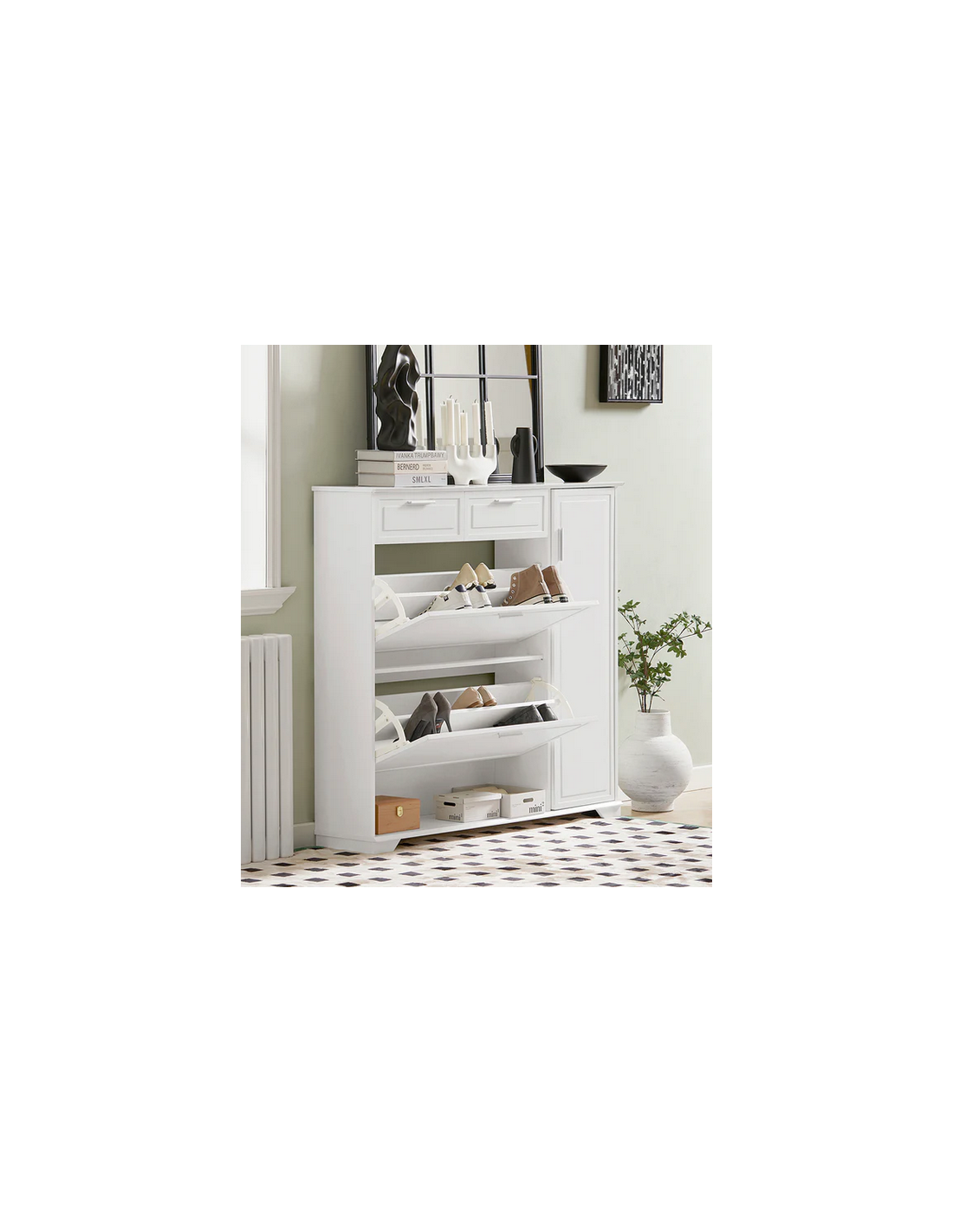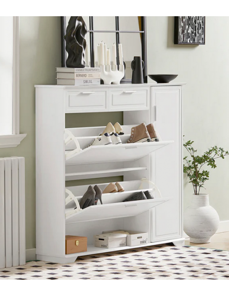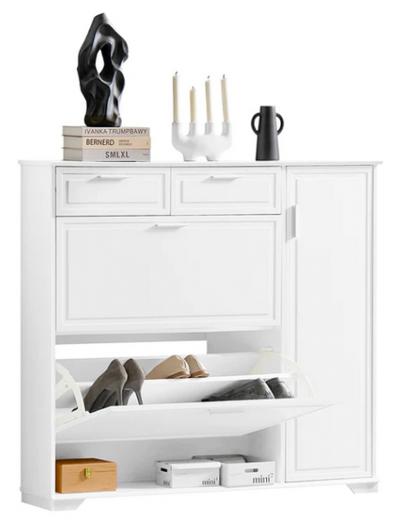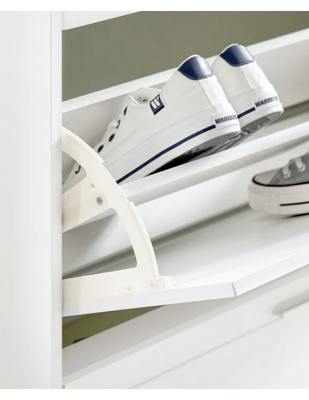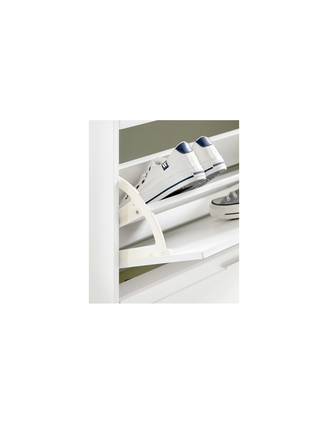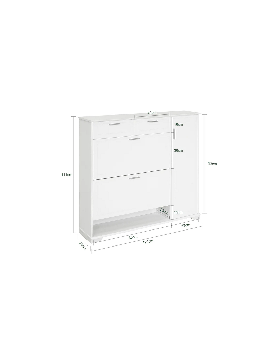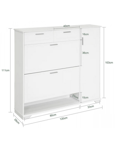 Skoskab udført i et design af hvid møbelplade. Skoskabet måler 111 cm i højden og 120 x 26 cm i bredde og dybde.