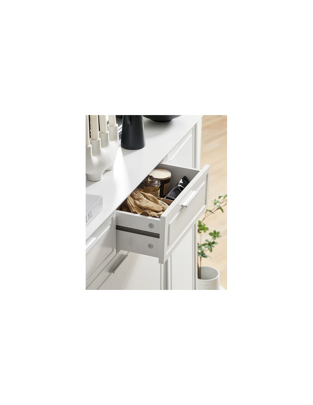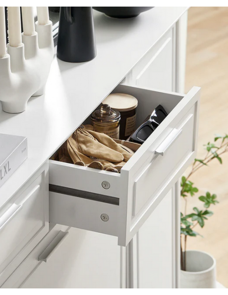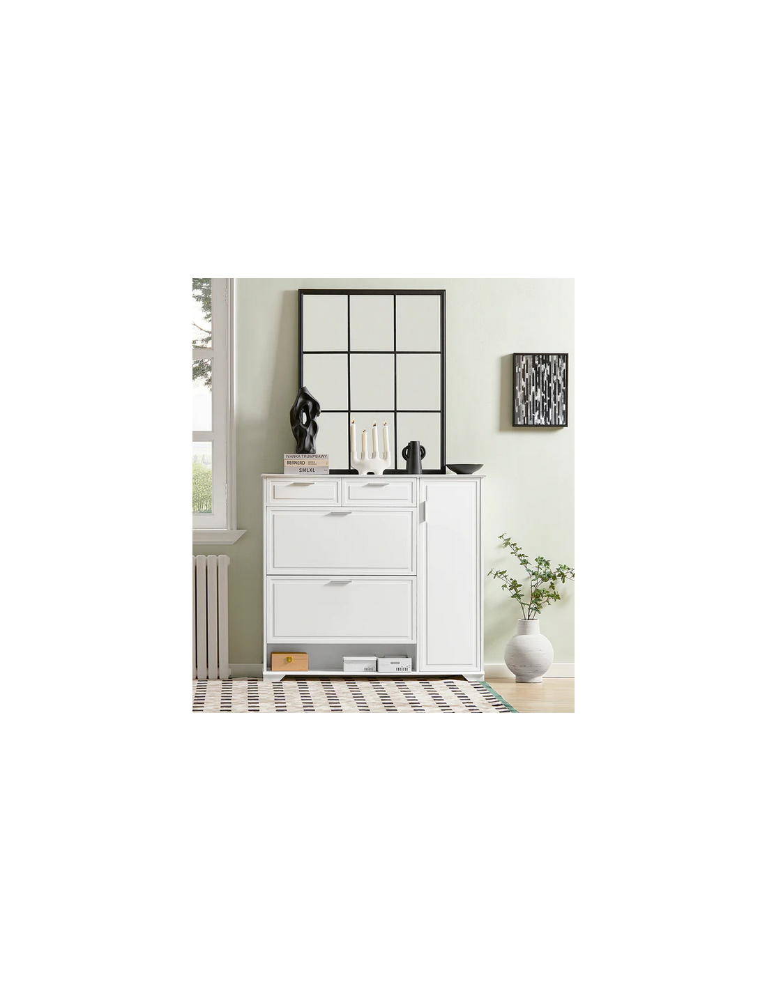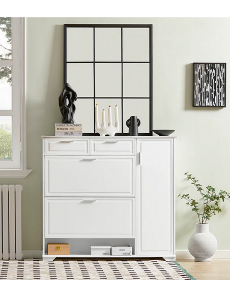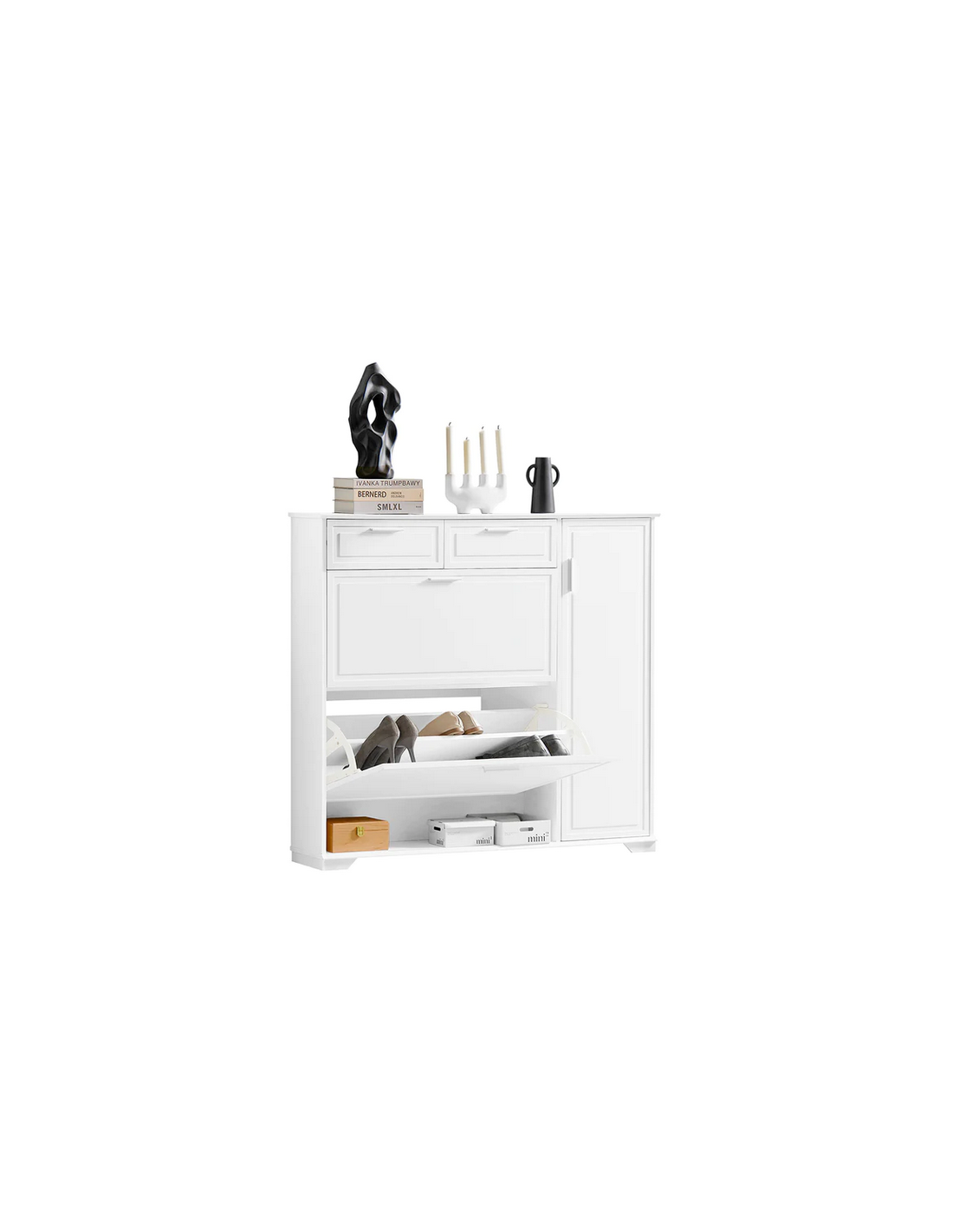 Skoskab udført i et design af hvid møbelplade. Skoskabet måler 111 cm i højden og 120 x 26 cm i bredde og dybde.