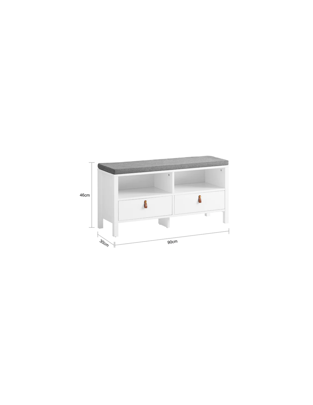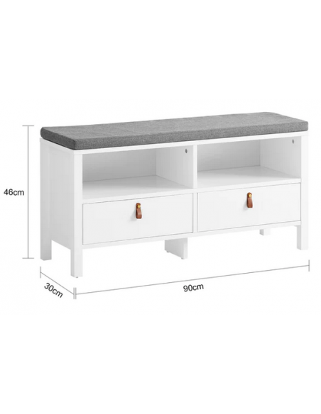 Skobænk med hynde, udført i et design af hvid mdf og grå polyester. Bænken måler 46 cm i højden og 90 x 30 cm i bredde og dybde.