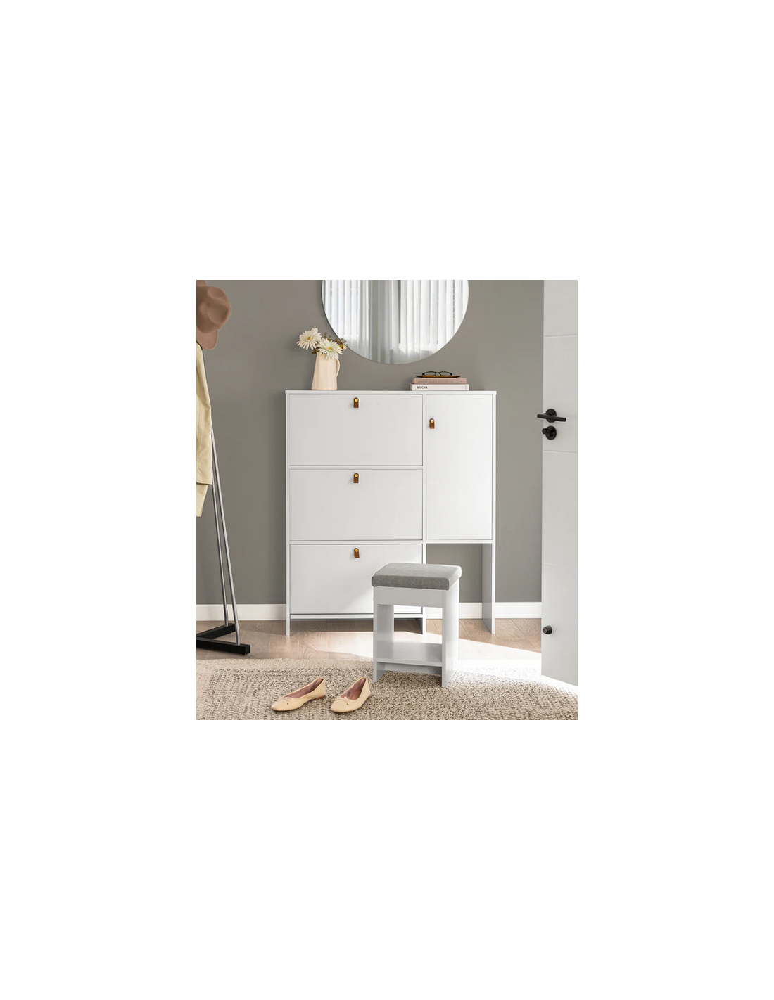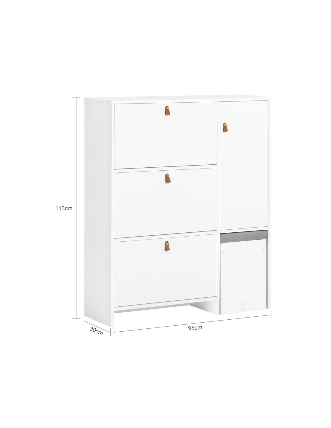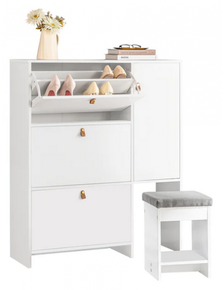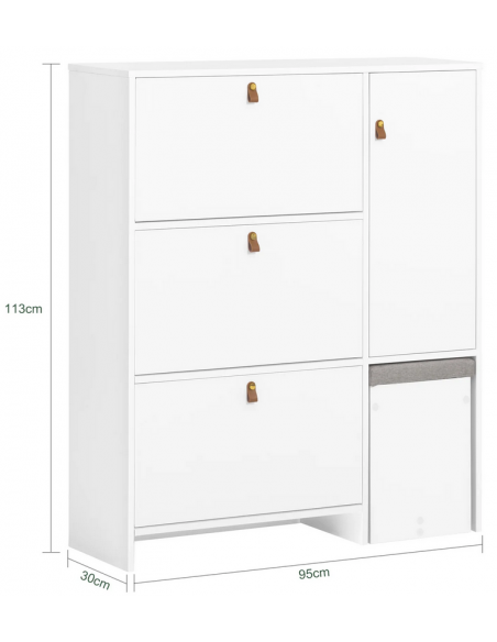 Skoskab udført i et design af hvid mdf. Skoskabet måler 113 cm i højden og 95 x 30 cm i bredde og dybde.