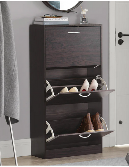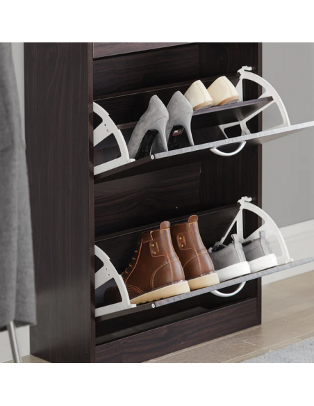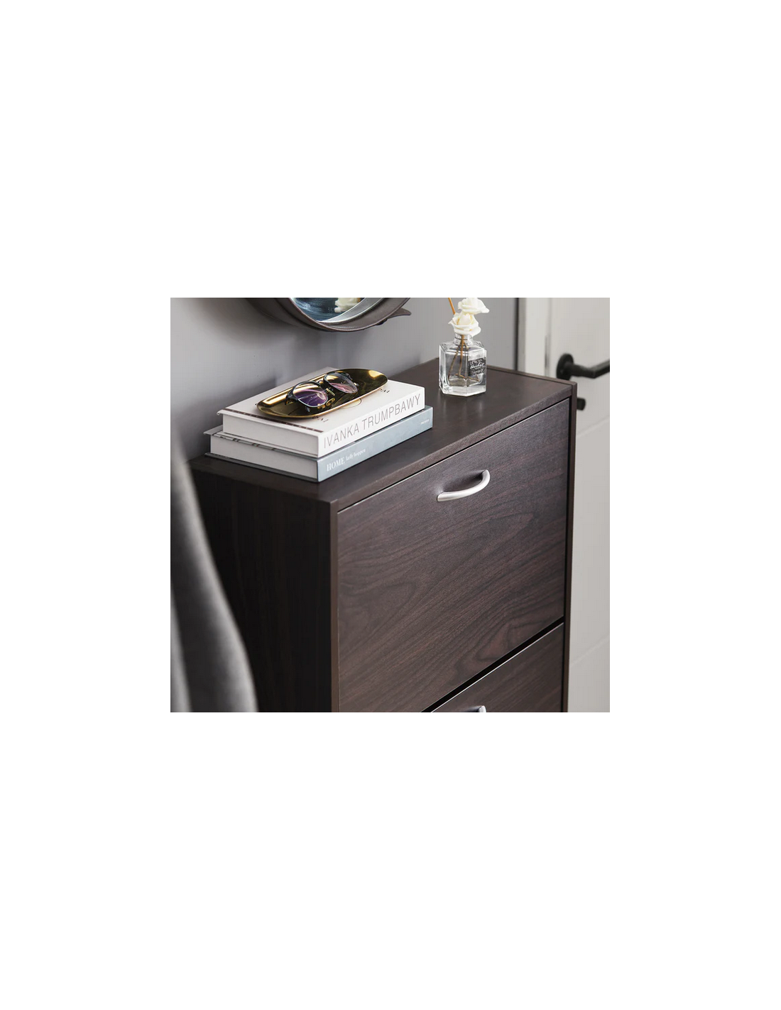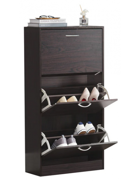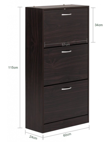 Skoskab udført i et design af brun møbelplade. Skoskabet måler 115 cm i højden og 60 x 24 cm i bredde og dybde.
