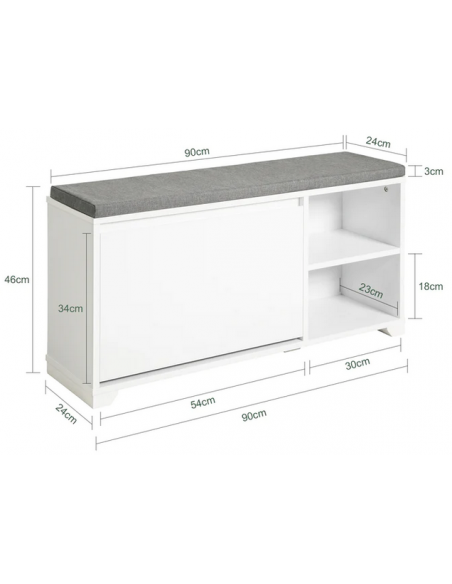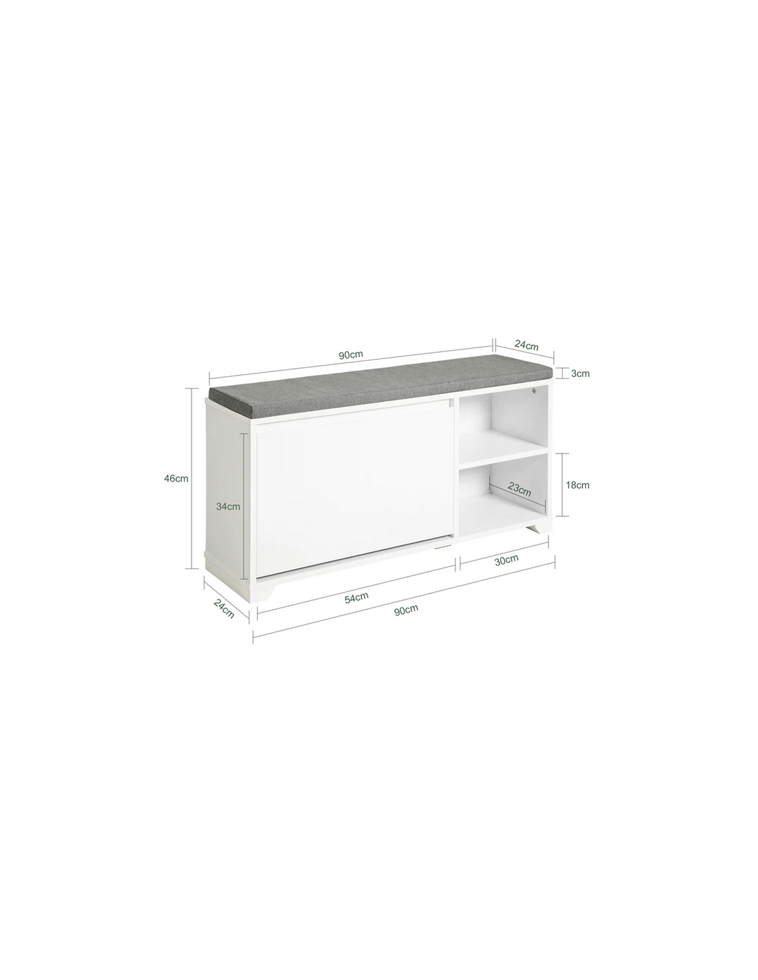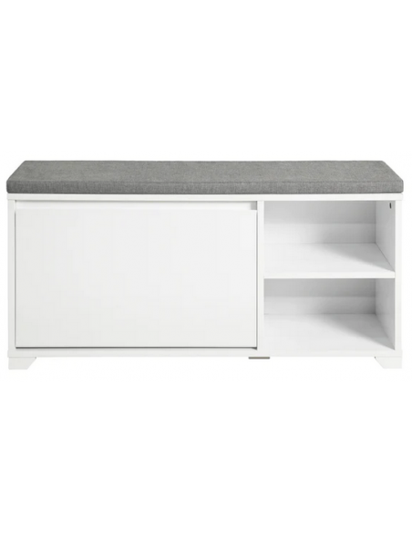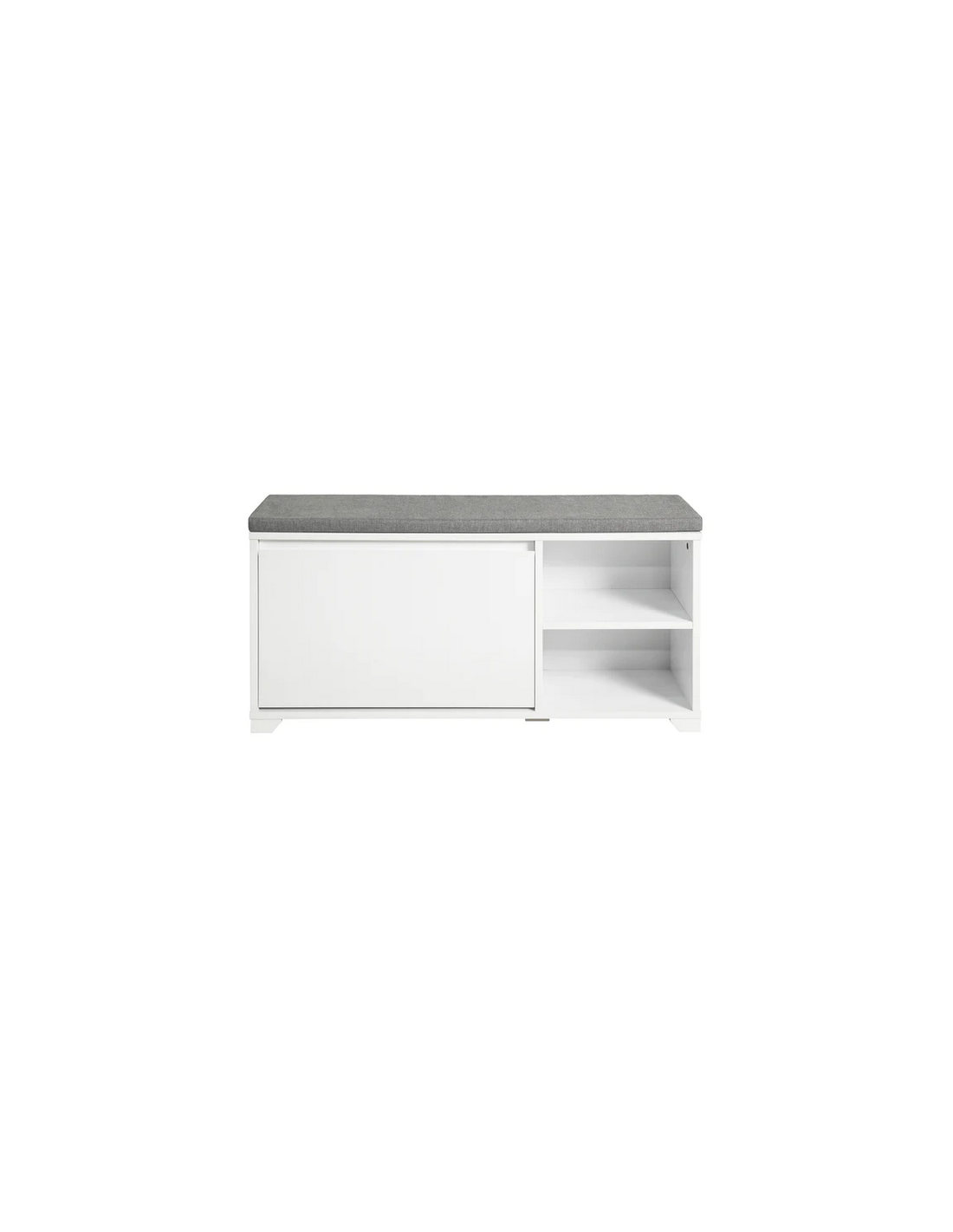 Skobænk med hynde, udført i et design af hvid møbelplade og grå polyester. Bænken måler 46 cm i højden og 90 x 24 cm i bredde og dybde.