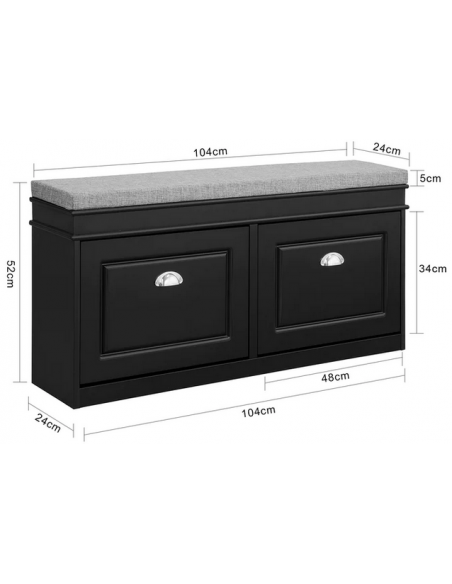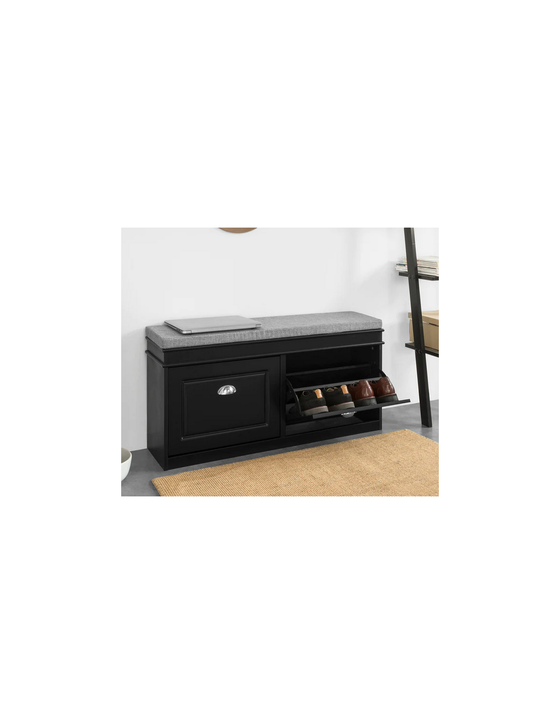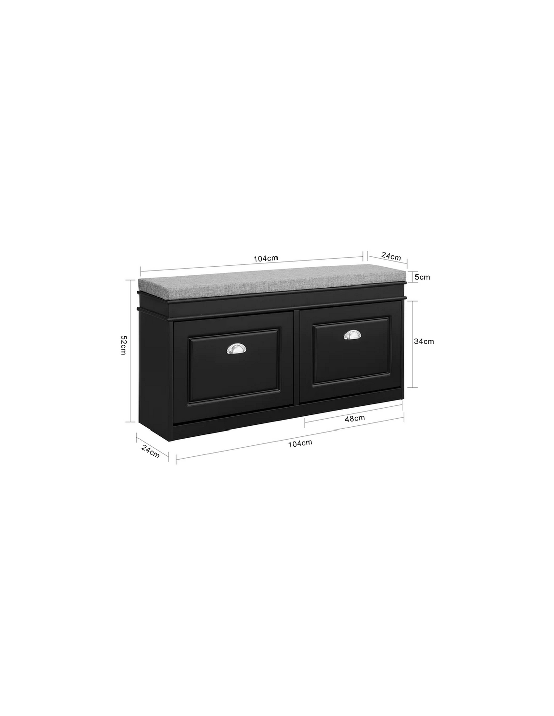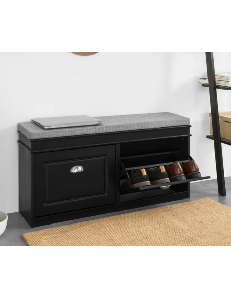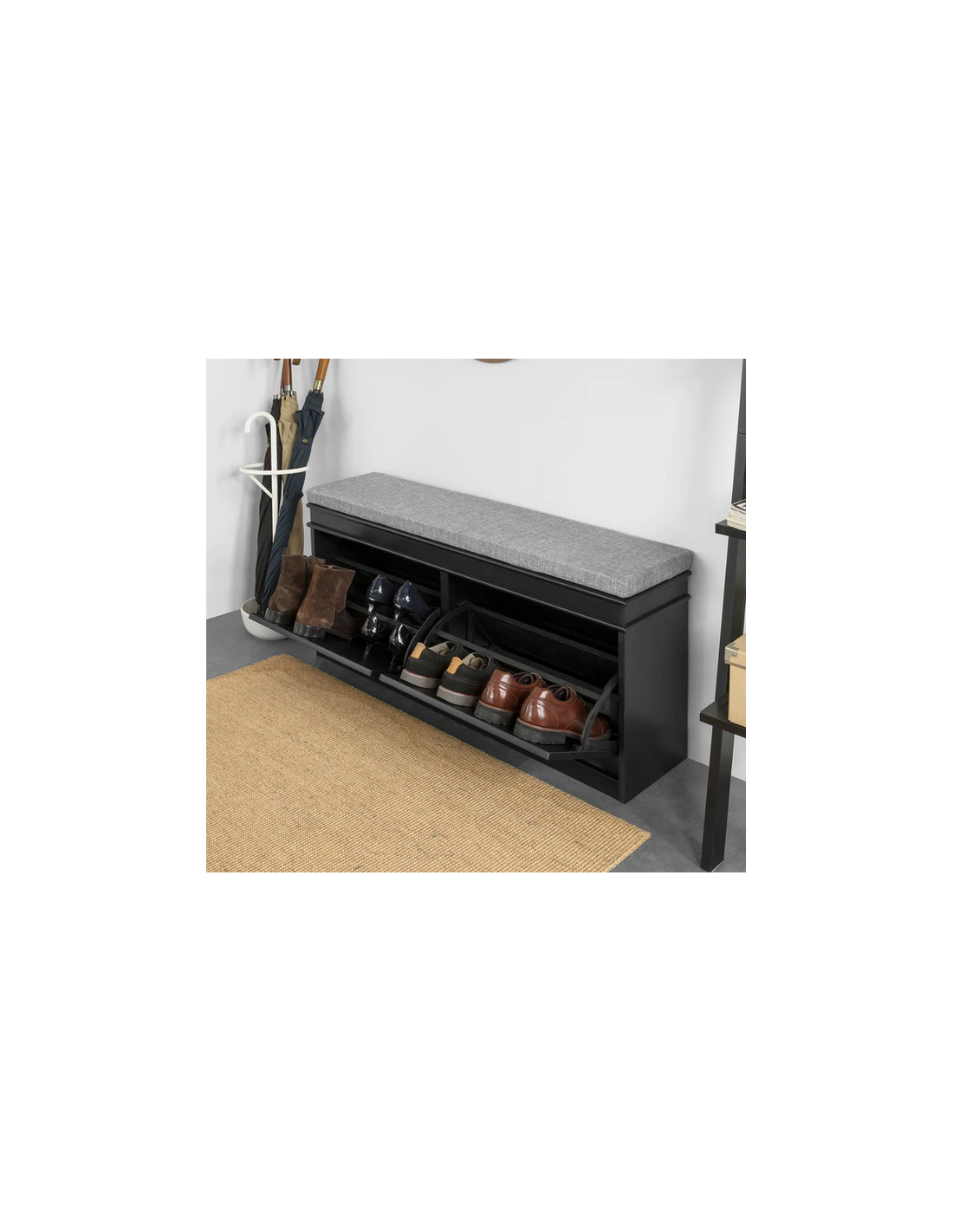 Skobænk med hynde, udført i et design af sort møbelplade og grå polyester. Bænken måler 52 cm i højden og 104 x 24 cm i bredde og dybde.