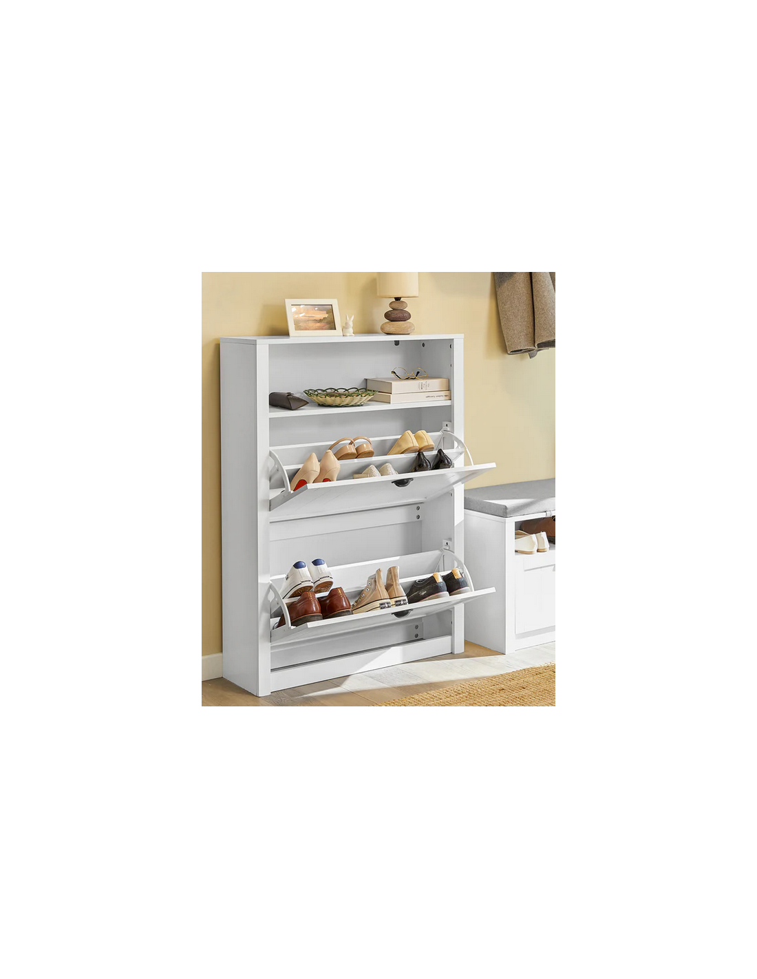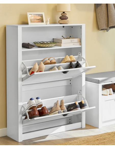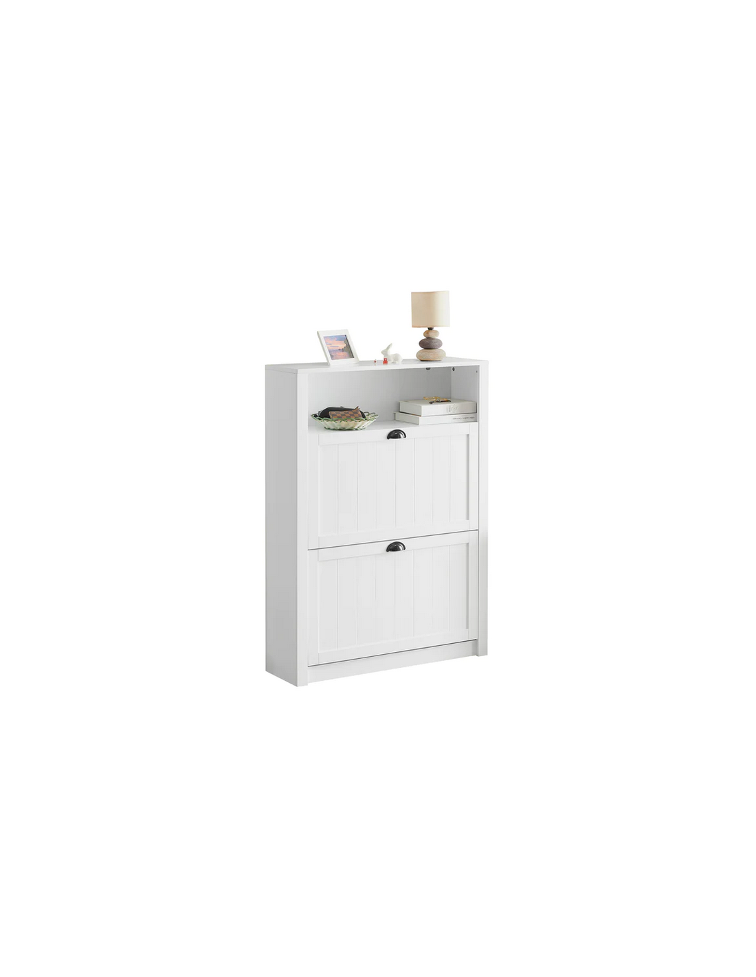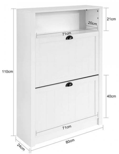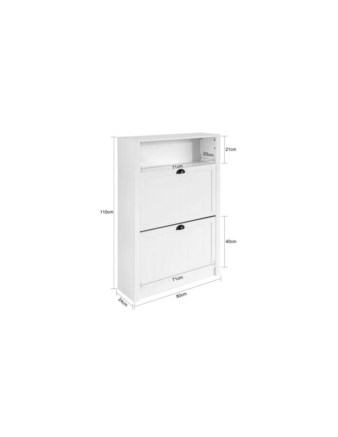 Skoskab udført i et design af hvid mdf. Skoskabet måler 110 cm i højden og 80 x 24 cm i bredde og dybde.