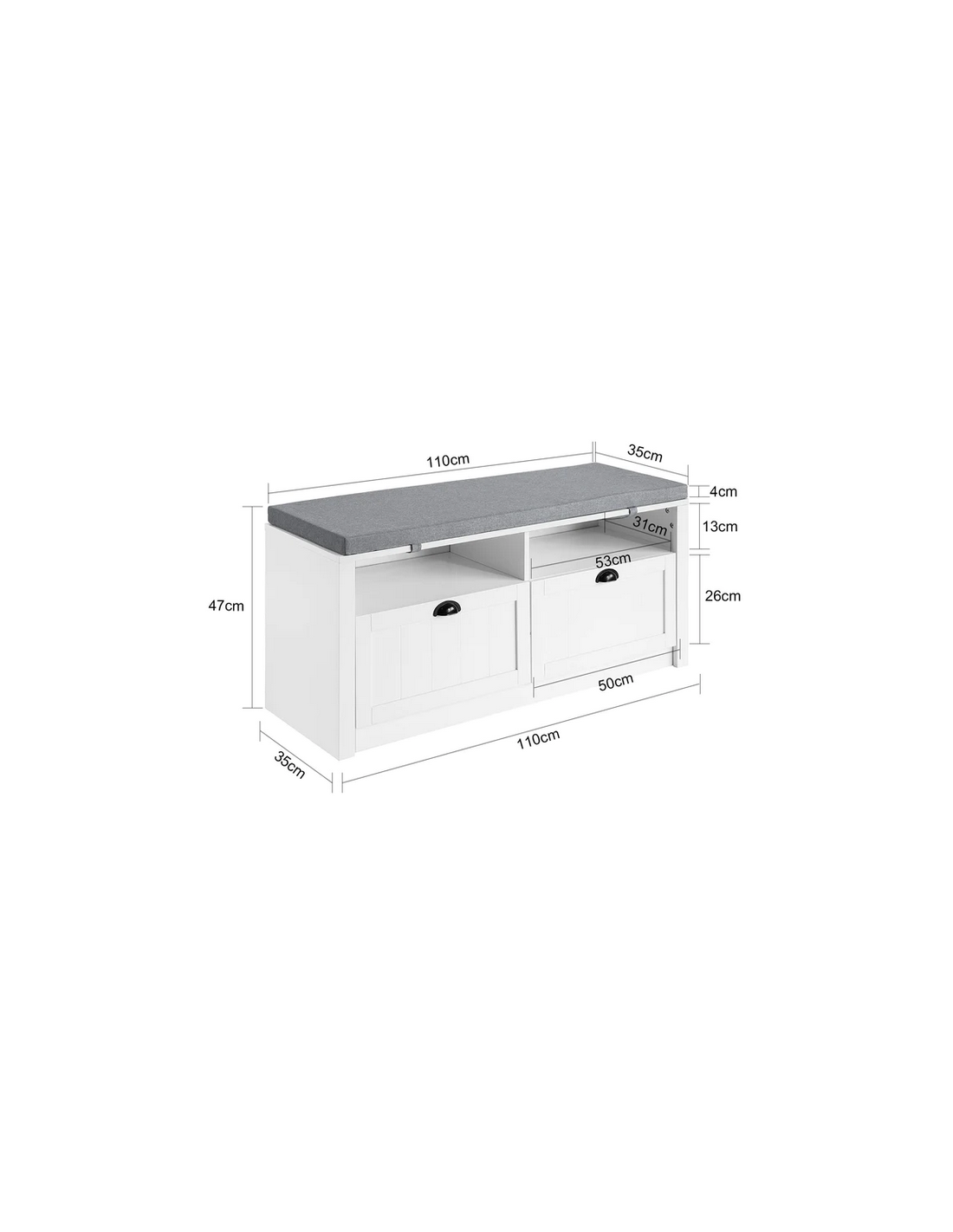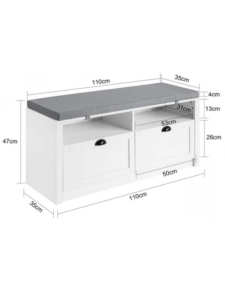 Skobænk med hynde, udført i et design af hvid mdf og grå polyester. Bænken måler 47 cm i højden og 110 x 35 cm i bredde og dybde.
