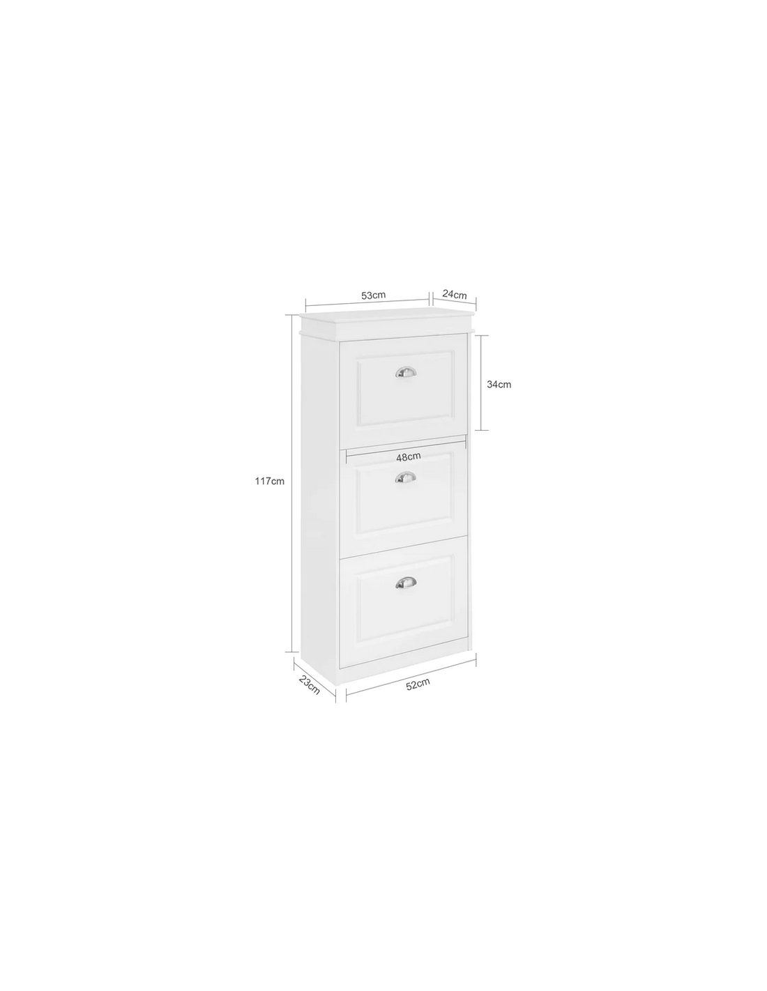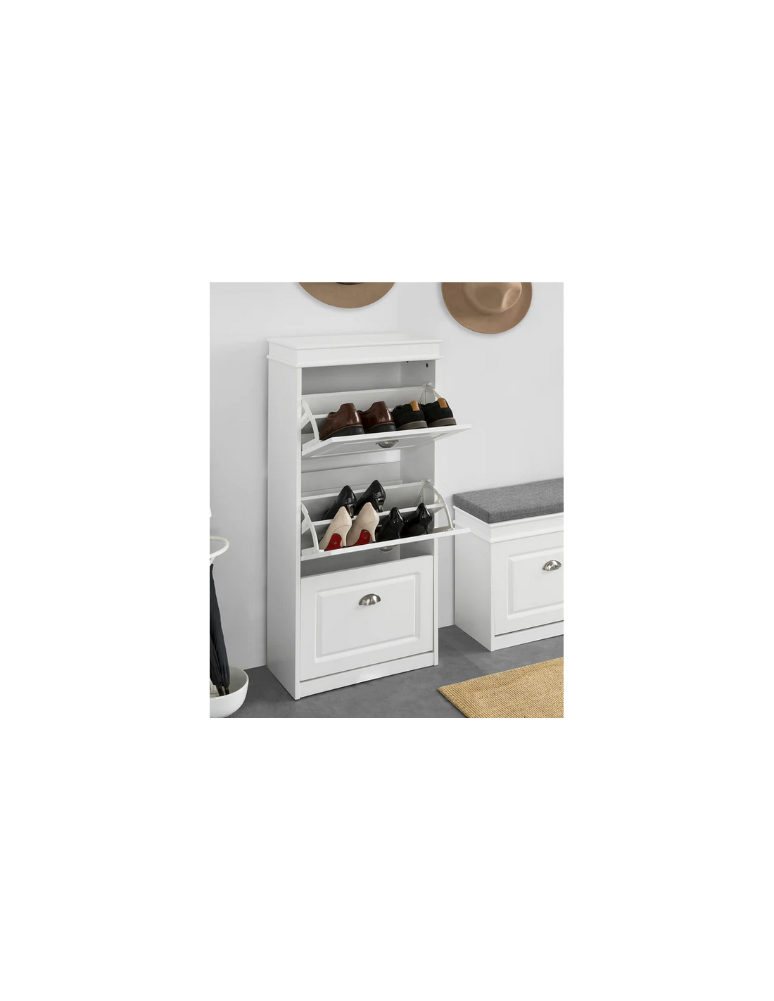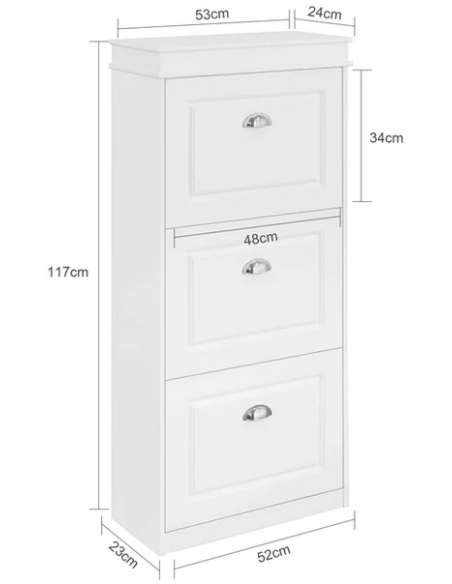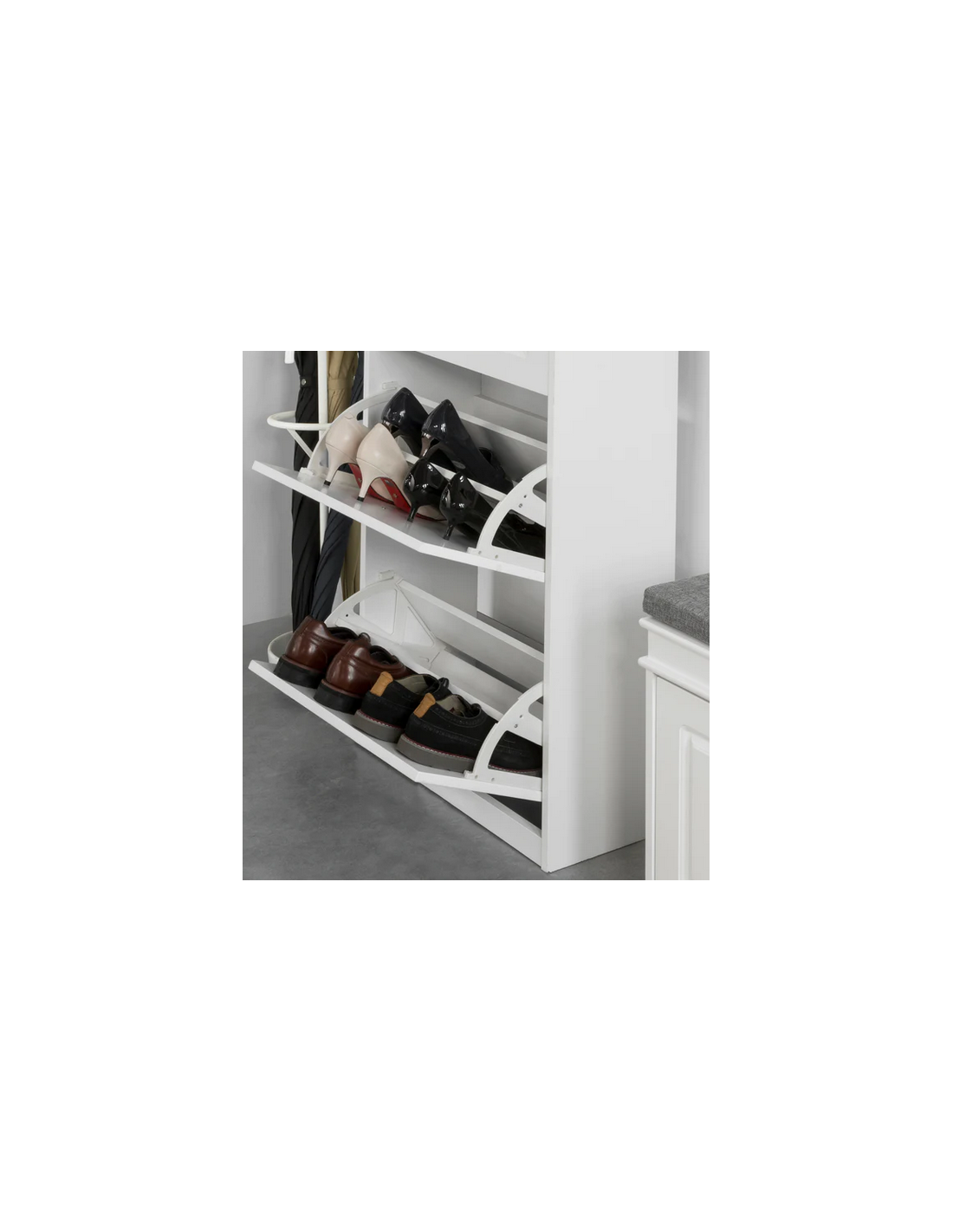 Skoskab udført i et design af hvid møbelplade. Skoskabet måler 117 cm i højden og 53 x 24 cm i bredde og dybde.