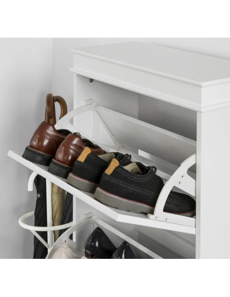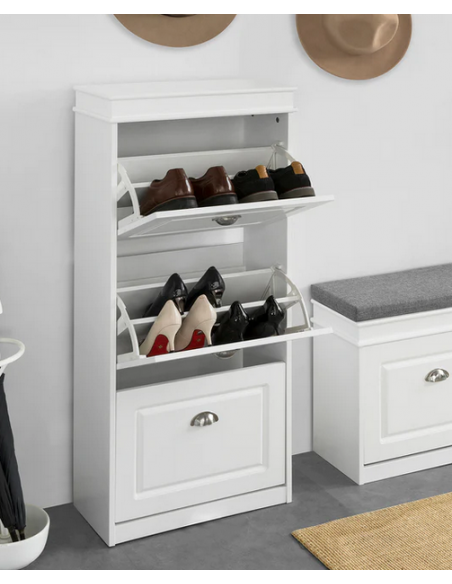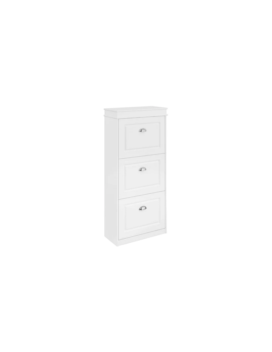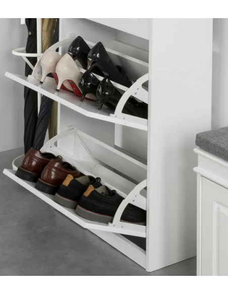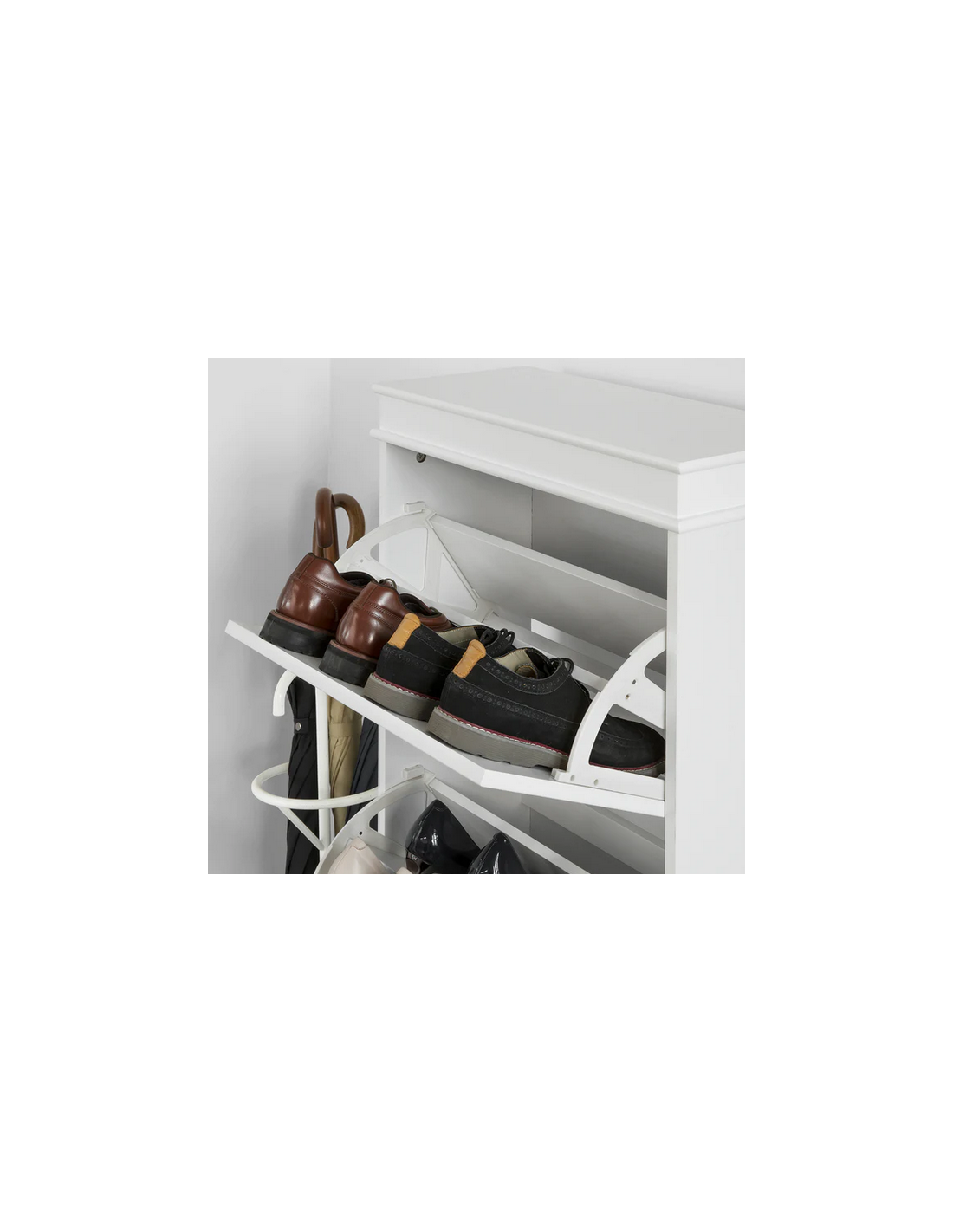 Skoskab udført i et design af hvid møbelplade. Skoskabet måler 117 cm i højden og 53 x 24 cm i bredde og dybde.
