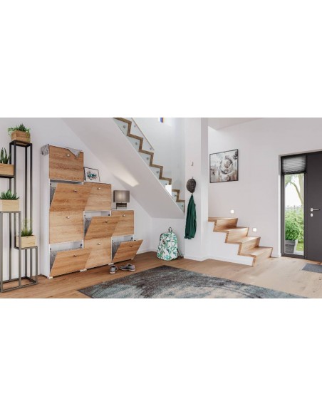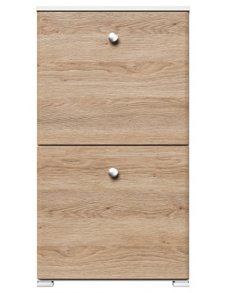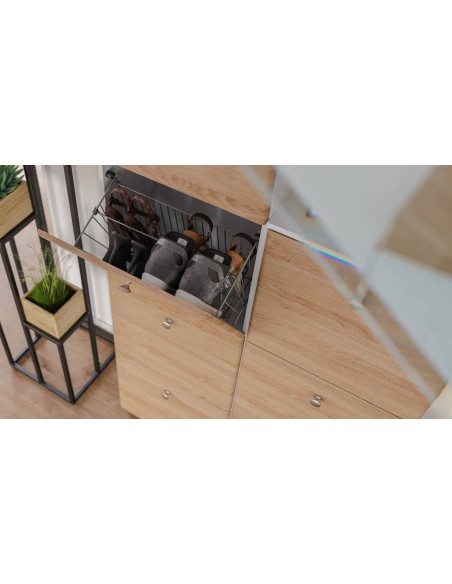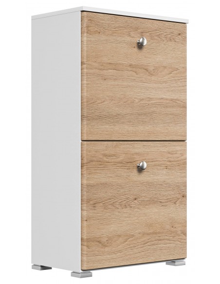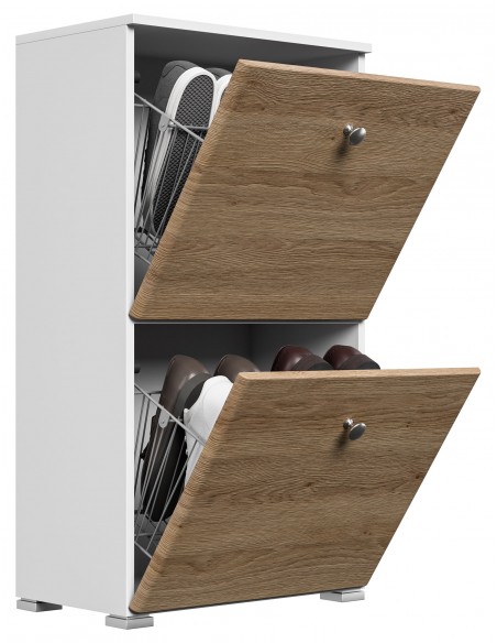 Skoskab udført i et design af mat hvid og egetræsfarvet mdf og møbelplade. Skoskabet måler 95,7 cm i højden og 52,4 x 31,6 cm i bredde og dybde.