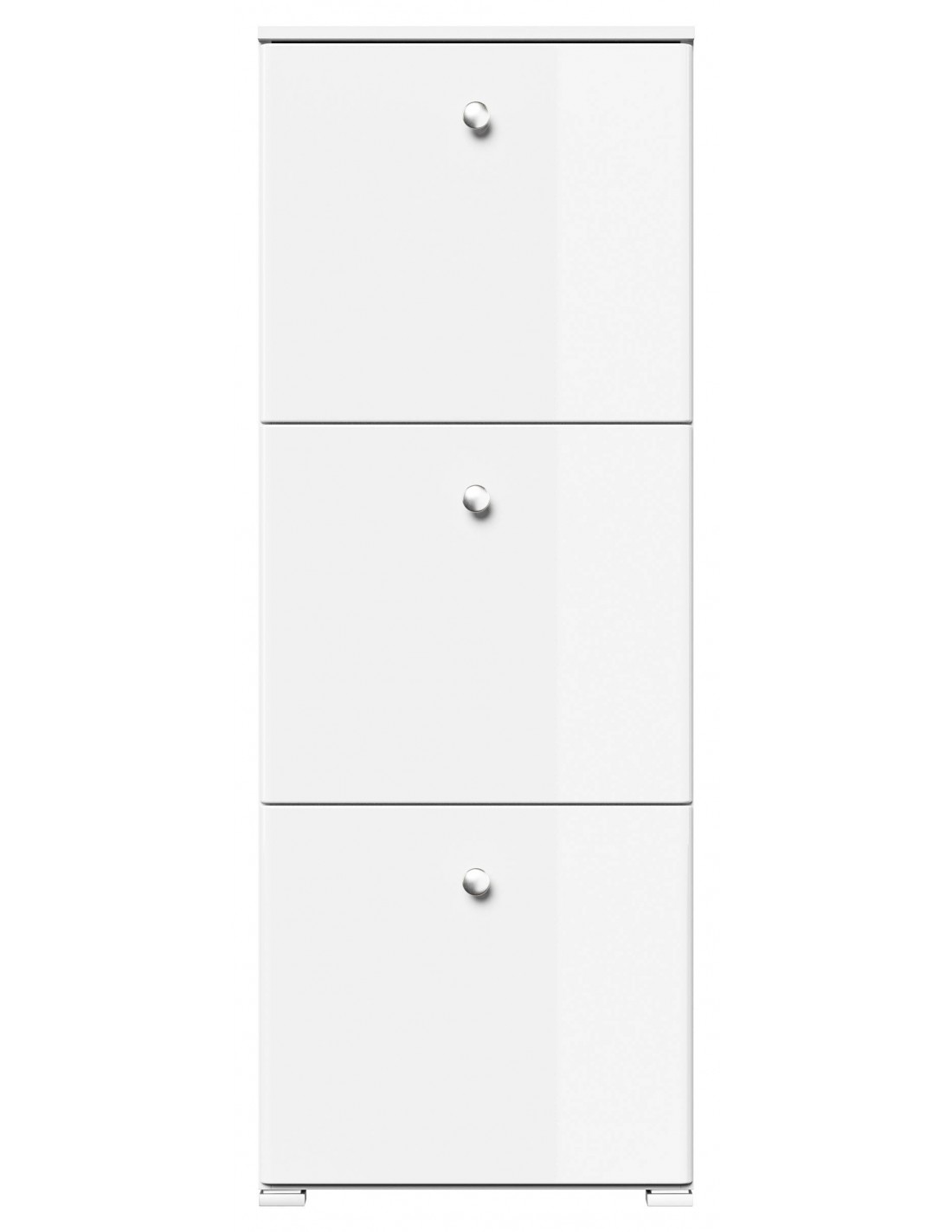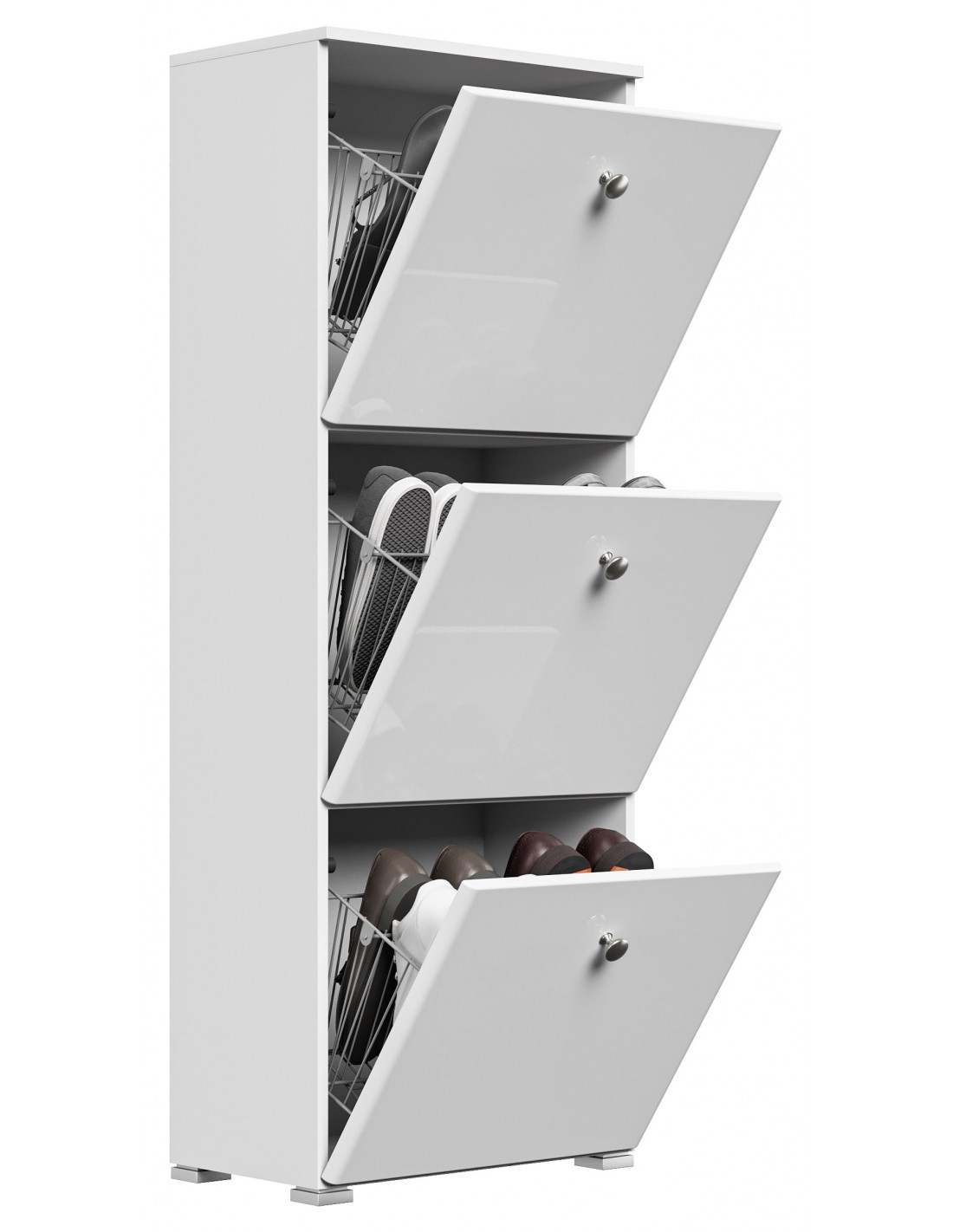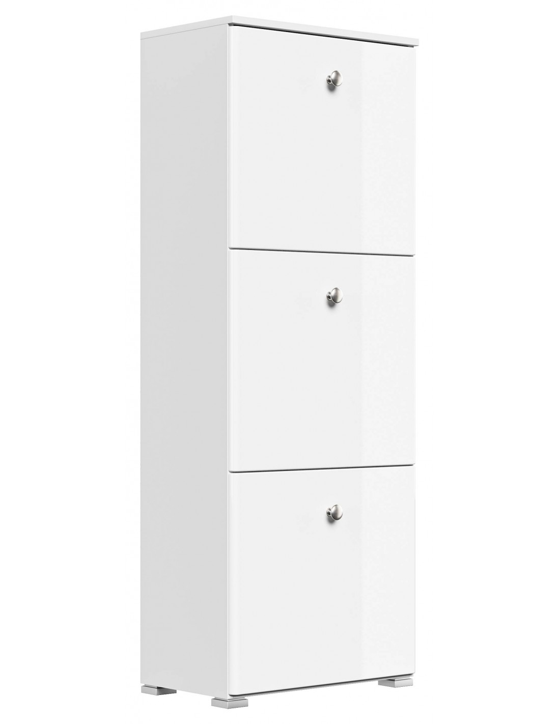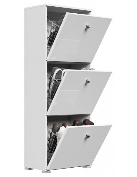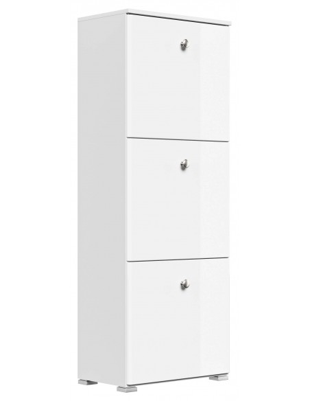 Skoskab udført i et design af mat hvid og hvid højglans mdf og møbelplade. Skoskabet måler 141,5 cm i højden og 52,4 x 31,6 cm i bredde og dybde.