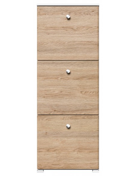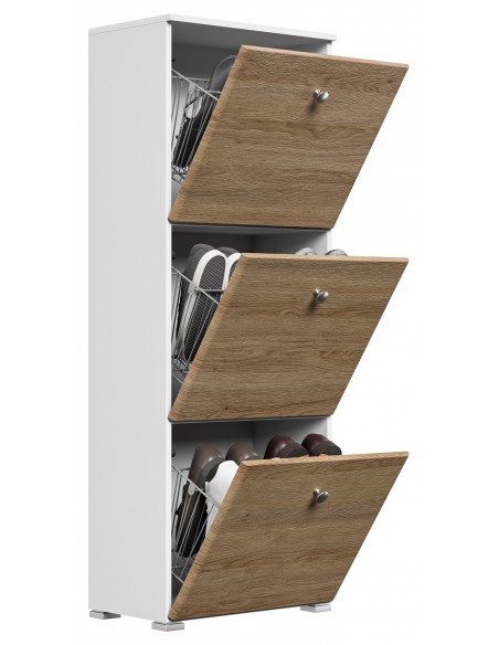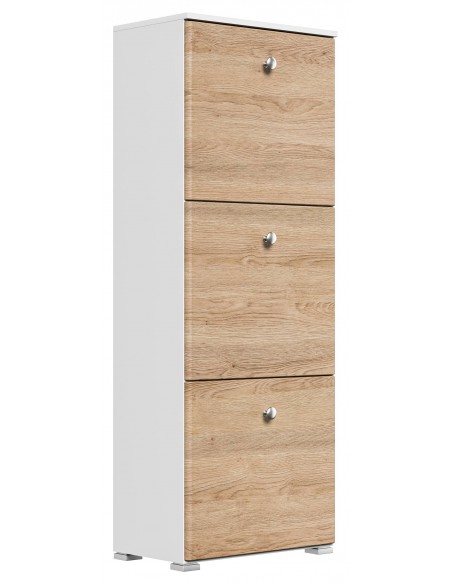 Skoskab udført i et design af mat hvid og egetræsfarvet mdf og møbelplade. Skoskabet måler 141,5 cm i højden og 52,4 x 31,6 cm i bredde og dybde.