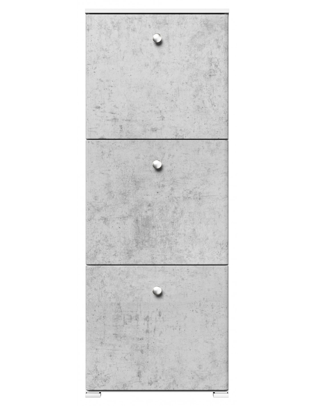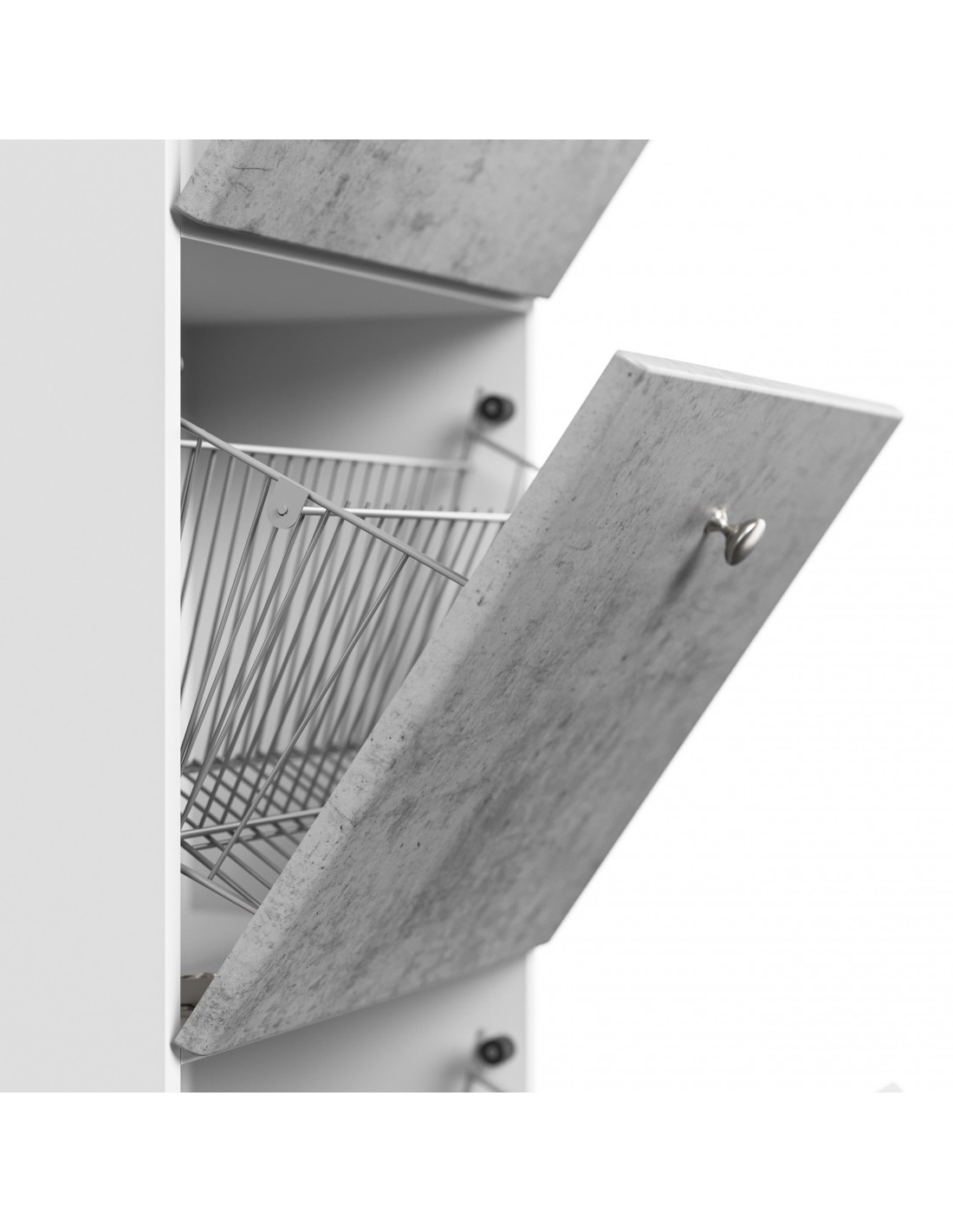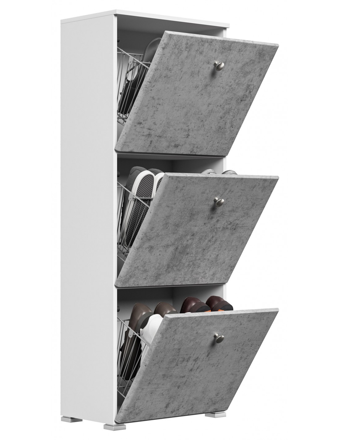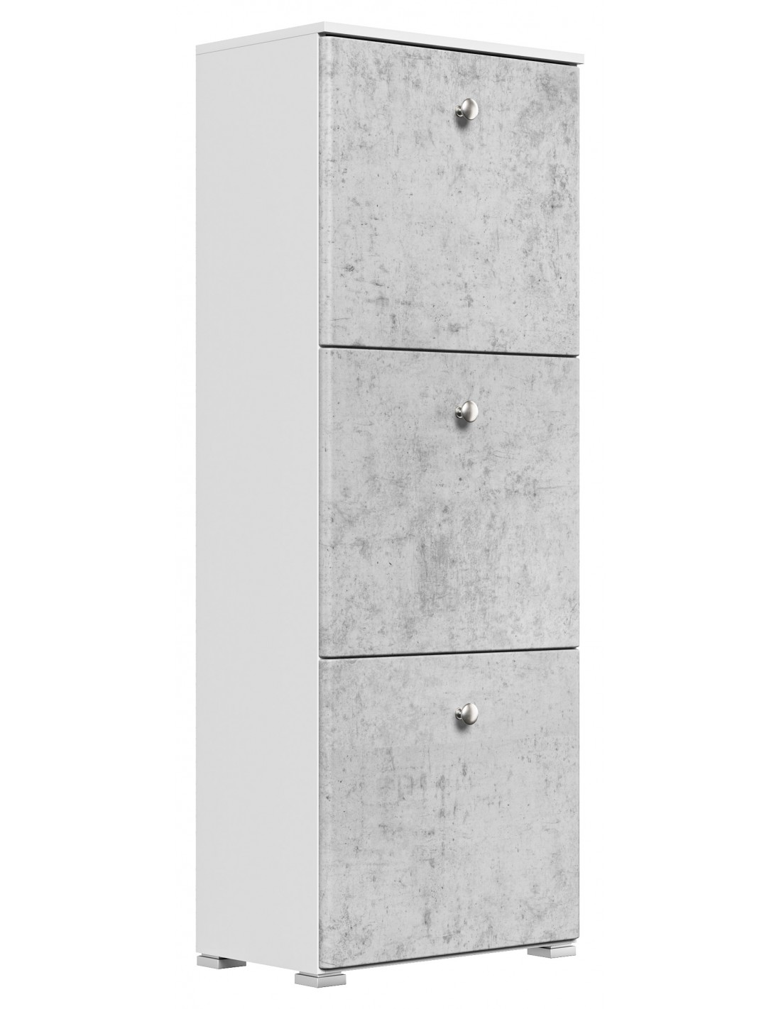 Skoskab udført i et design af mat hvid og betongrå mdf og møbelplade. Skoskabet måler 141,5 cm i højden og 52,4 x 31,6 cm i bredde og dybde.